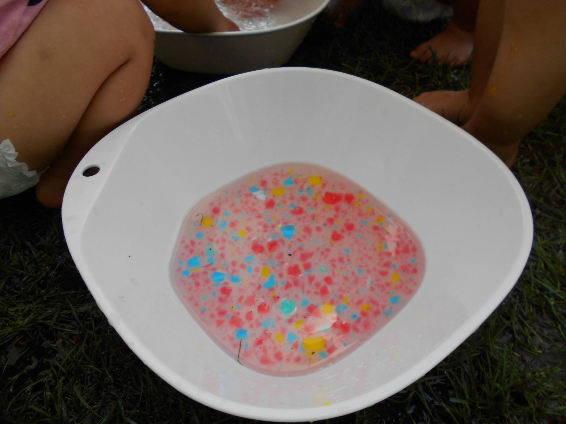 しばらく遊ぶと、ゼラチンが溶けてなくなり、色水になってきました。
