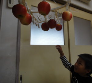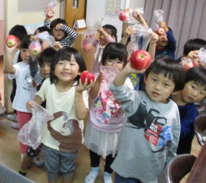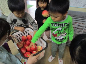 4.3歳児さんは、地域の方が届けてくださった「シナノピコッロ」というりんごと一緒に・・・