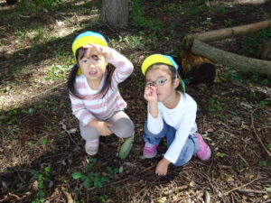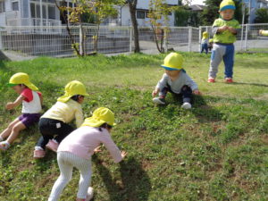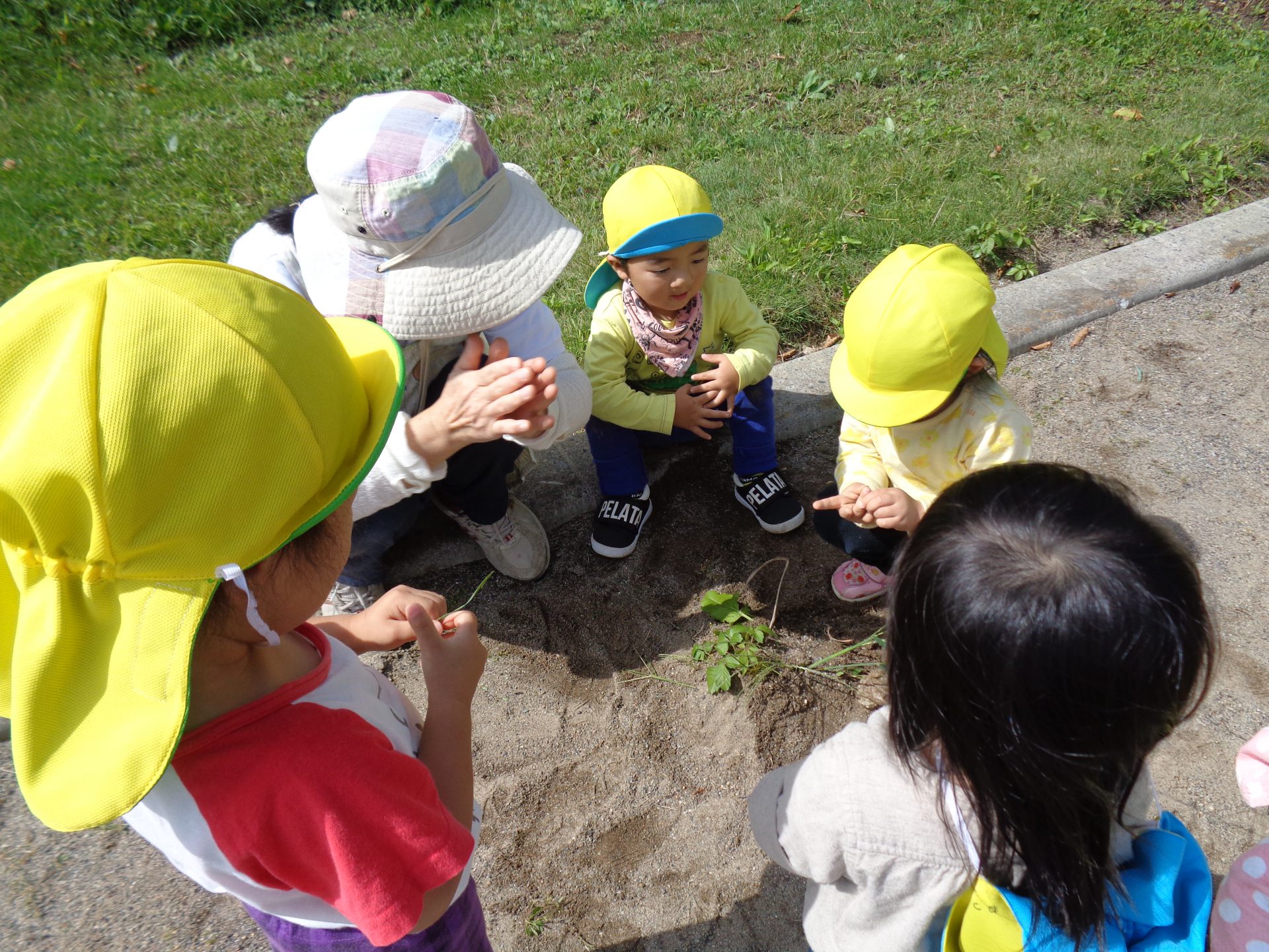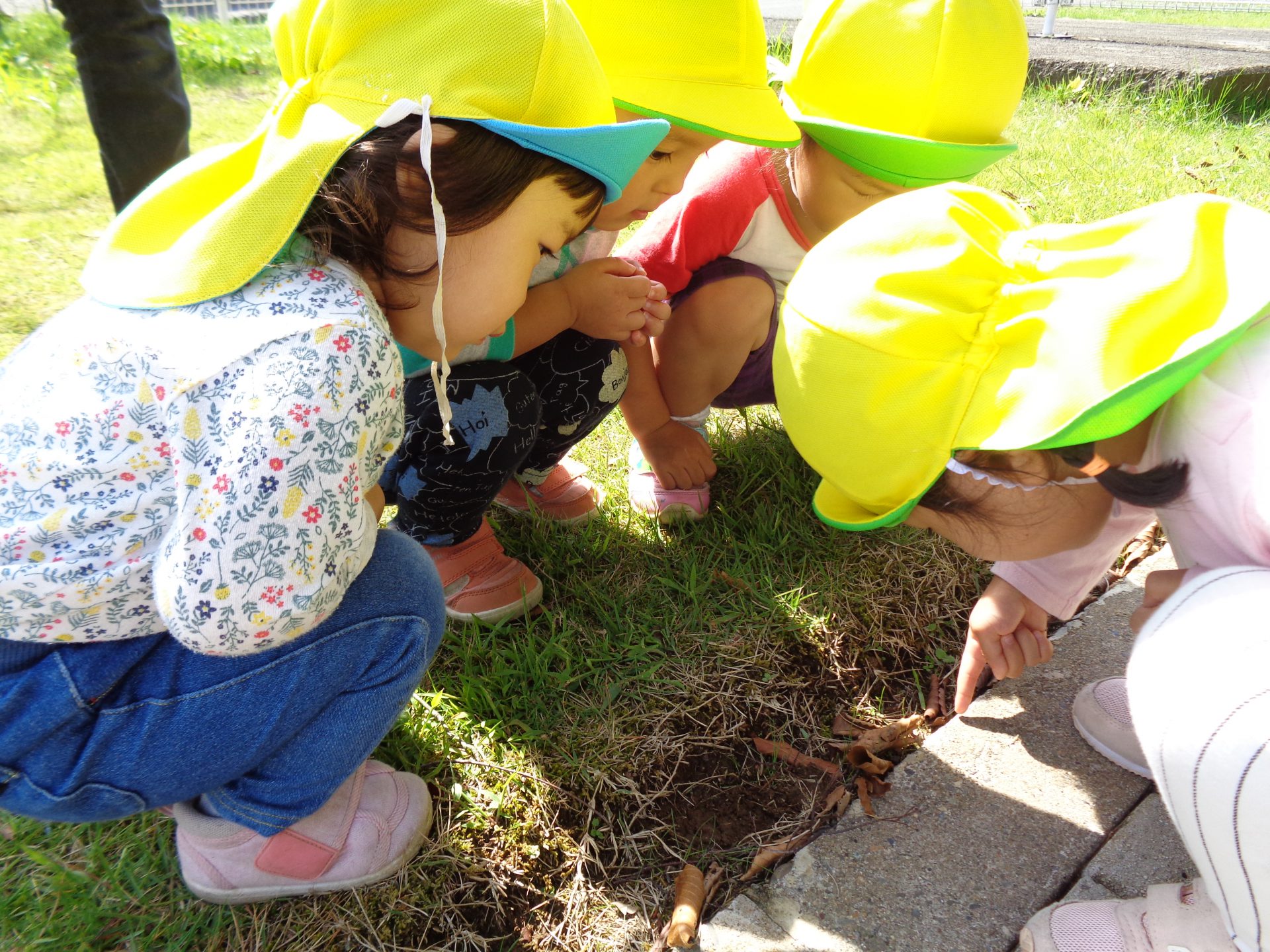 まだまだ暑い日が続いた9月。段々と過ごしやすい季節に変わってきています。その季節の変化の中で少しづつ秋を感じている子どもたち。蝉を見つけたときは、「せみさん元気ないね。」「もう寒くなってきたから、死んじゃうのかな。」と心配する声も。夏にはあんなに元気に鳴いていた蝉も、秋になるともう元気に鳴くことも、飛ぶこともできません。一人一人感じ方はそれぞれですが、生き物の命に触れたような、そんなひと時でした。