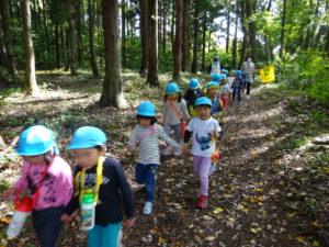 先日の運動会でやったパラバルーンや、年長さんの組体操の曲を、みんなで歌いながら林の中をずんずん歩きます。