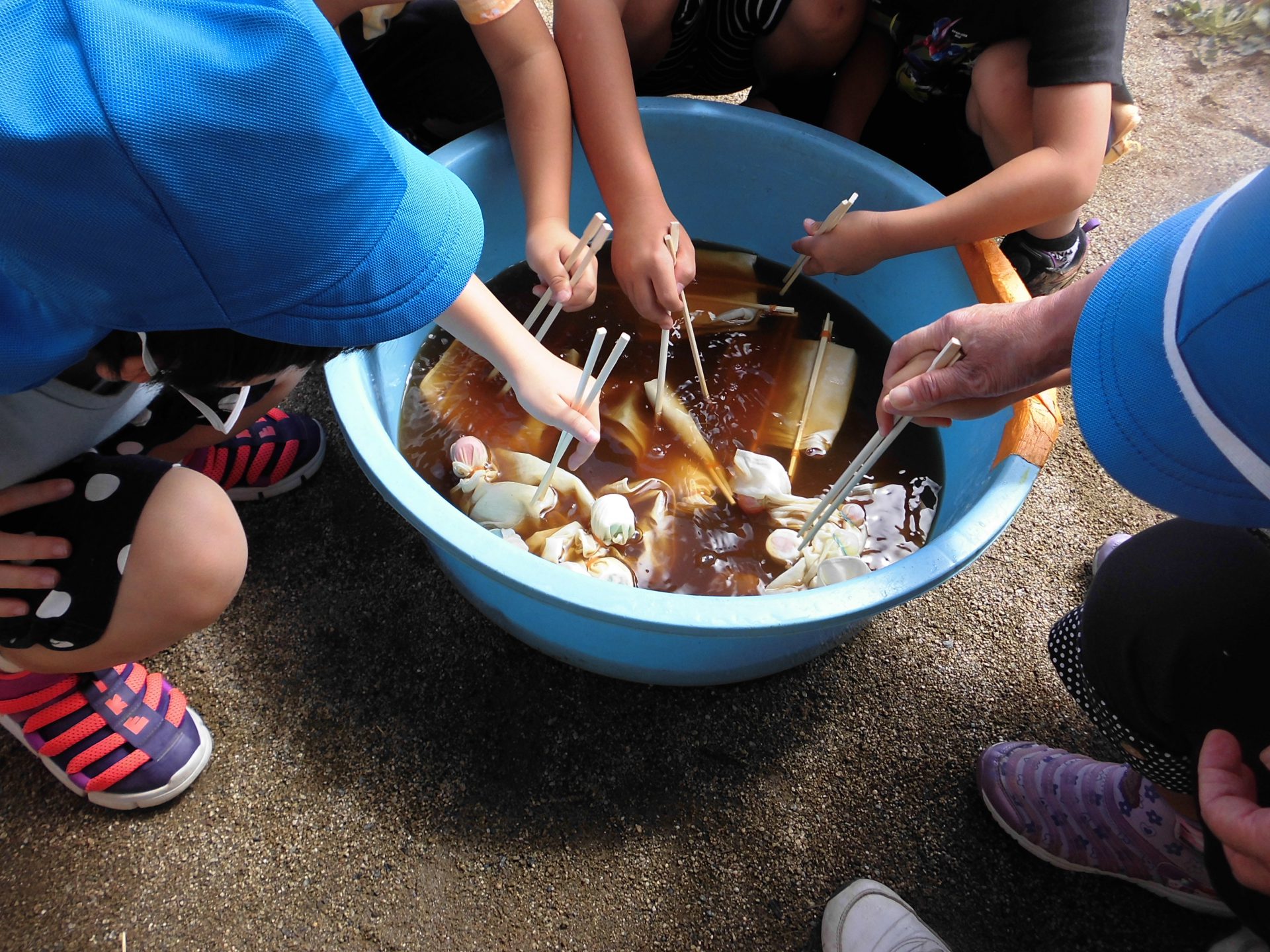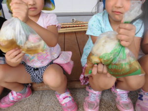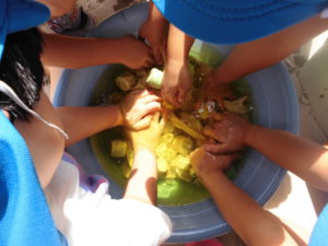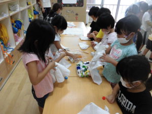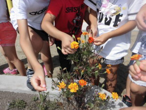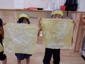 たくさん色水で遊んだあと、今度はマリーゴールドを使ってバンダナをみんなで染めてみることにしました。