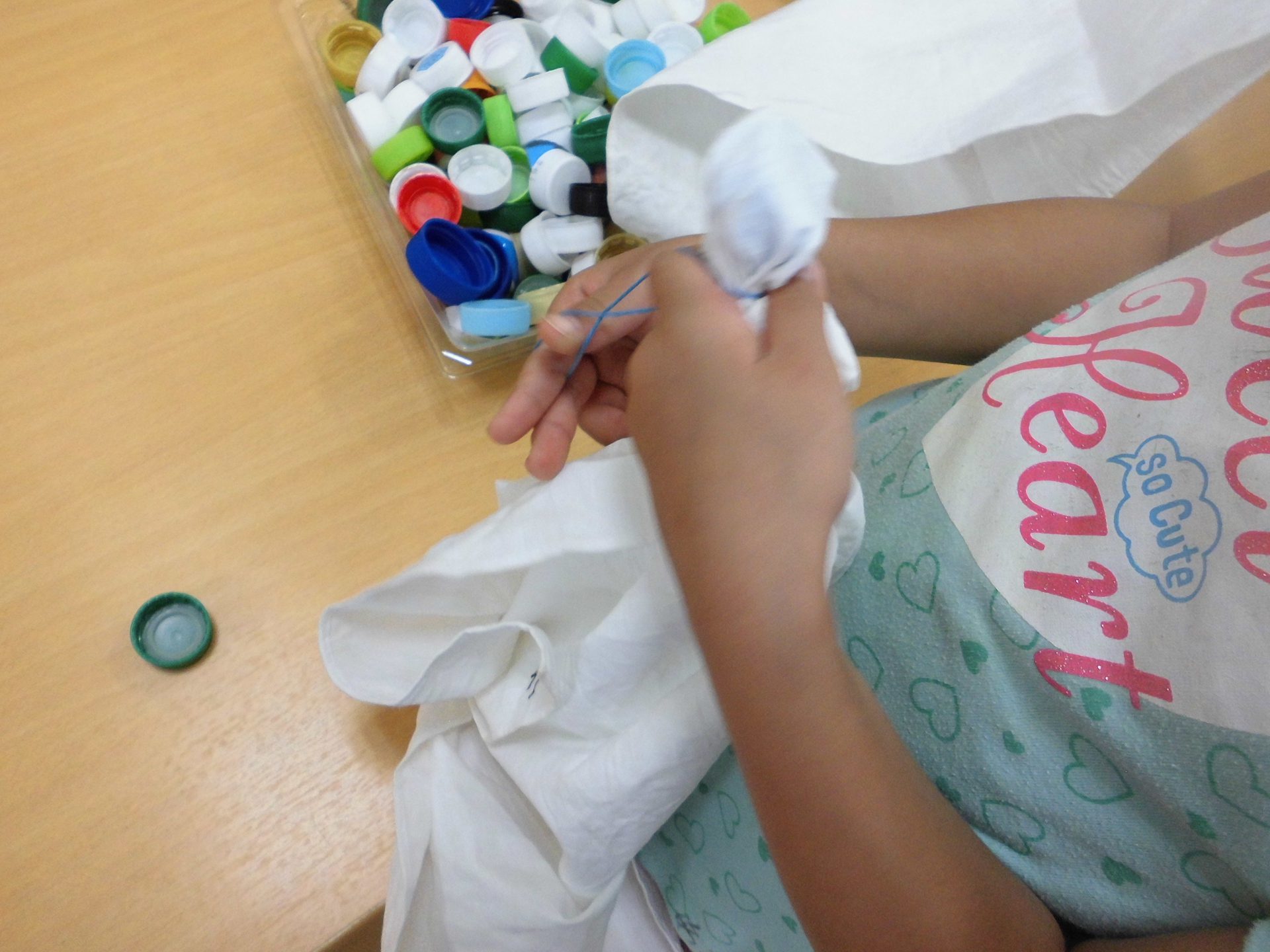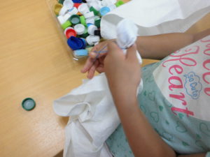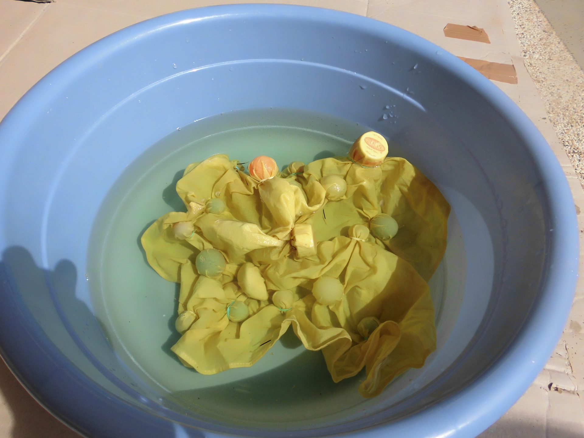 豆乳に浸して乾かしたバンダナにペットボトルのふたやスーパーボールを輪ゴムで止めたり、