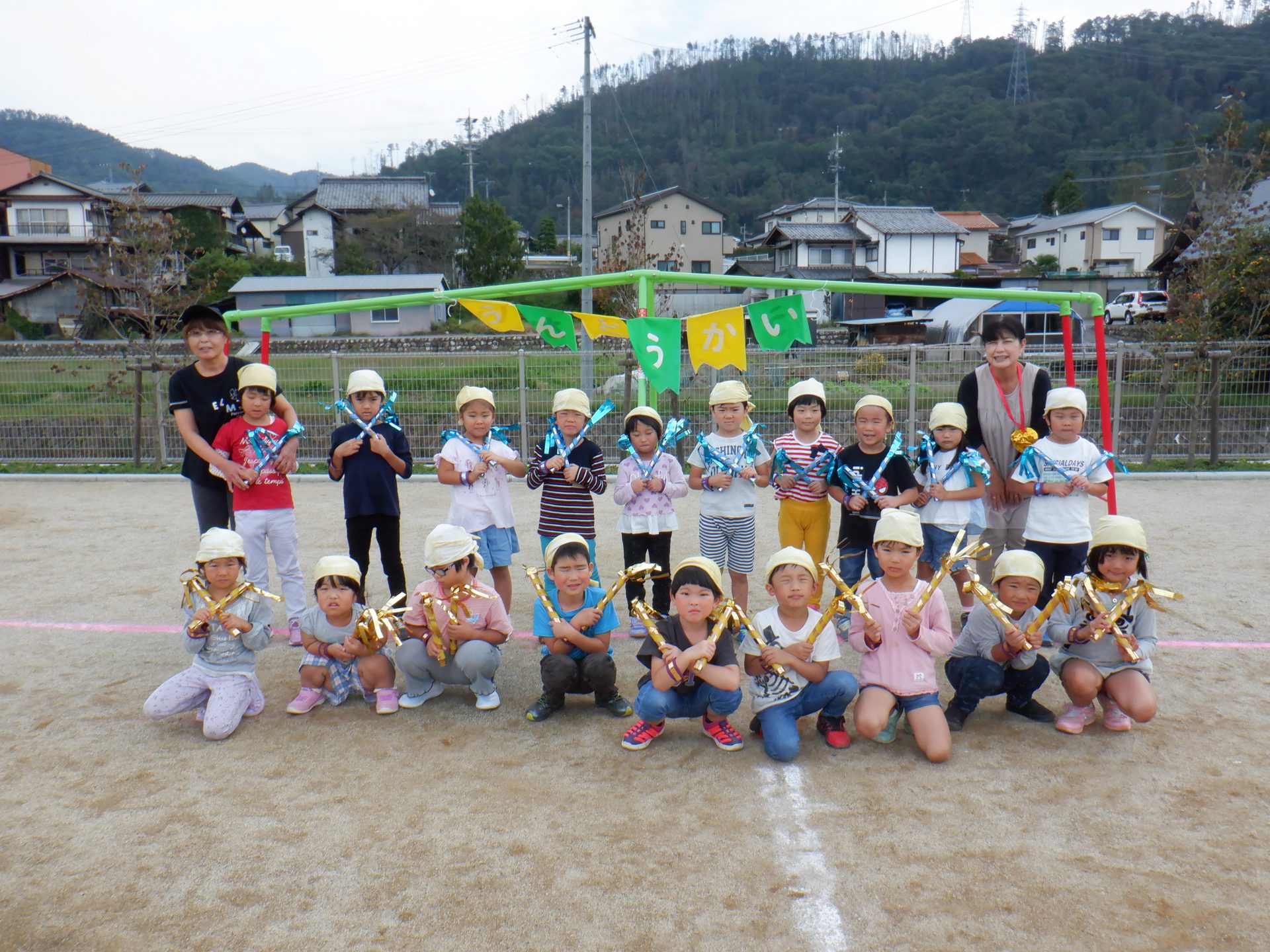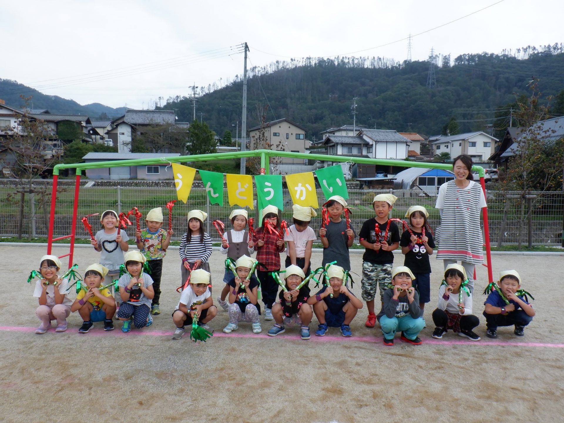自分達で染めた特別なバンダナは、運動会のリズムの衣装として使用しました。