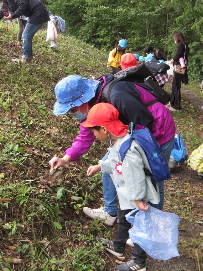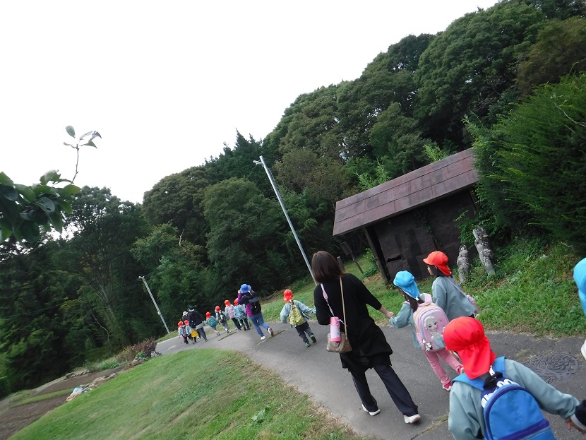 保育参加のお父さん、お母さん先生と一緒にどんぐり拾いに行きました。昨年、沢山どんぐりが拾えた秘密の場所です。