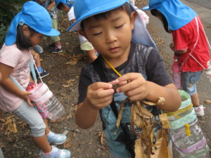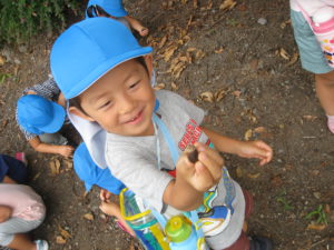 目を輝かせながら「どんぐり見つけた!」と次々に秋の自然物を発見し、大切にお散歩バックの中へ。