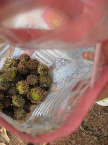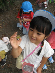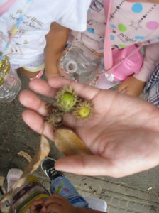 まだ緑色をしたどんぐりを見つけ、大興奮の子どもたち!