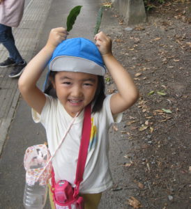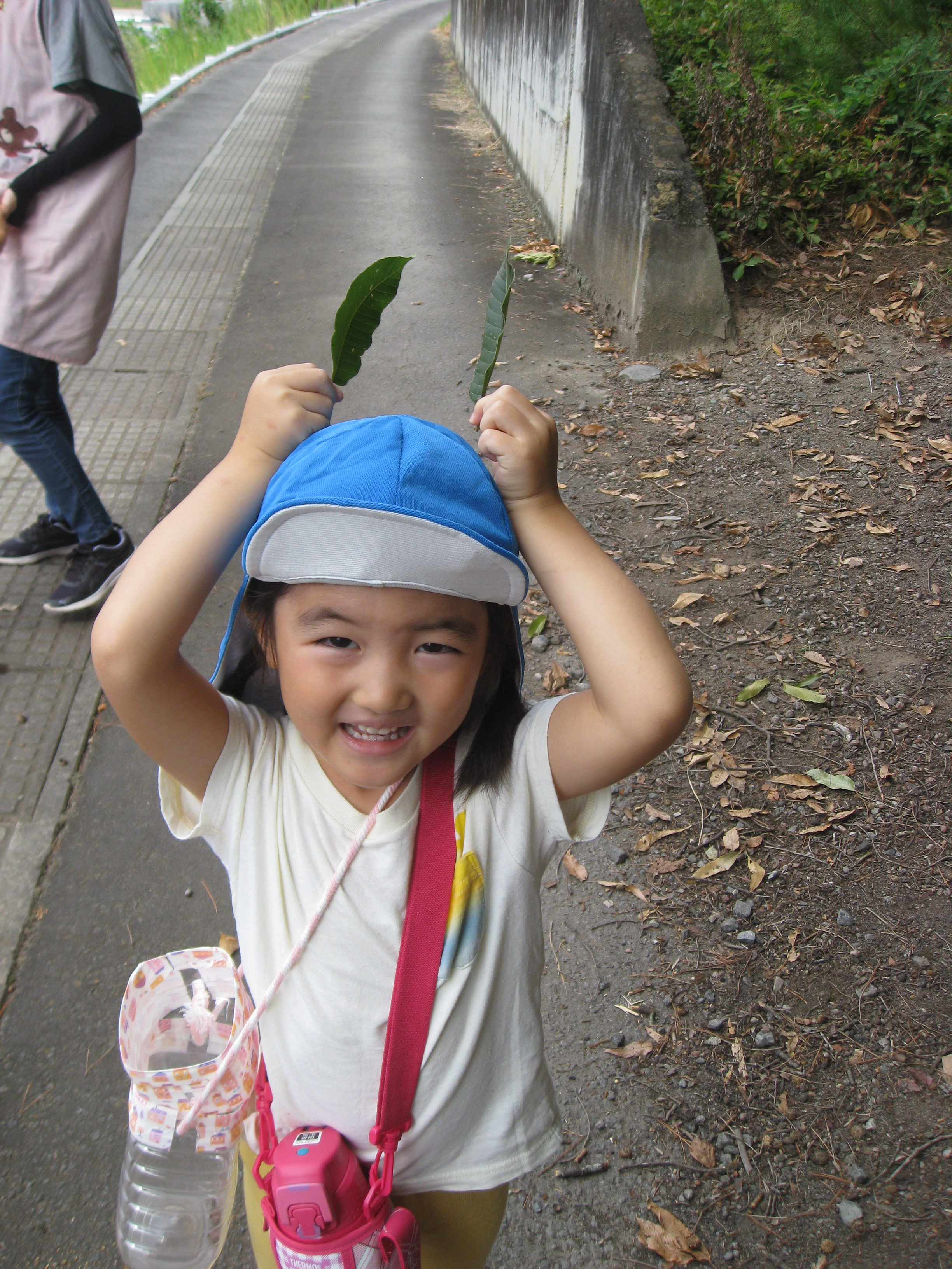 葉っぱ2枚を頭の上に乗せ「見て見てうさぎさんみたいでしょ」