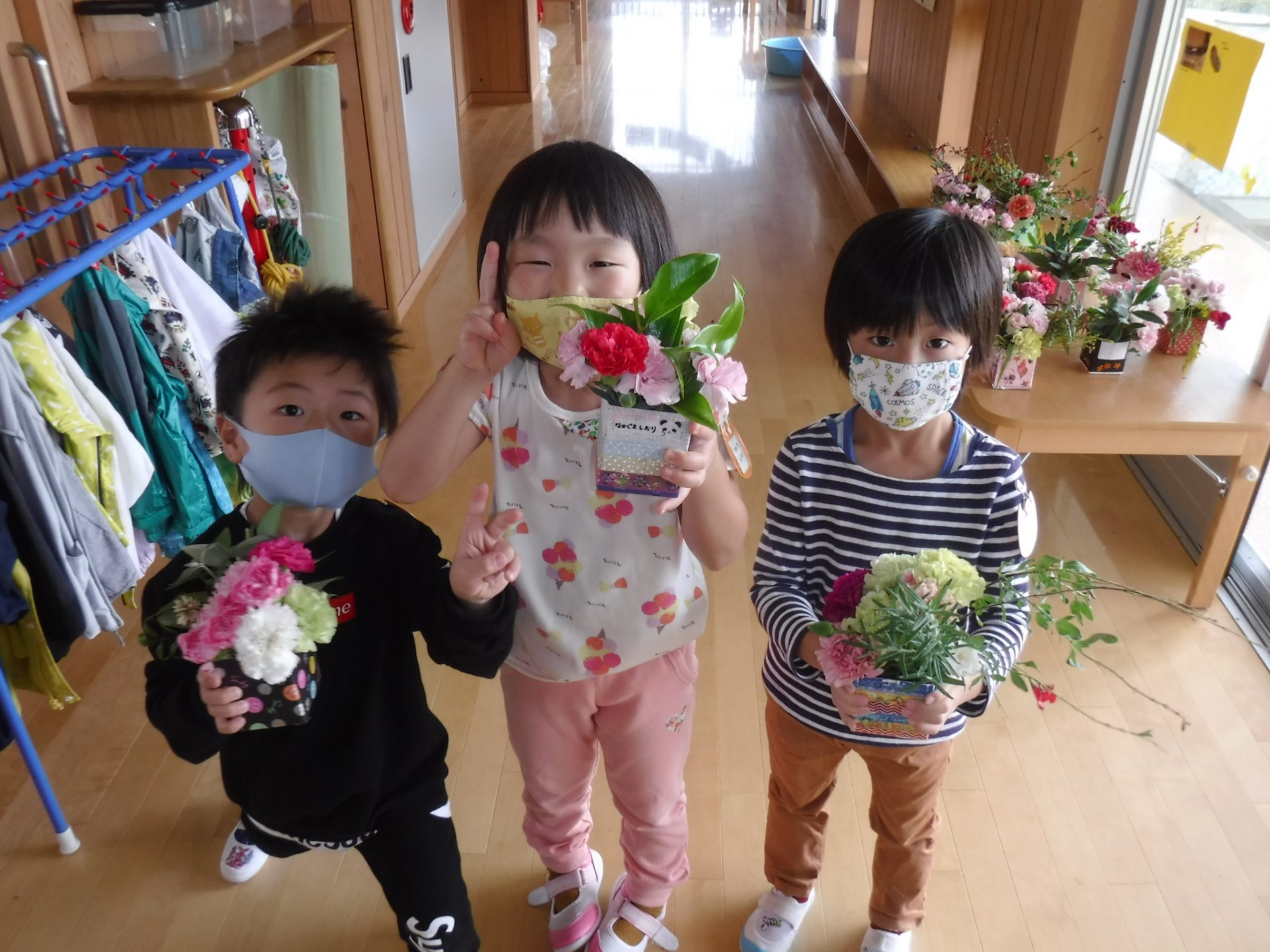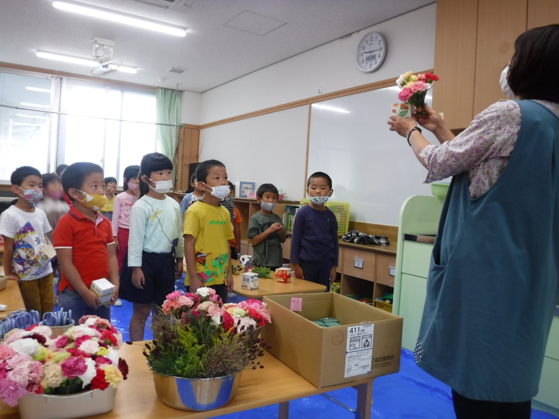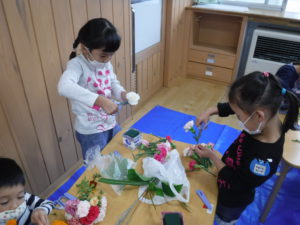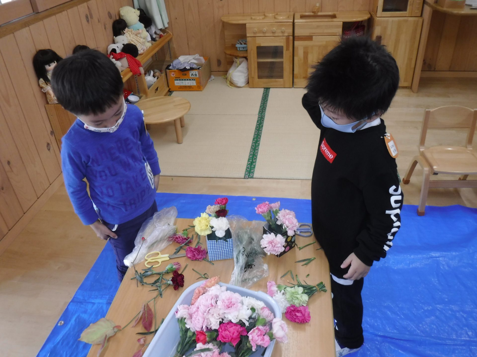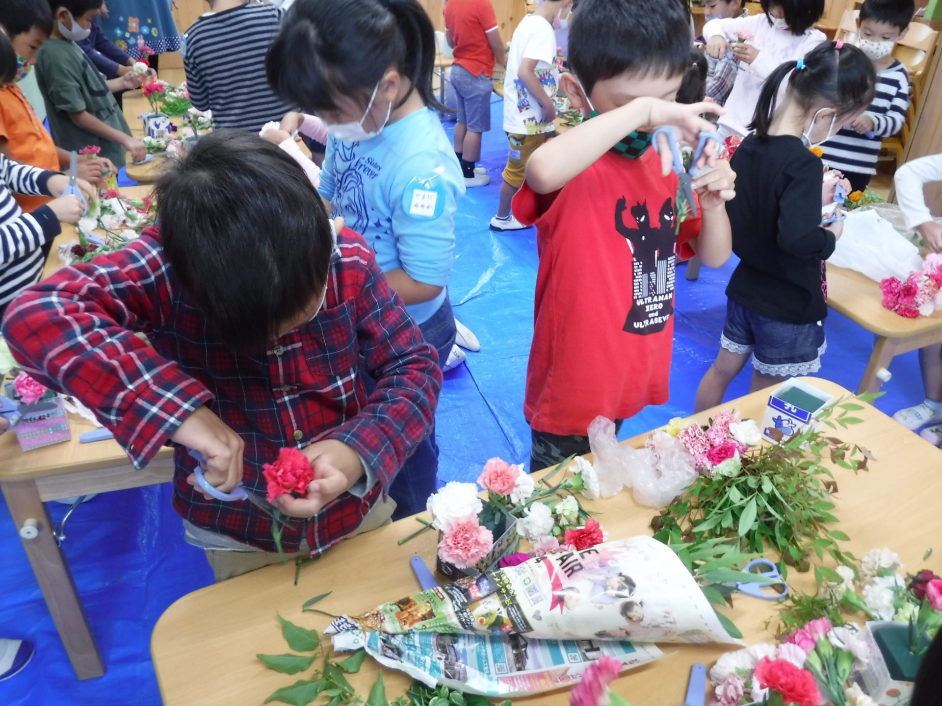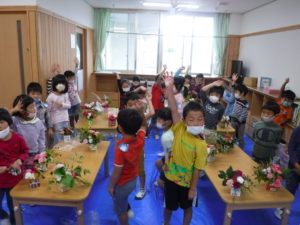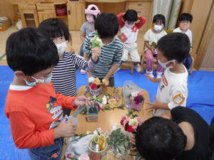 近所の農家の方から「出荷用の花が余っているけれど、園で使いませんか?」とお誘いの言葉をいただき、全学年でフラワーアレンジメントを楽しむことにしました。