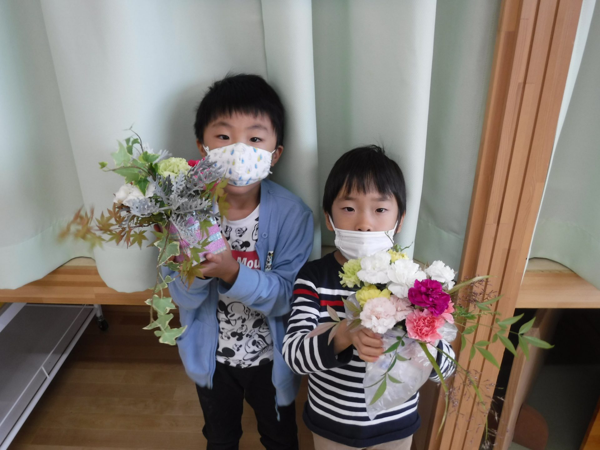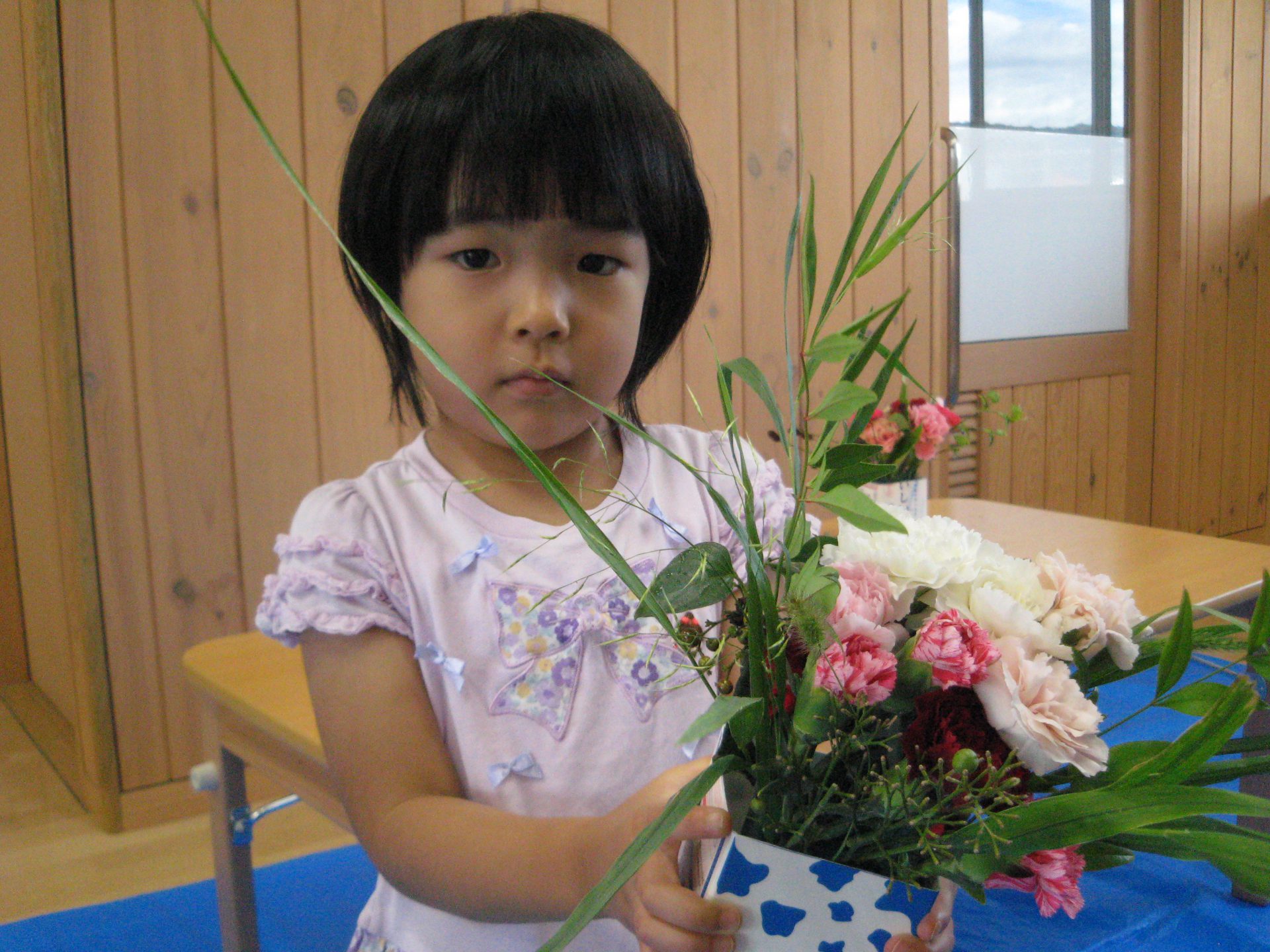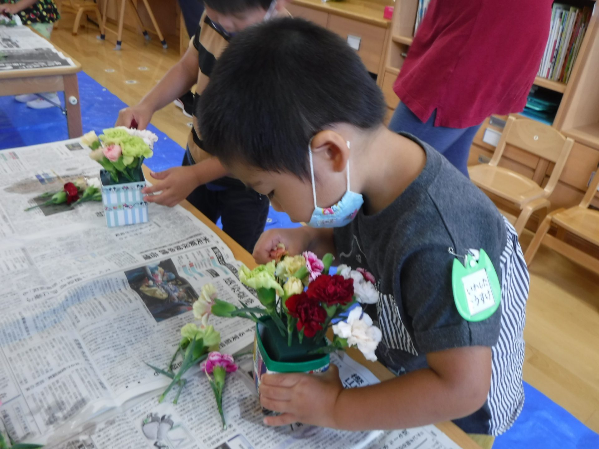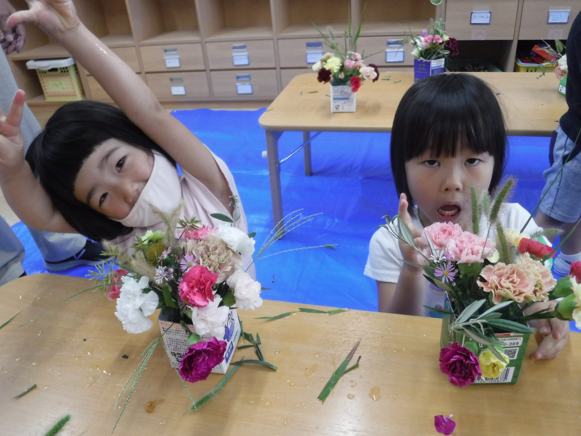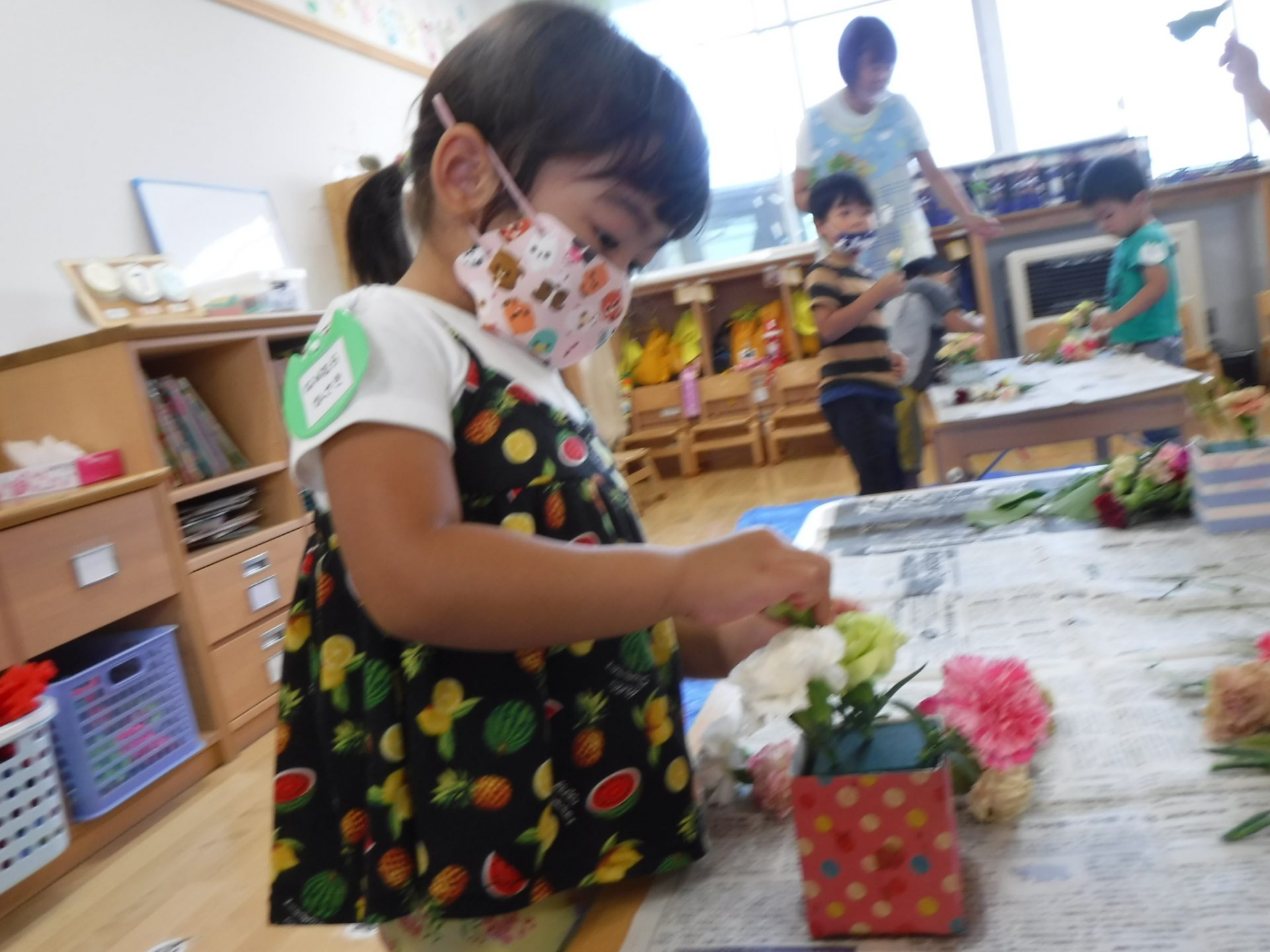 近所の農家の方から「出荷用の花が余っているけれど、園で使いませんか?」とお誘いの言葉をいただき、全学年でフラワーアレンジメントを楽しむことにしました。