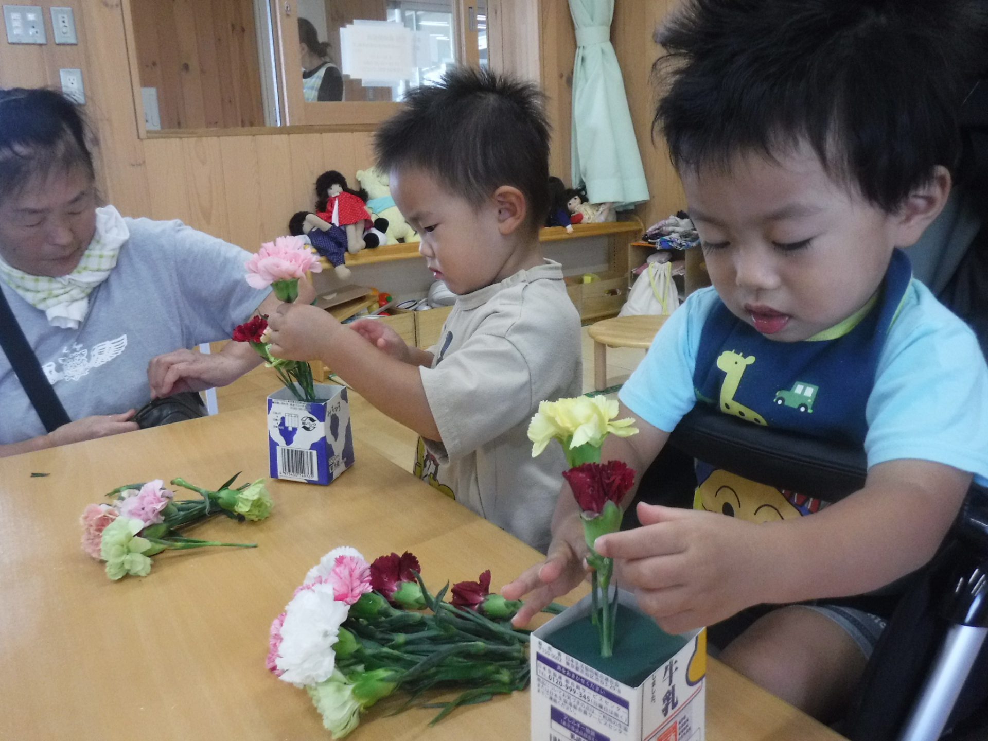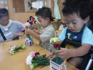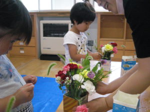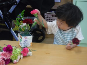 一番小さい0・1歳児クラスの子たちも、手伝ってもらいながらお花を生けていきます。