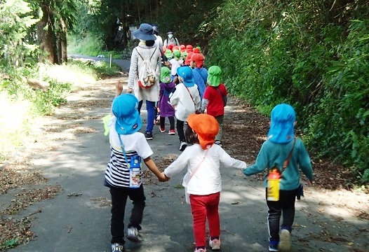 異年齢で手をつなぎ歩く。小さい子のペースに合わせて歩く。