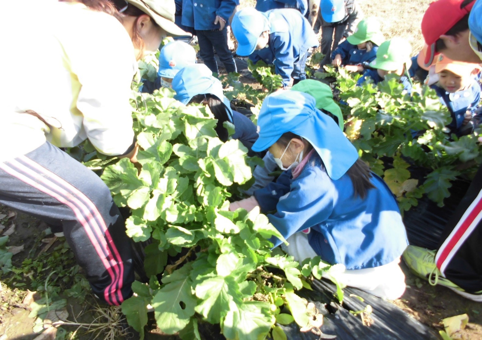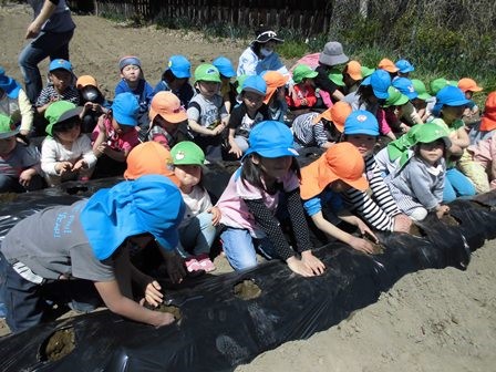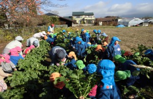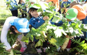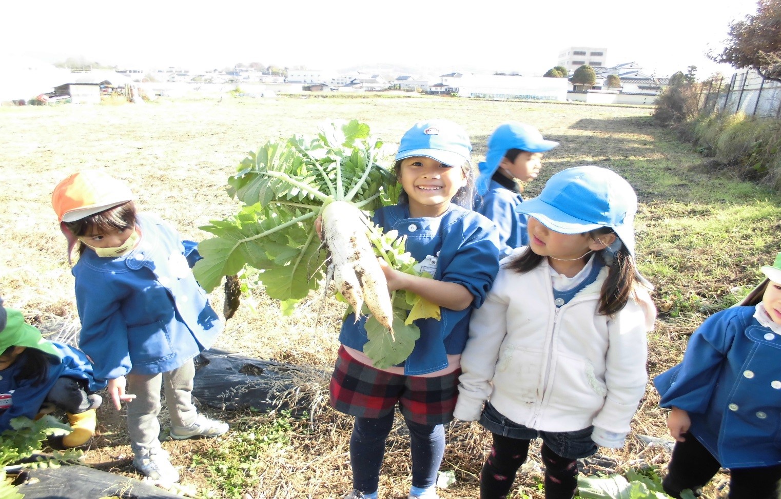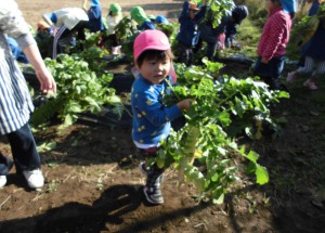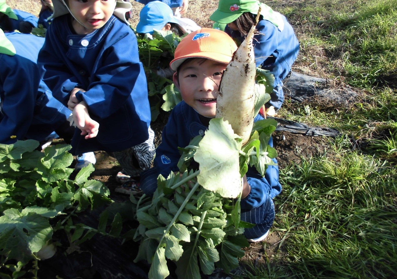 じゃがいもを収穫した後に、肥料を足してだいこんのたねまきをしました。水くれやまびきを年長さん中心によく世話をしてくれたおかげで、たくさんのだいこんが収穫でき子ども達は大喜び。全園児でだいこん抜きを楽しみました。