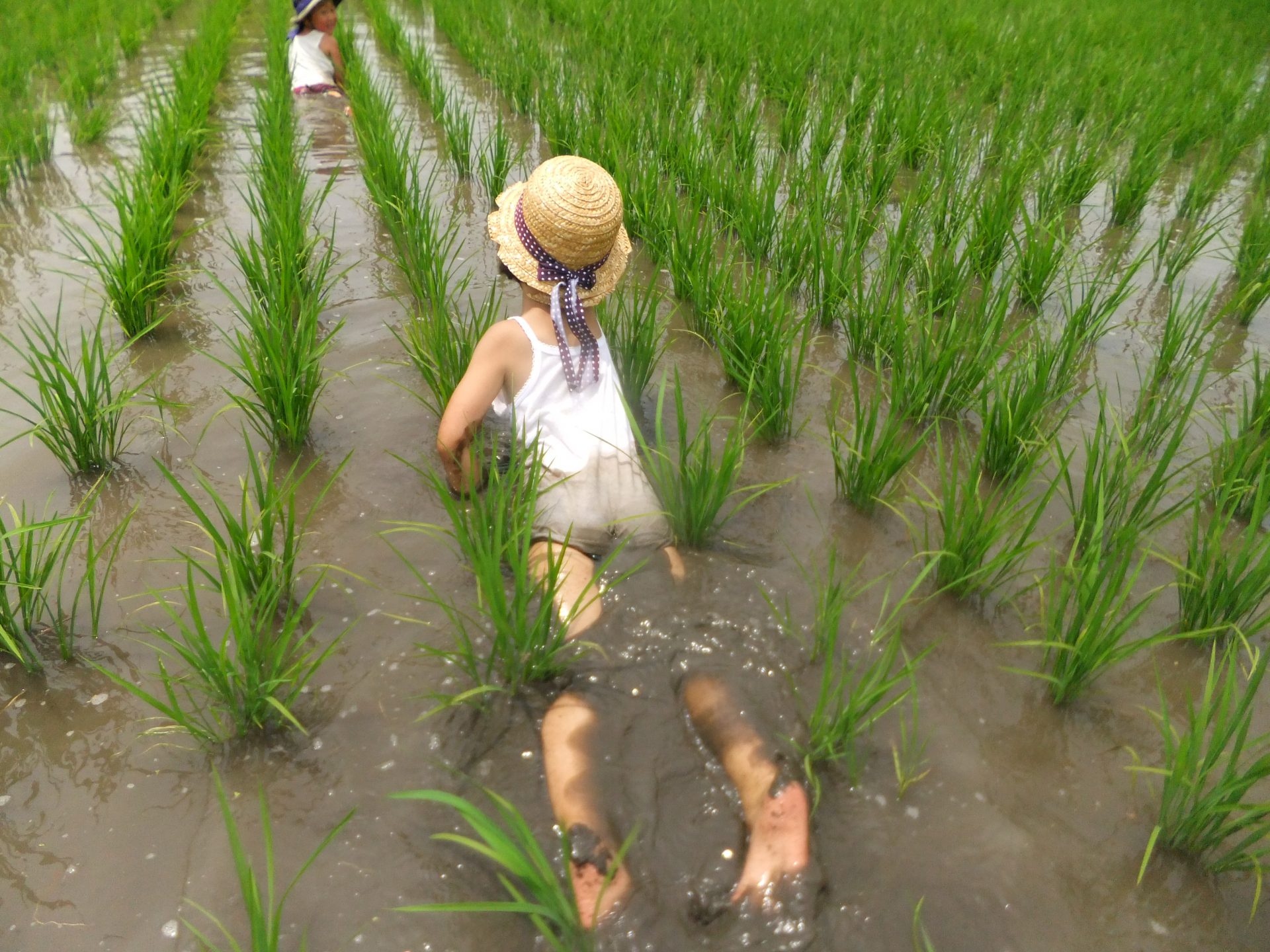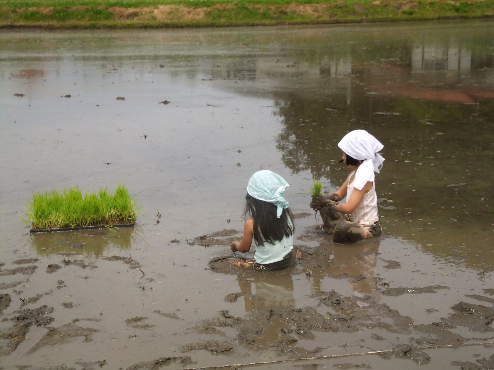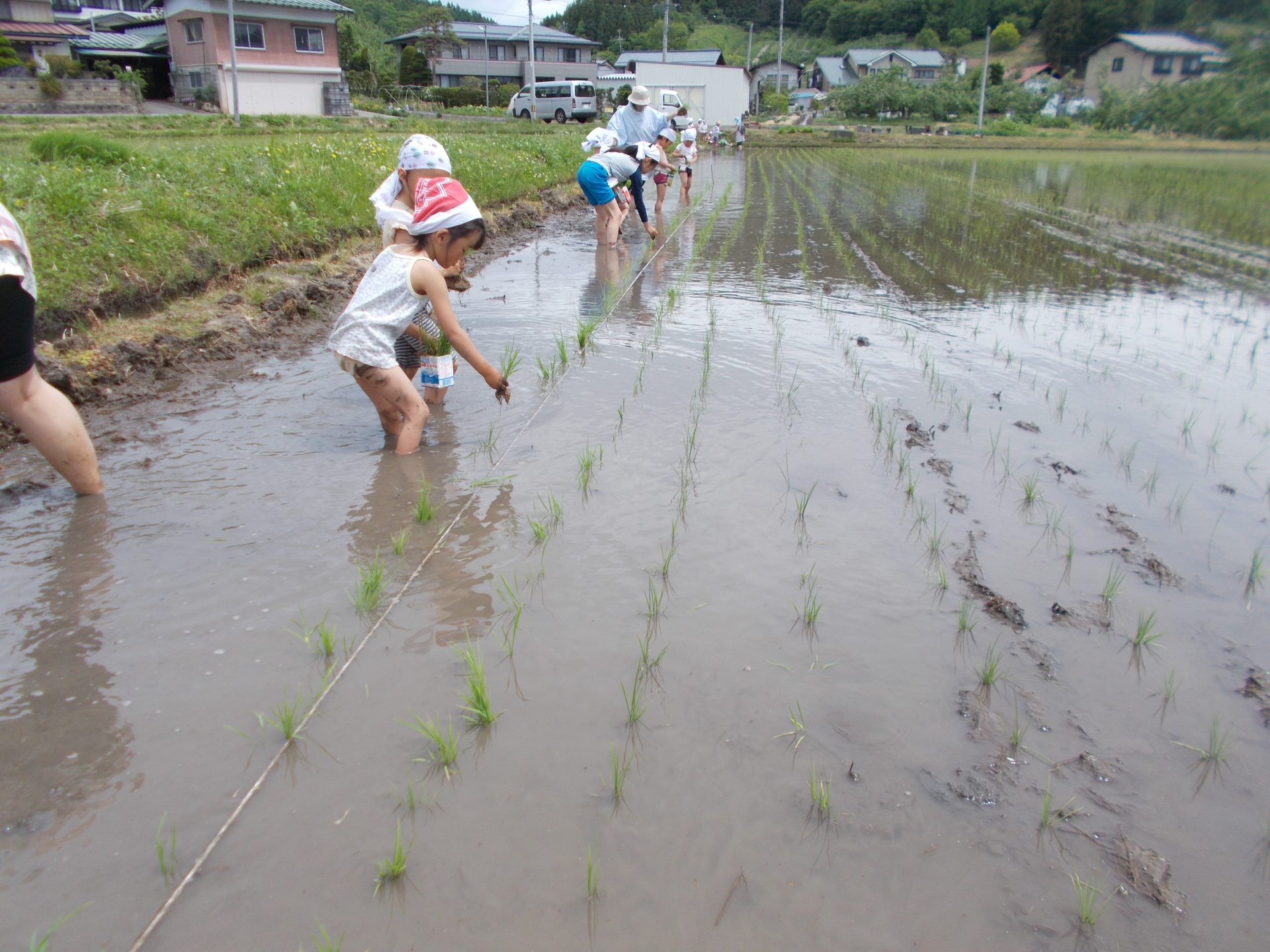 5月28日 田植え 牛乳パックの苗入れをつけての田植え