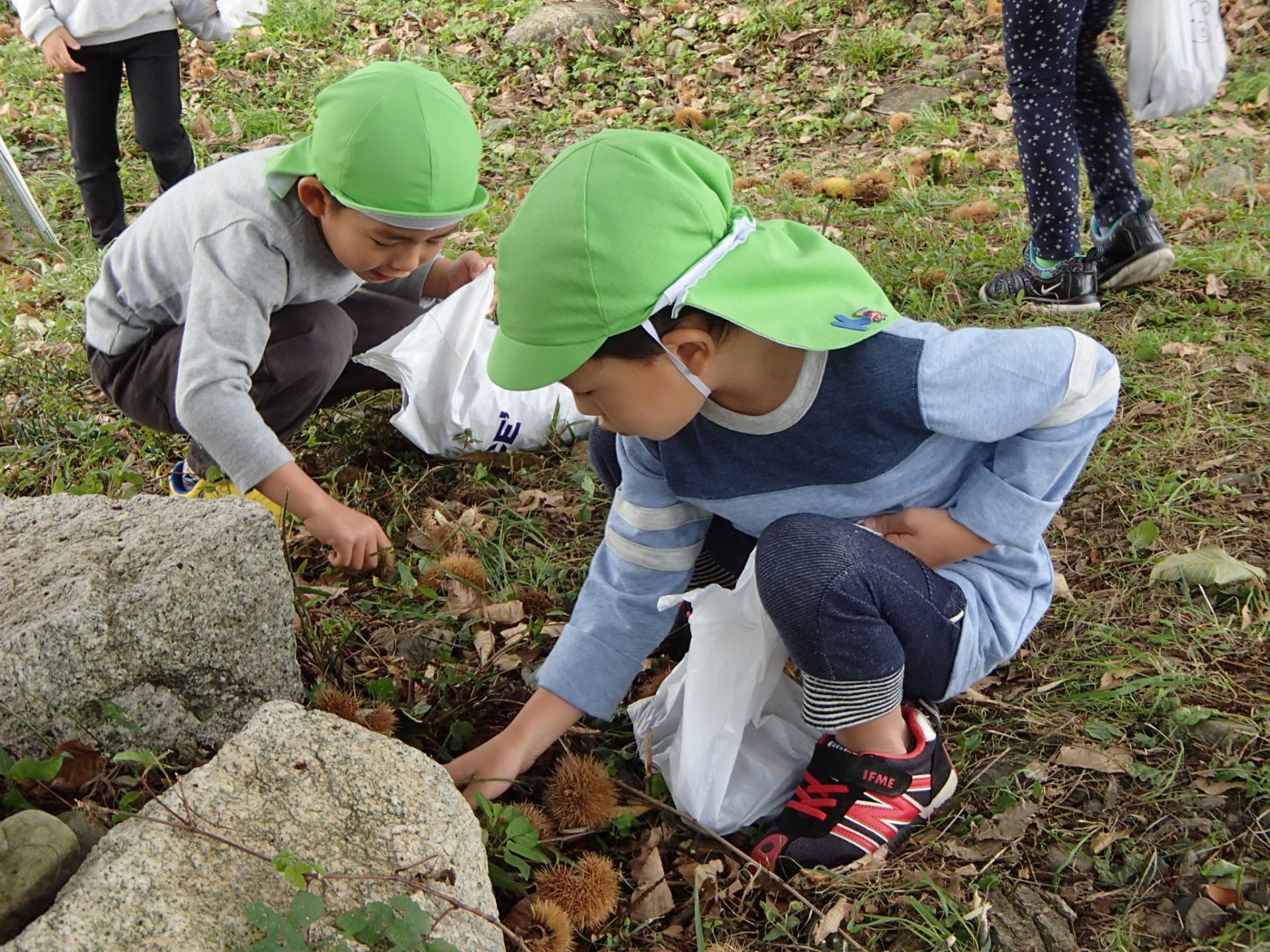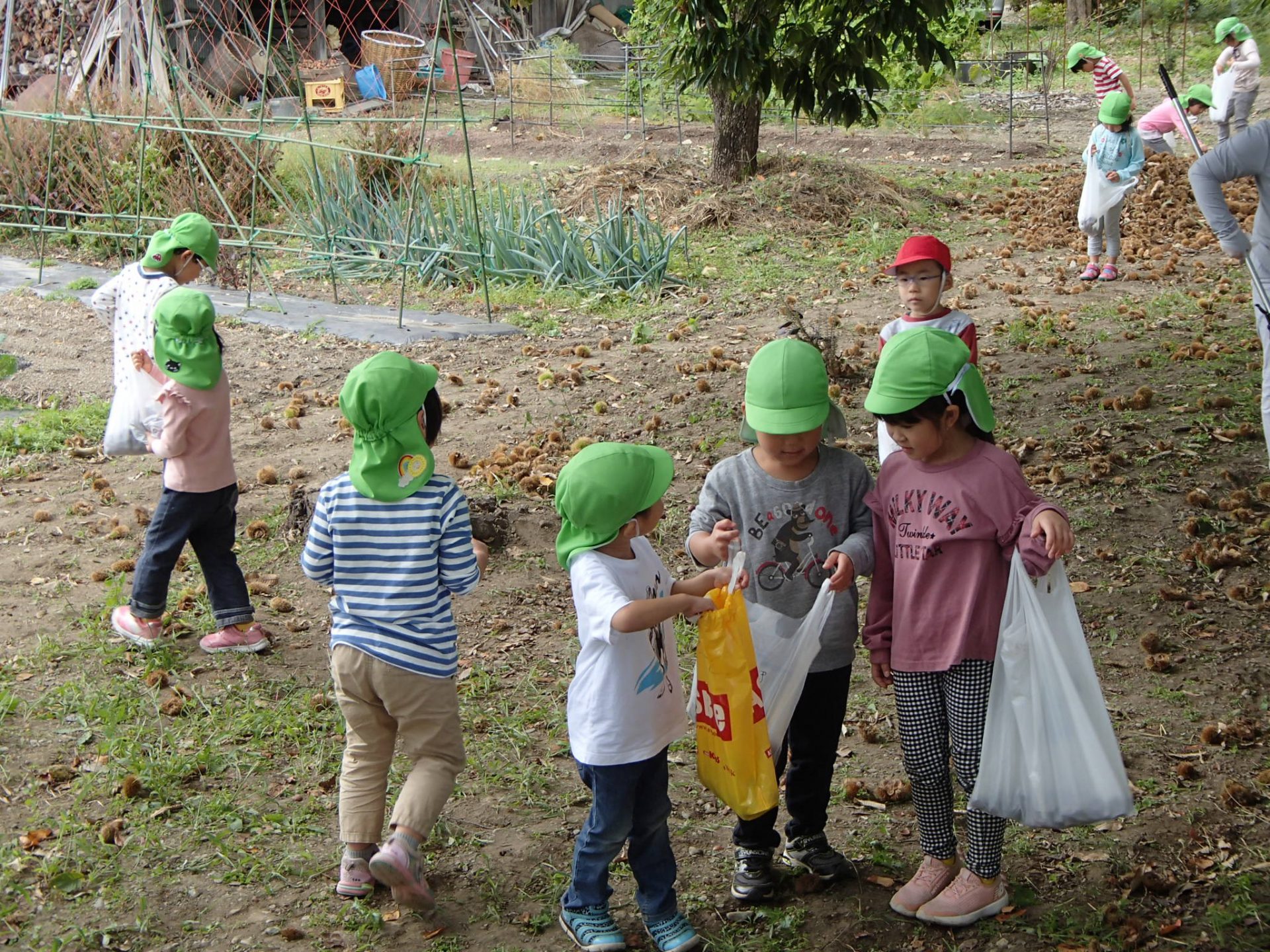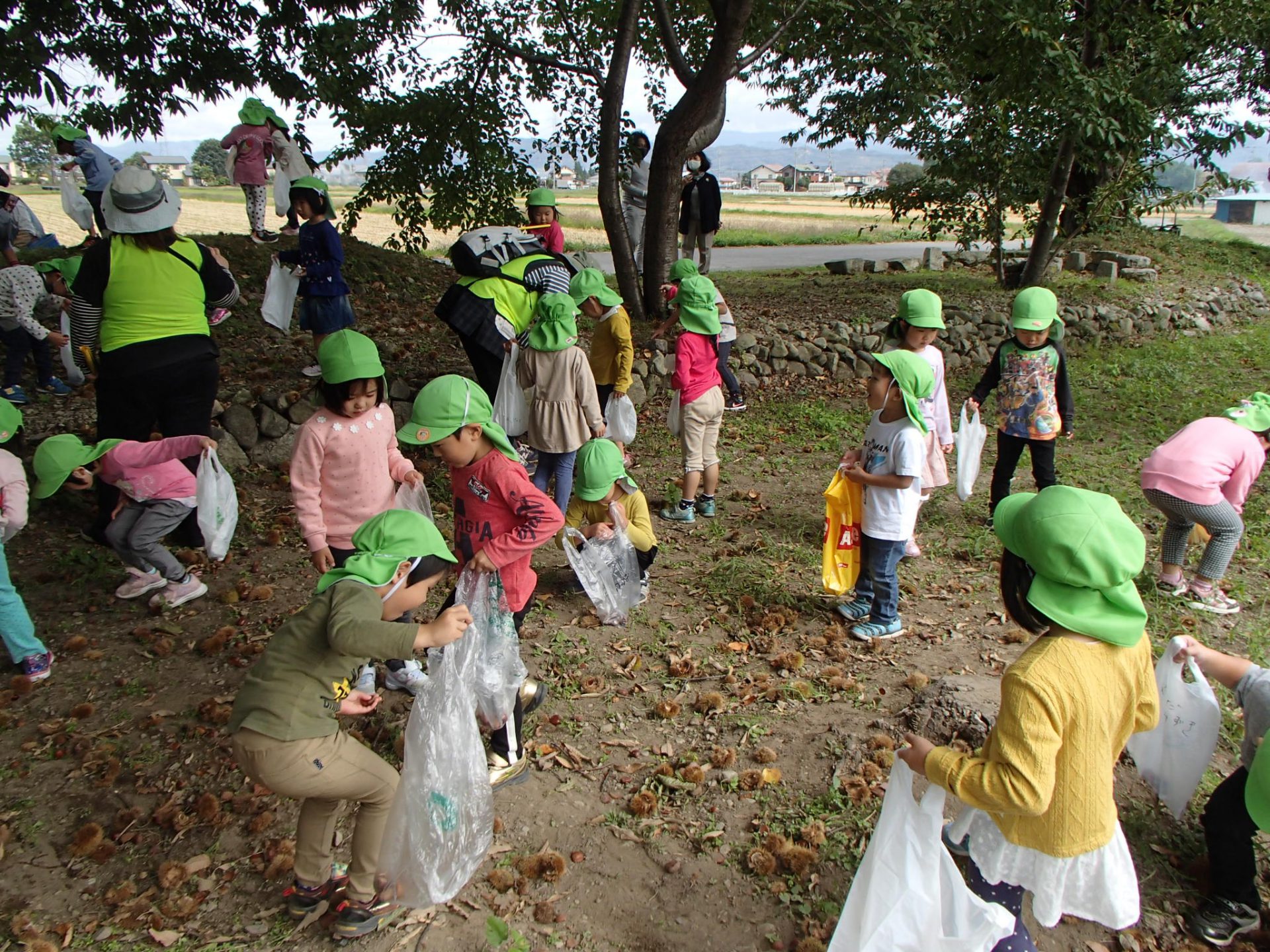 昨年度も栗拾いに来ている年長さん。「おいしい栗なんだよ~」「栗ごはんがいいな」「栗クリームもおいしいよ」とおいしい話でも、盛り上がります。
