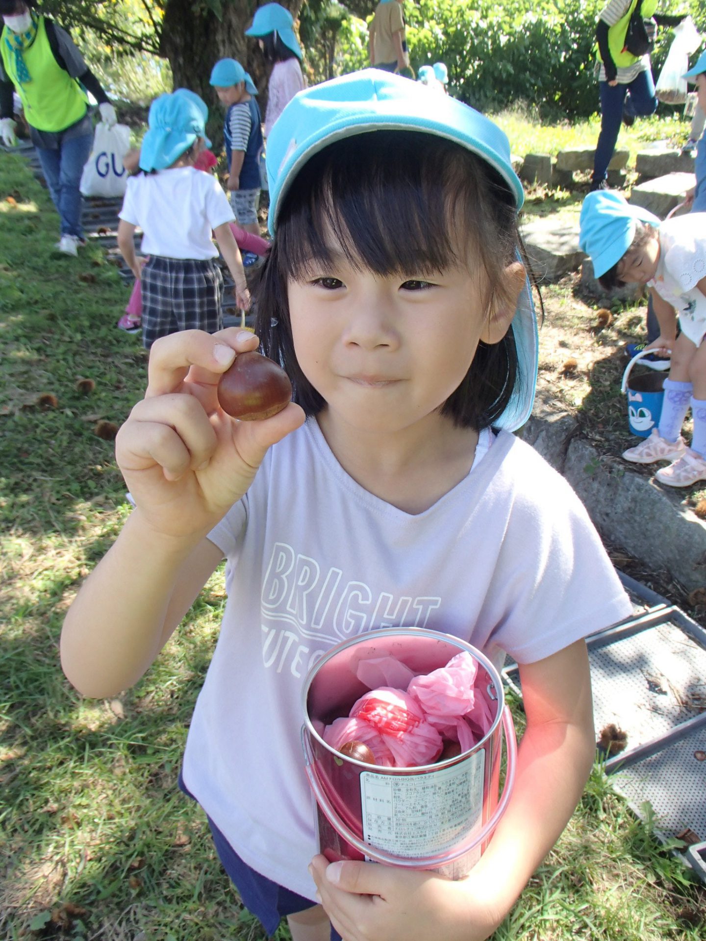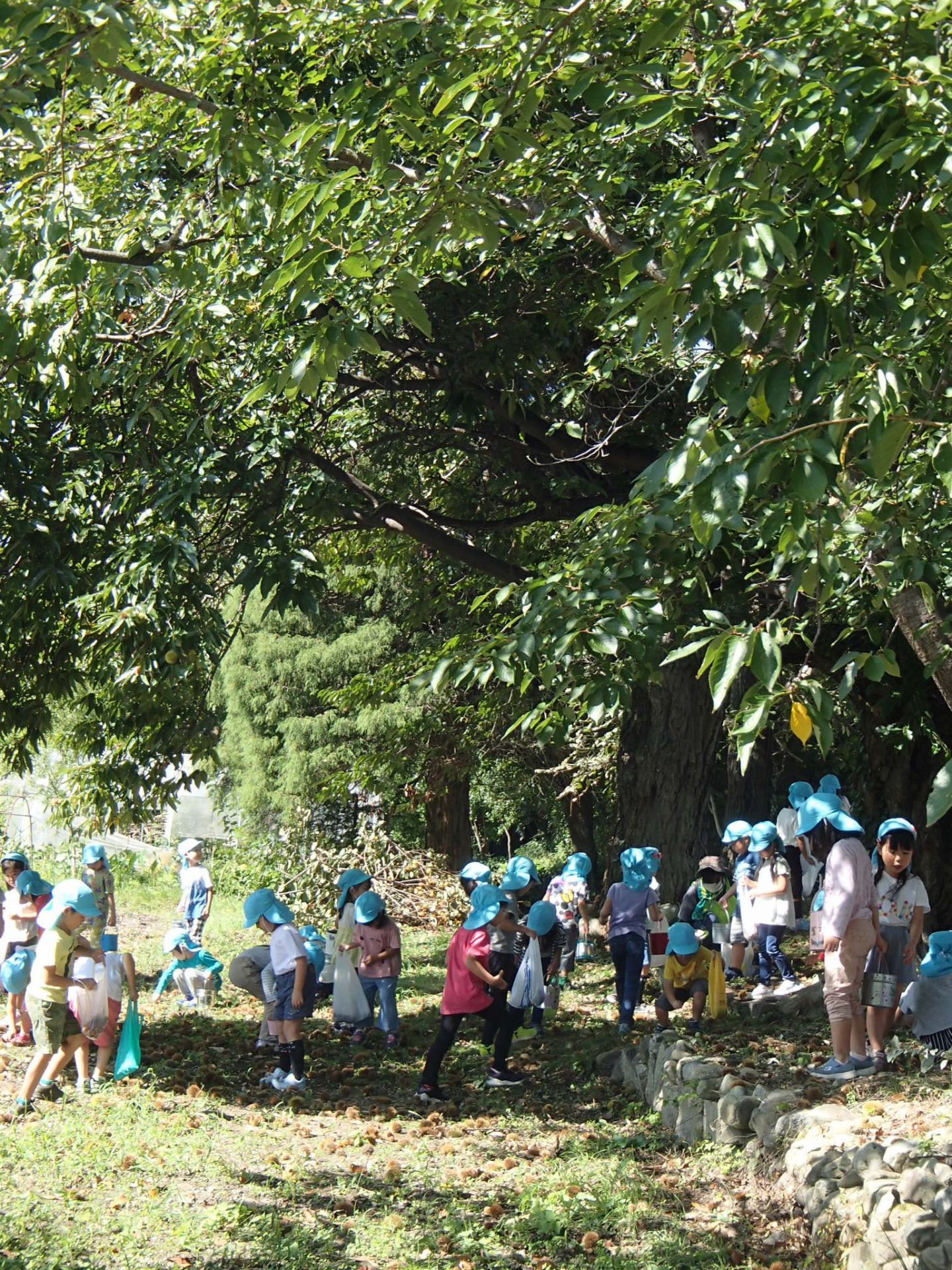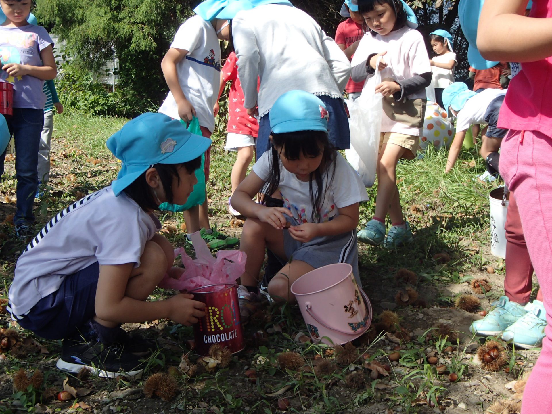 昨年度も栗拾いに来ている年長さん。「おいしい栗なんだよ~」「栗ごはんがいいな」「栗クリームもおいしいよ」とおいしい話でも、盛り上がります。