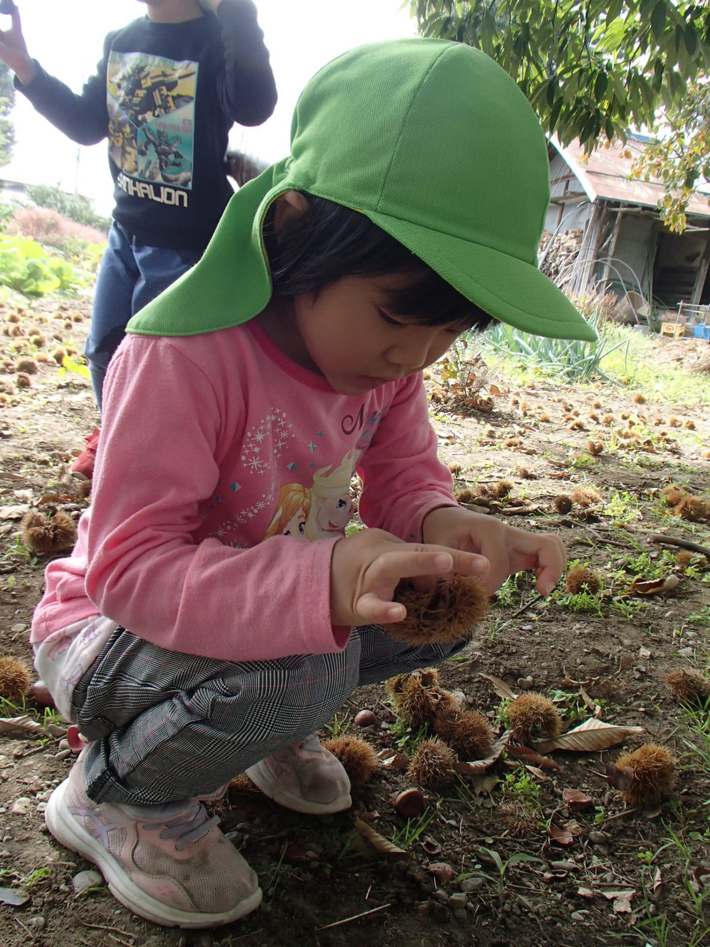 年中さんは、「出てこない~」とイガをむくのに苦戦中!「チクチクして痛い~」と言っていると・・・。