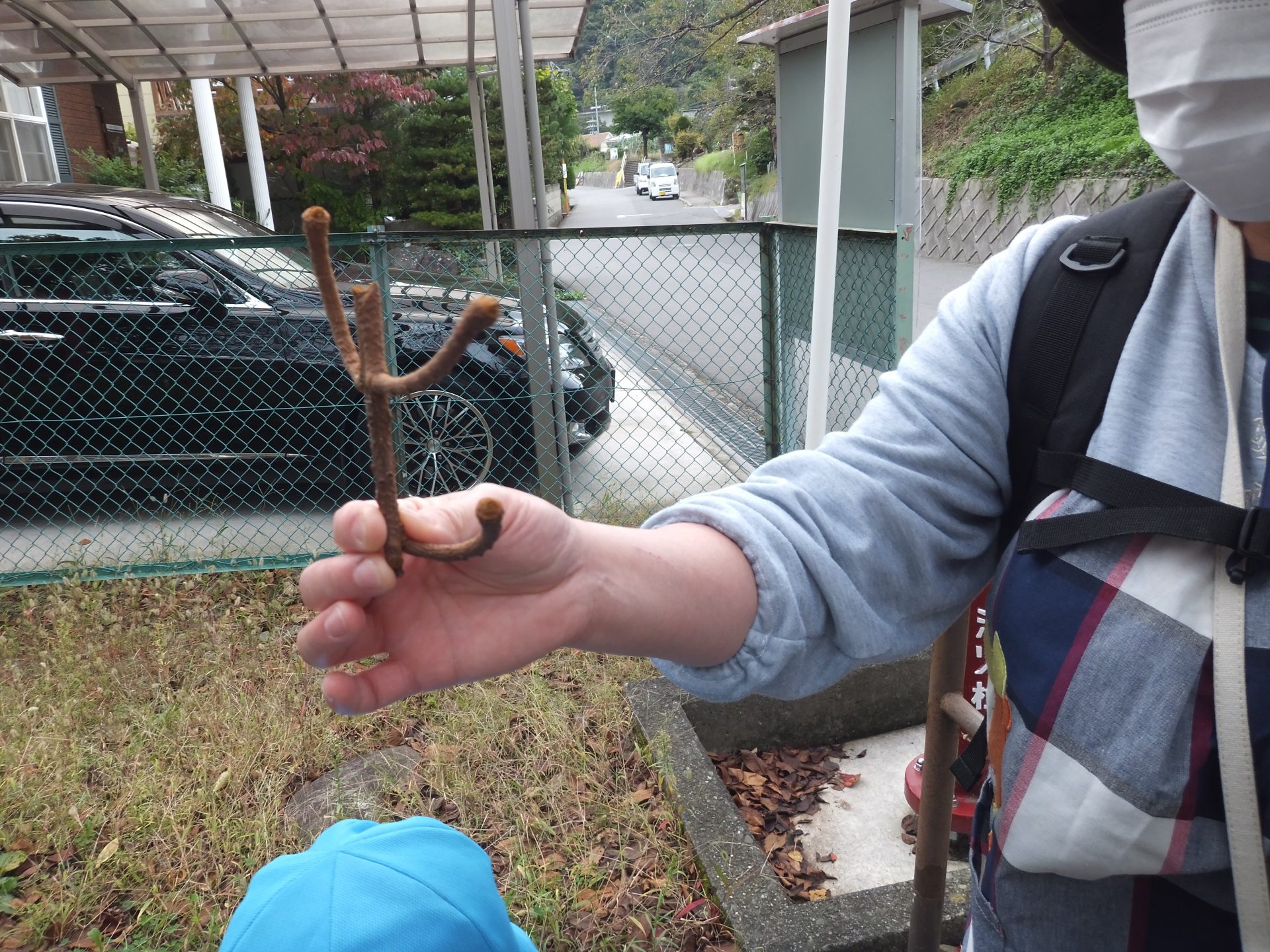 その途中の公園で、面白い形の枝を見つけたよ。