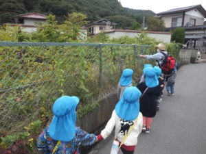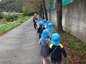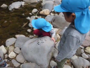 夏に初めて川の近くを探索して、川原の石にお絵描きして楽しんだ子ども達。それ以来の川方面への散歩でしたが、桜の木の変化に気付いたり、前回の経験をもとに川の水でお絵描きしてみたりして、子ども達なりの発見とひらめきで遊びこむ姿が見られて、楽しい散歩になりました。