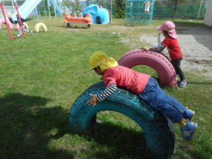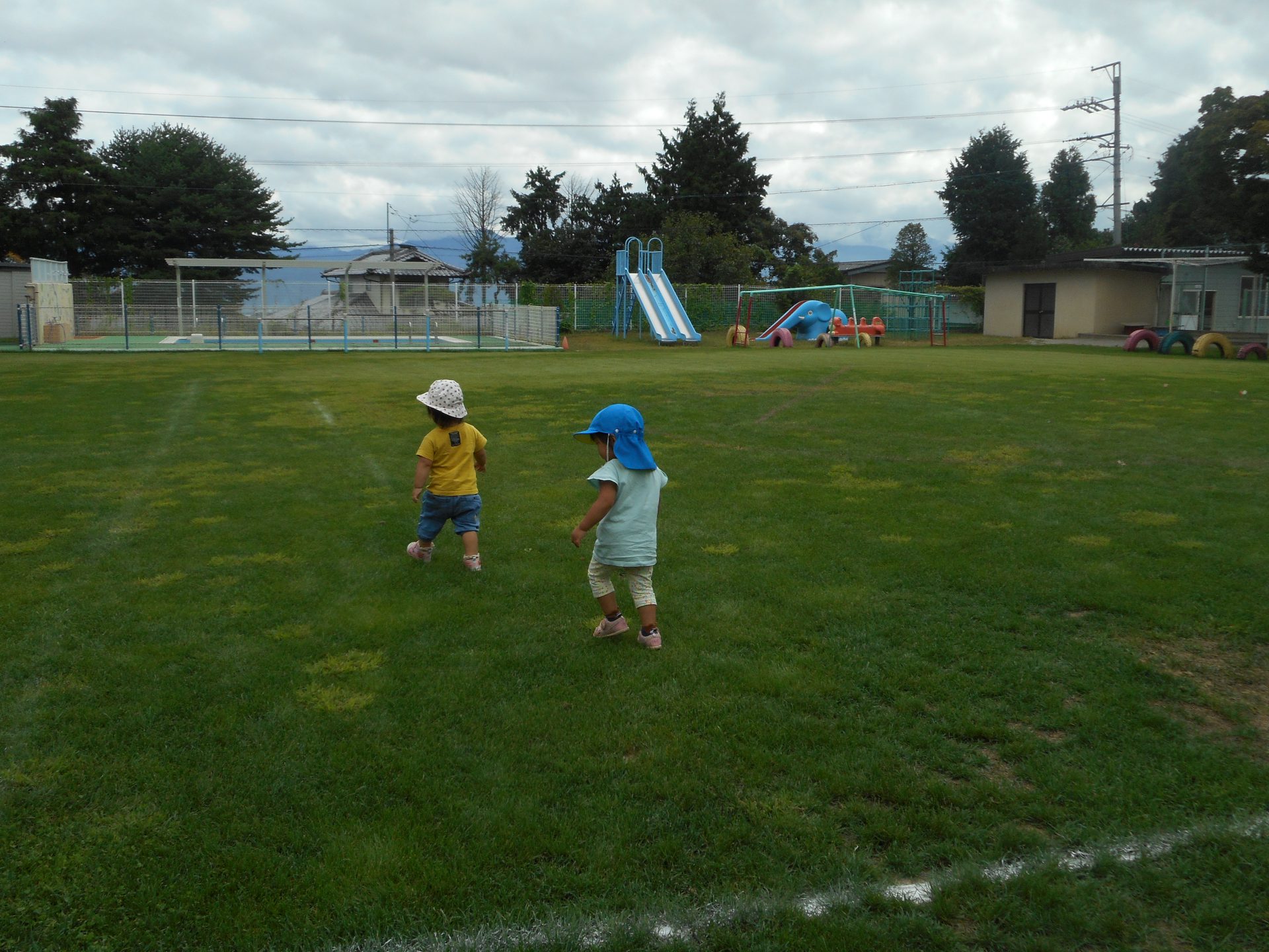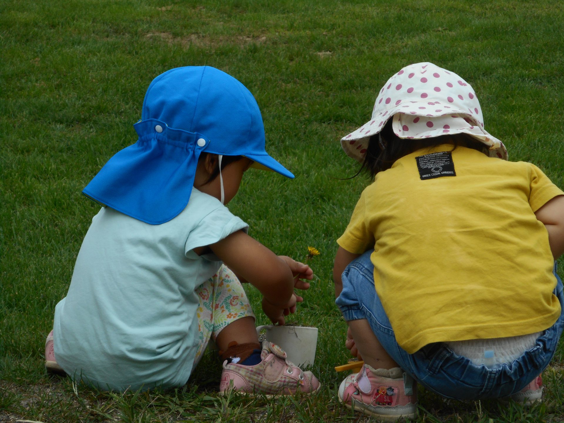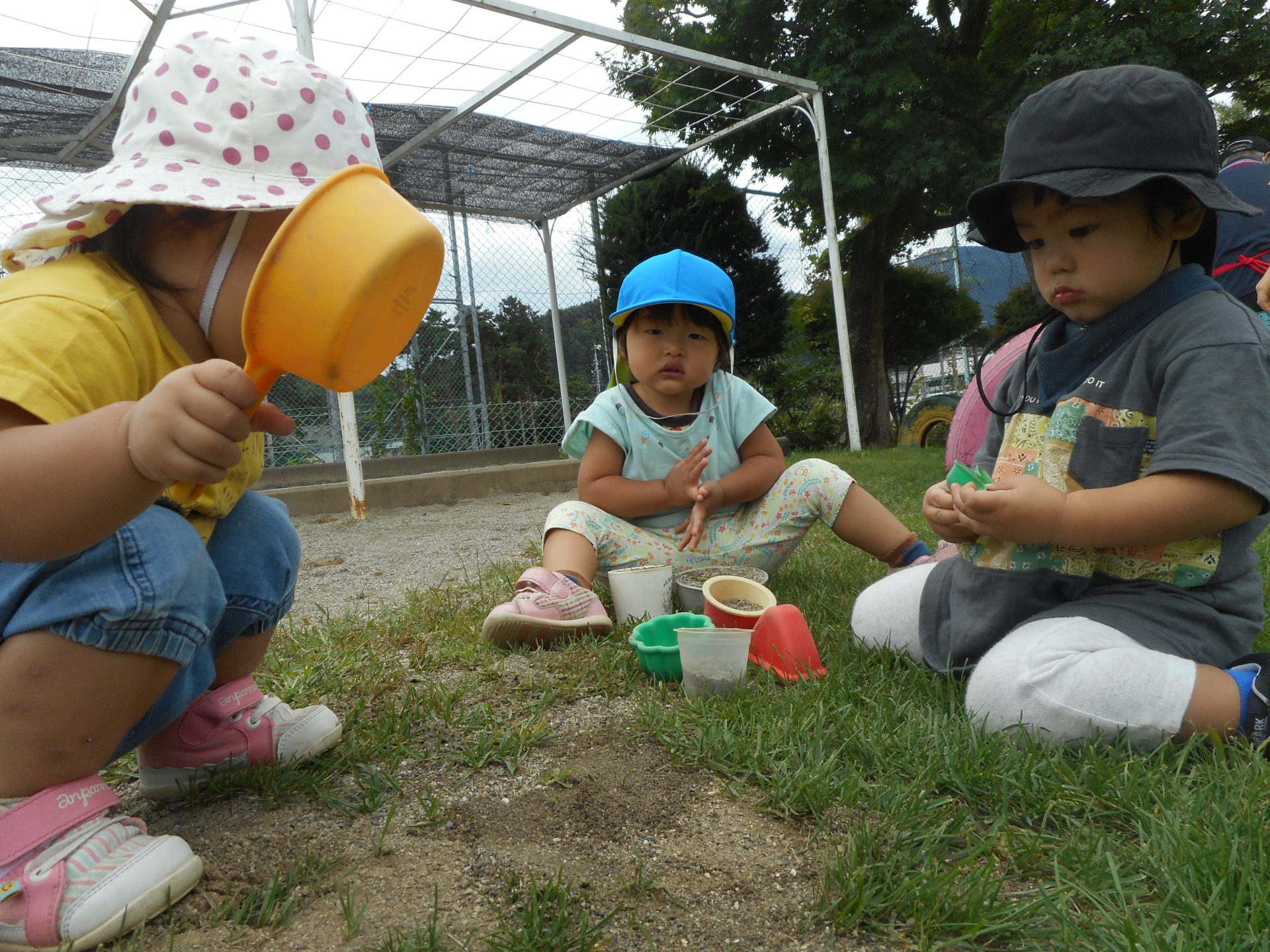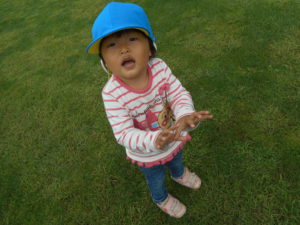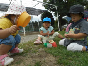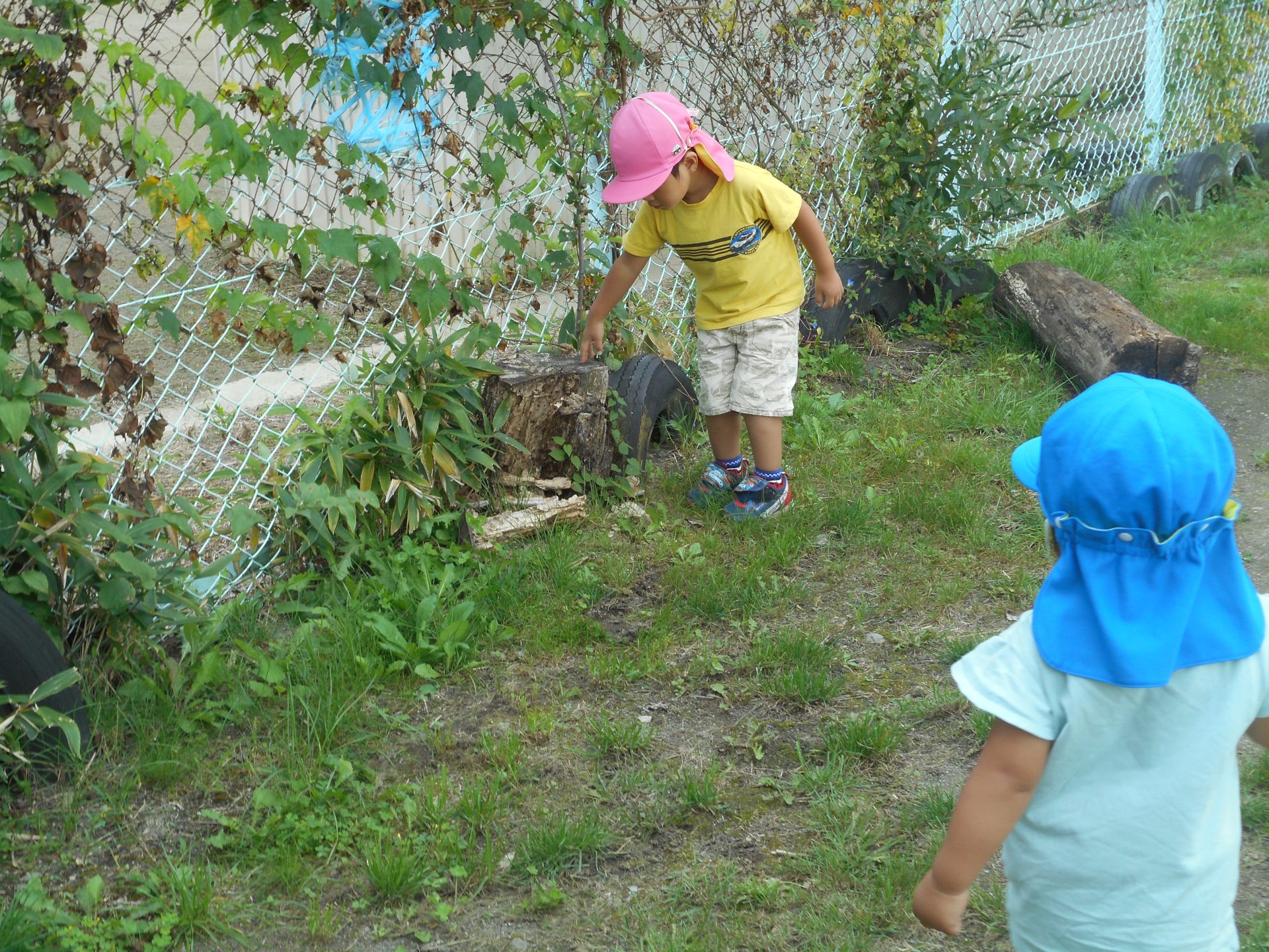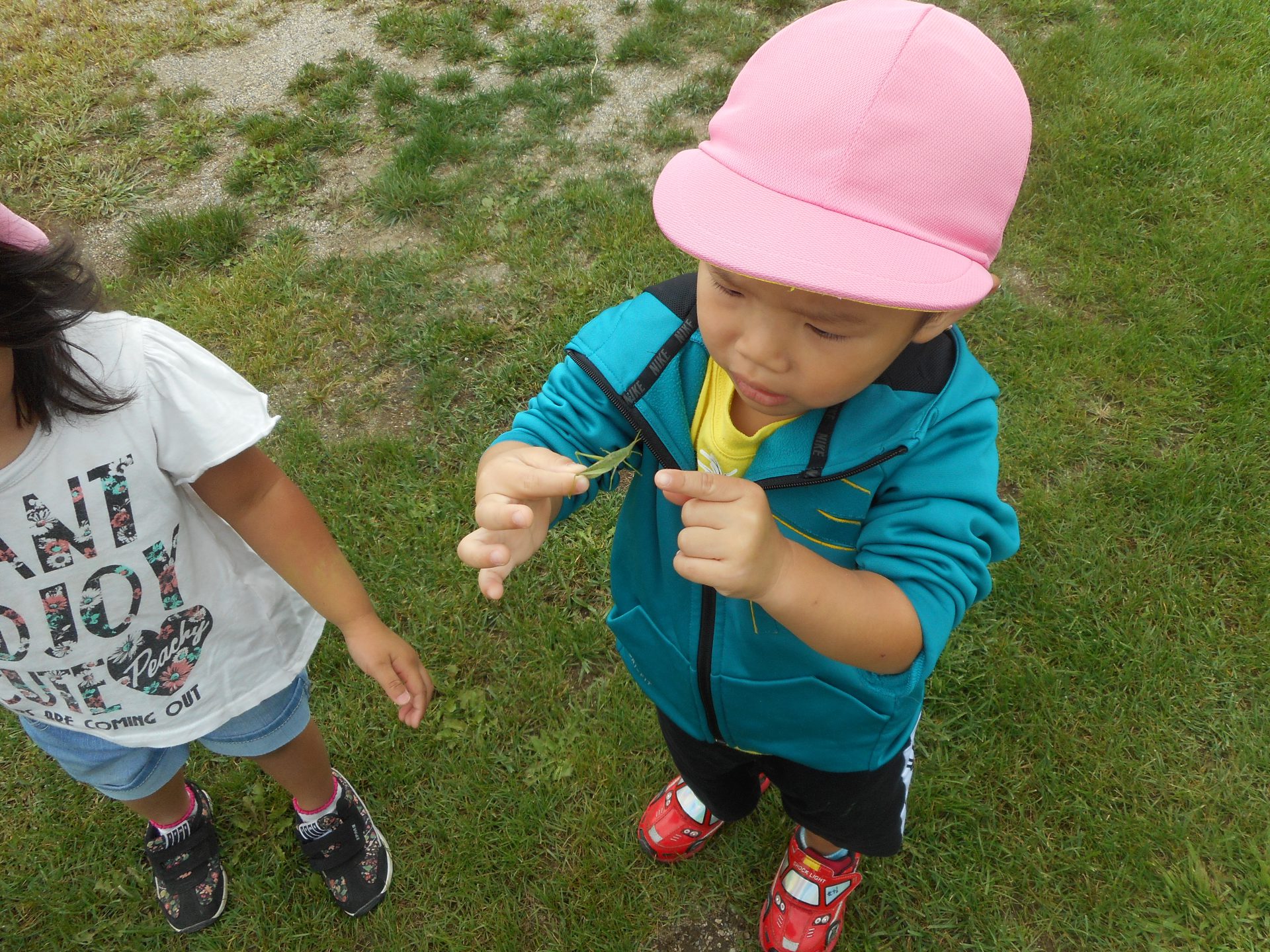 くもの巣を窓ごしに毎日見ていたり、はじめはさわれなかったかえるも2歳児さんの姿を真似て1歳児でもつかまえられるようになったりしています。秋が深まり風が冷たくなってきてその興味は木の実や葉っぱへと広がってきました。