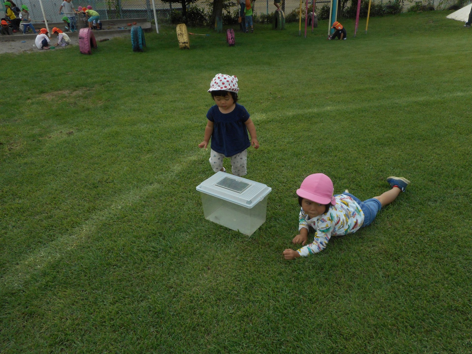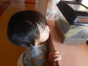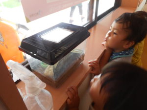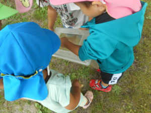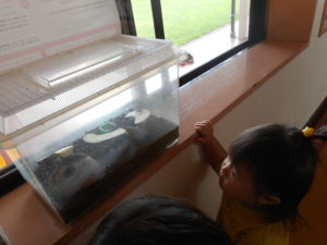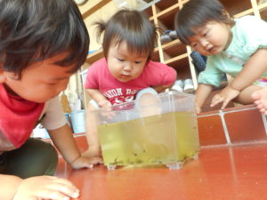 きんぎょ めだか かえる おたまじゃくし ザリガニ ウーパールーパー ・・・春からたくさんの生き物を見てきて、小さな生き物が大好きな子どもたち。