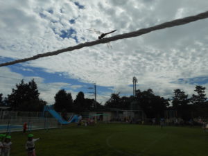 ロープにとまってる。 えい! えい!にげちゃうね。