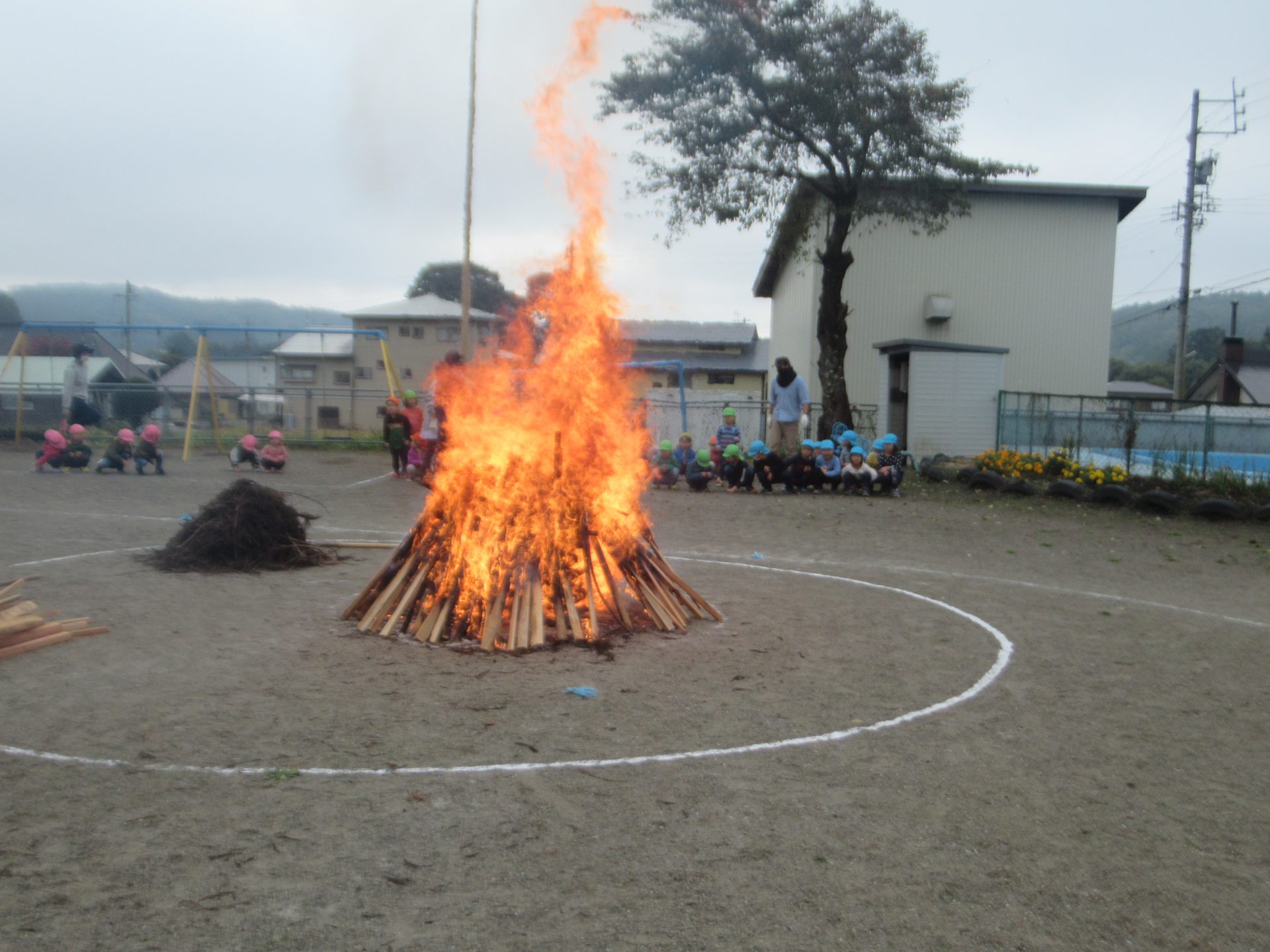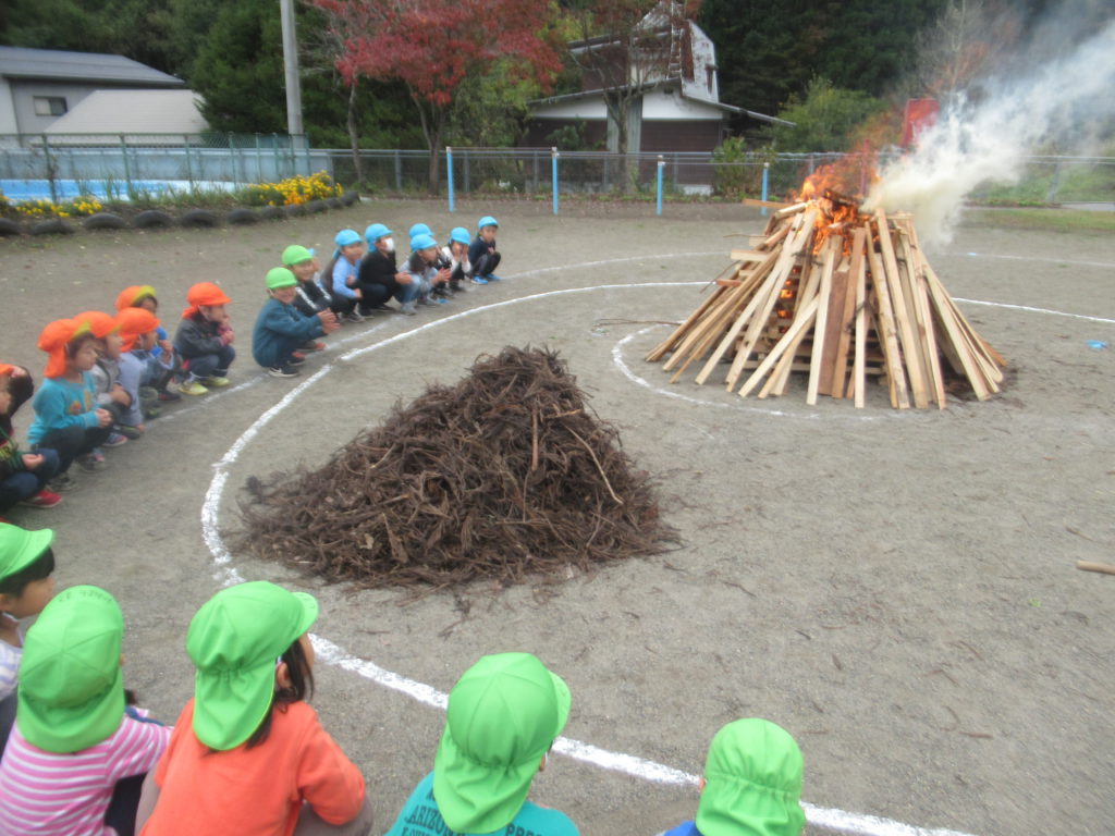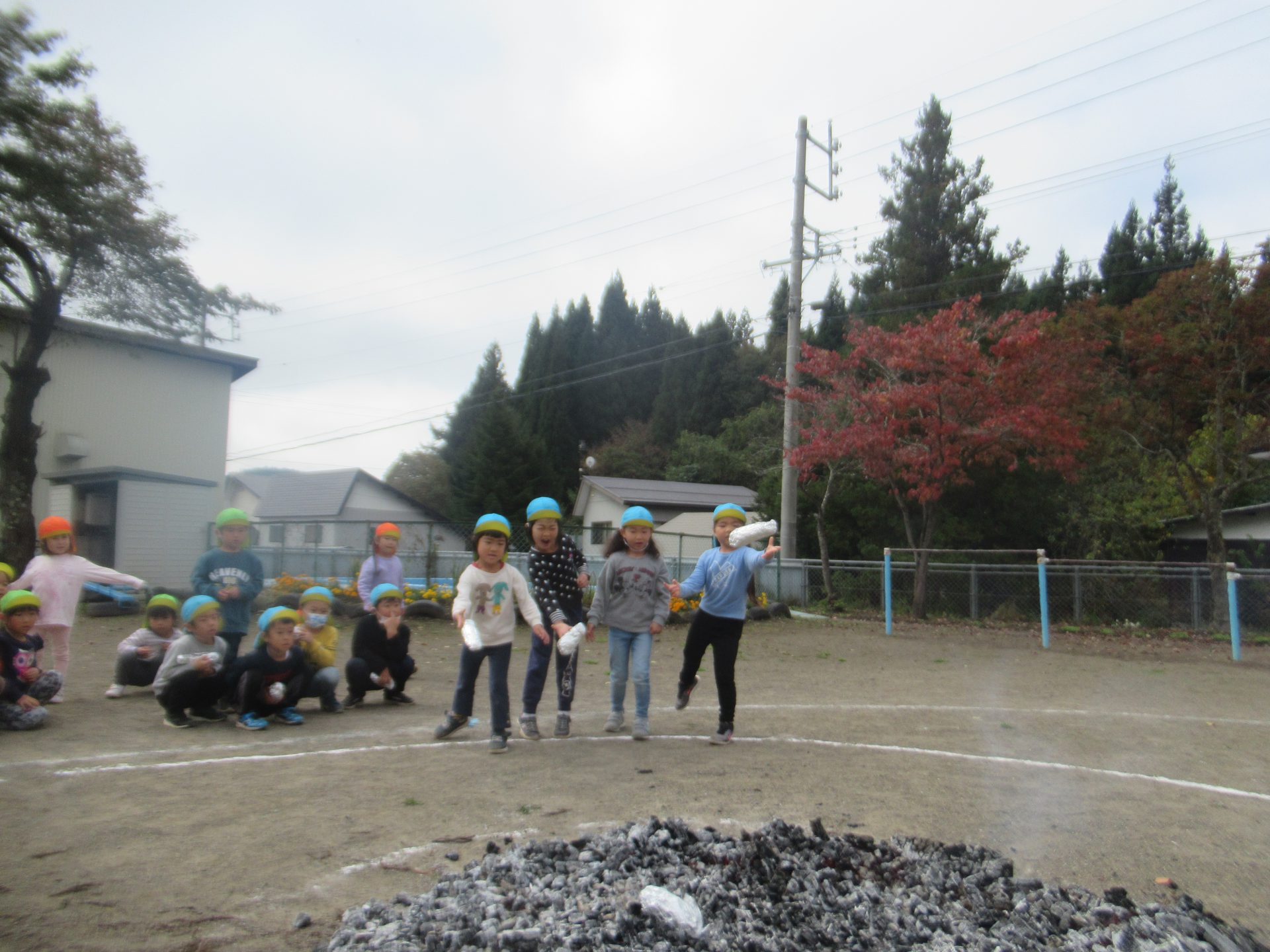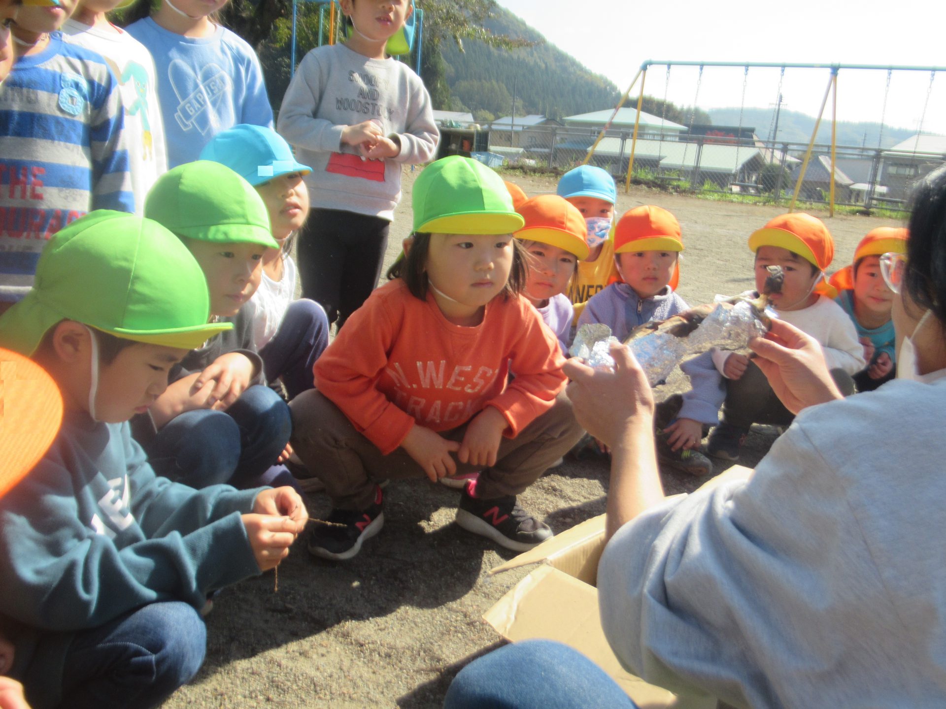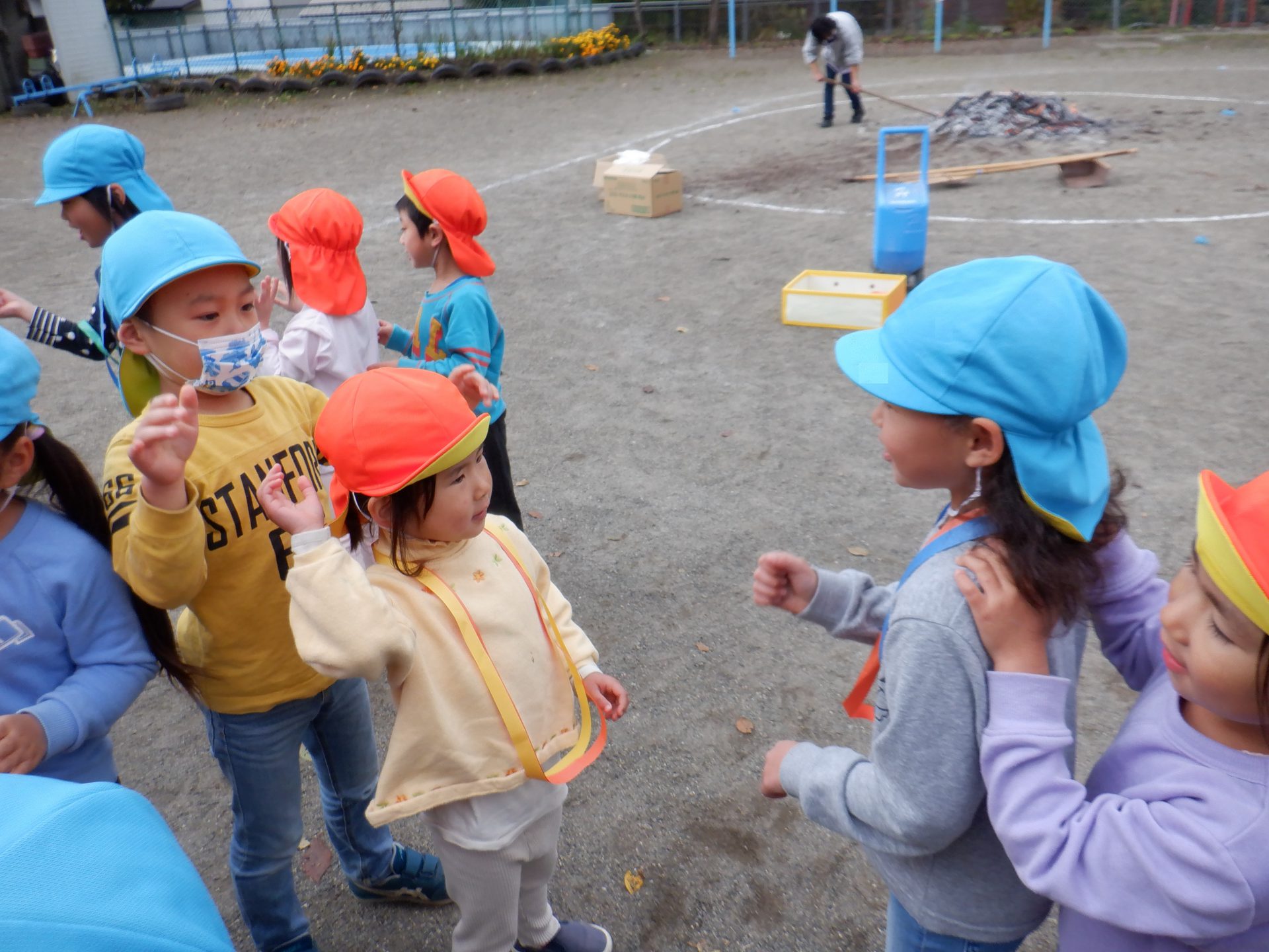 お芋堀りから始まり、さつまいもを洗ったり、杉の葉を拾ったり、焼きいも会を通して子ども達にとって様々な経験ができた行事だったと思います。いもほりの土の感触、芋の大きさ、硬さから、普段間近ではあまり見る機会がない、焚き火の煙や炎の変化、熱さ、焼き芋の匂い、味と秋の味覚をまさに五感を使って感じることができました。自分たちできることを手伝いながら、楽しみに準備してきたので、焼き芋の味は格別だったのではないかと思います。また、年下の子に教えてあげる姿、年上の友達に憧れて真似する姿など、目的を共有するなかで異年齢の関わりを深める機会になったことも良かったと思います。