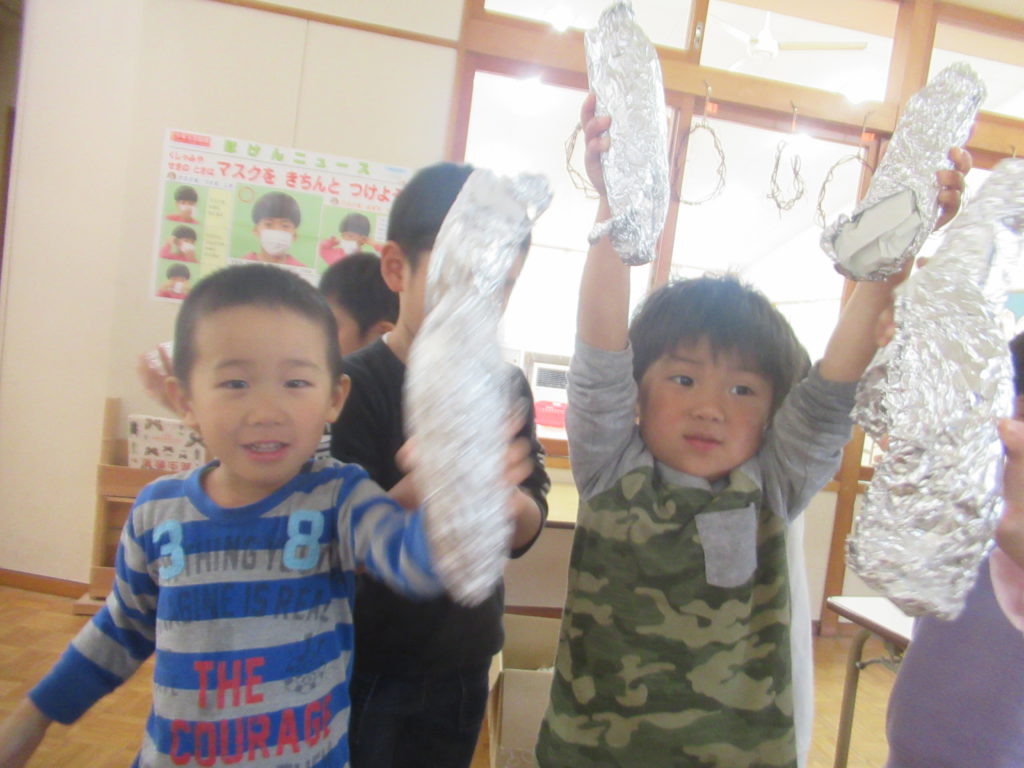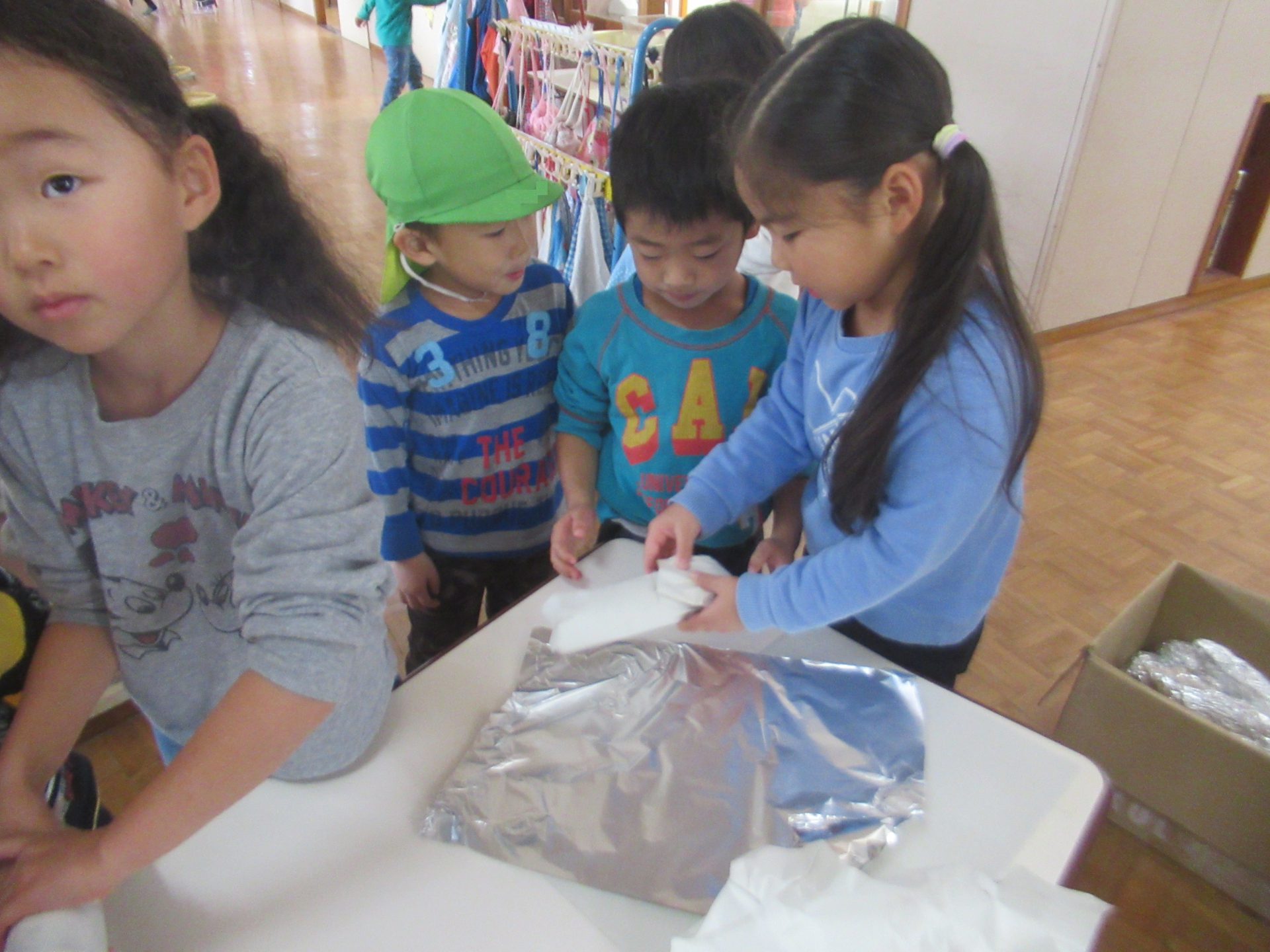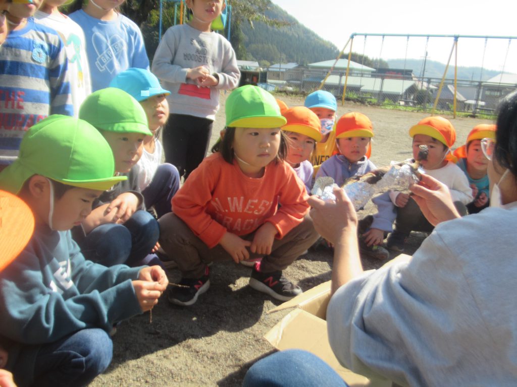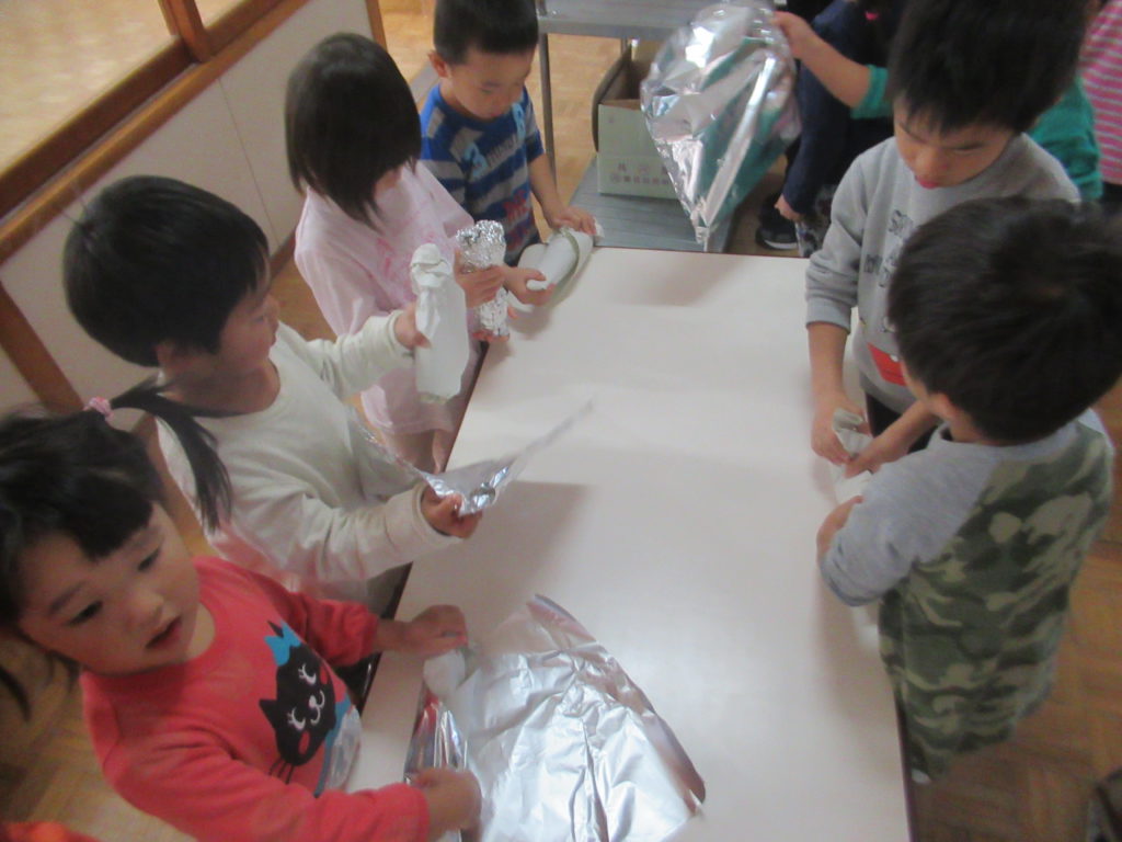 そ〜とアルミを開けてみると、「わぁ〜〜!!」出てきたお芋をみて、「いい匂い!早く食べたい!」と待ちきれない子ども達でした。