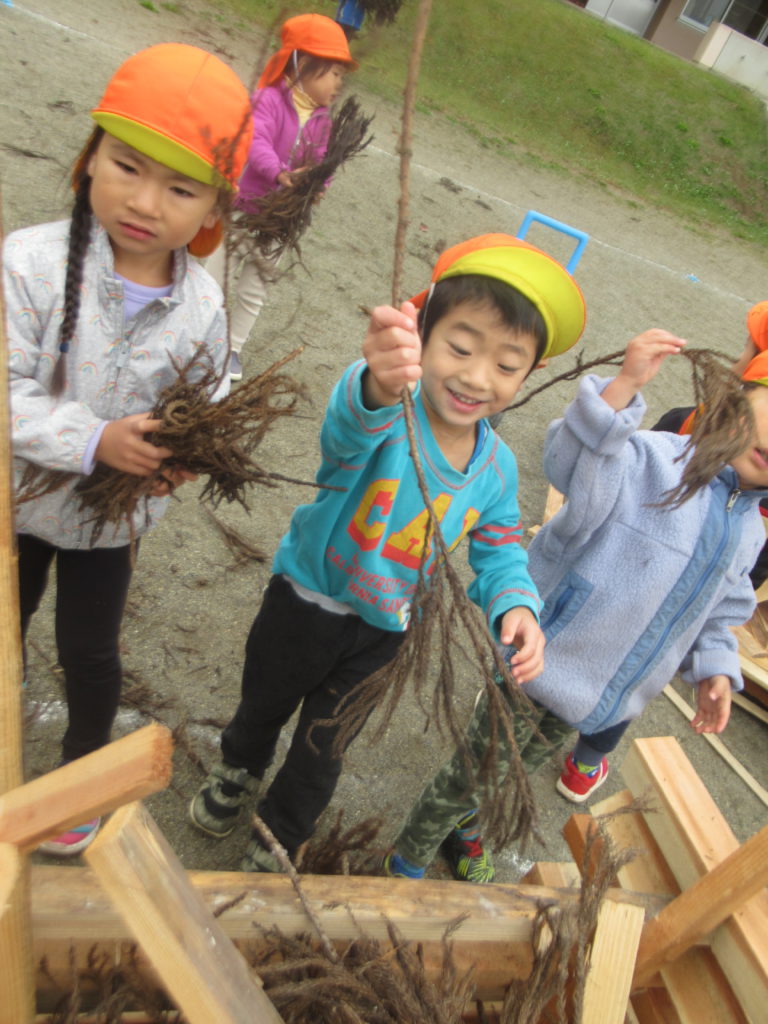 年長さんは自分たちで蔓から葉っぱを取り持ち帰りました。何に変身するか楽しみです。