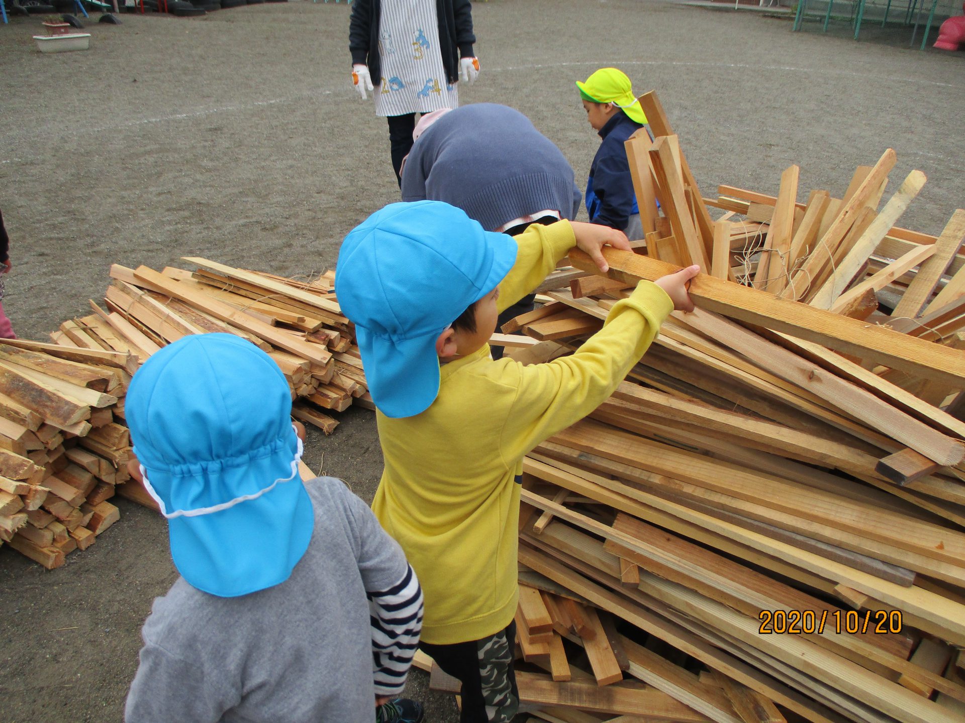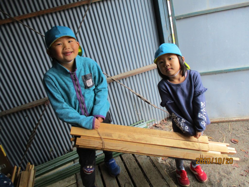 一方…年中、年少さんはやぐら作り。おいしい焼き芋を焼くために登園した子から、はりきって手伝ってくれました。