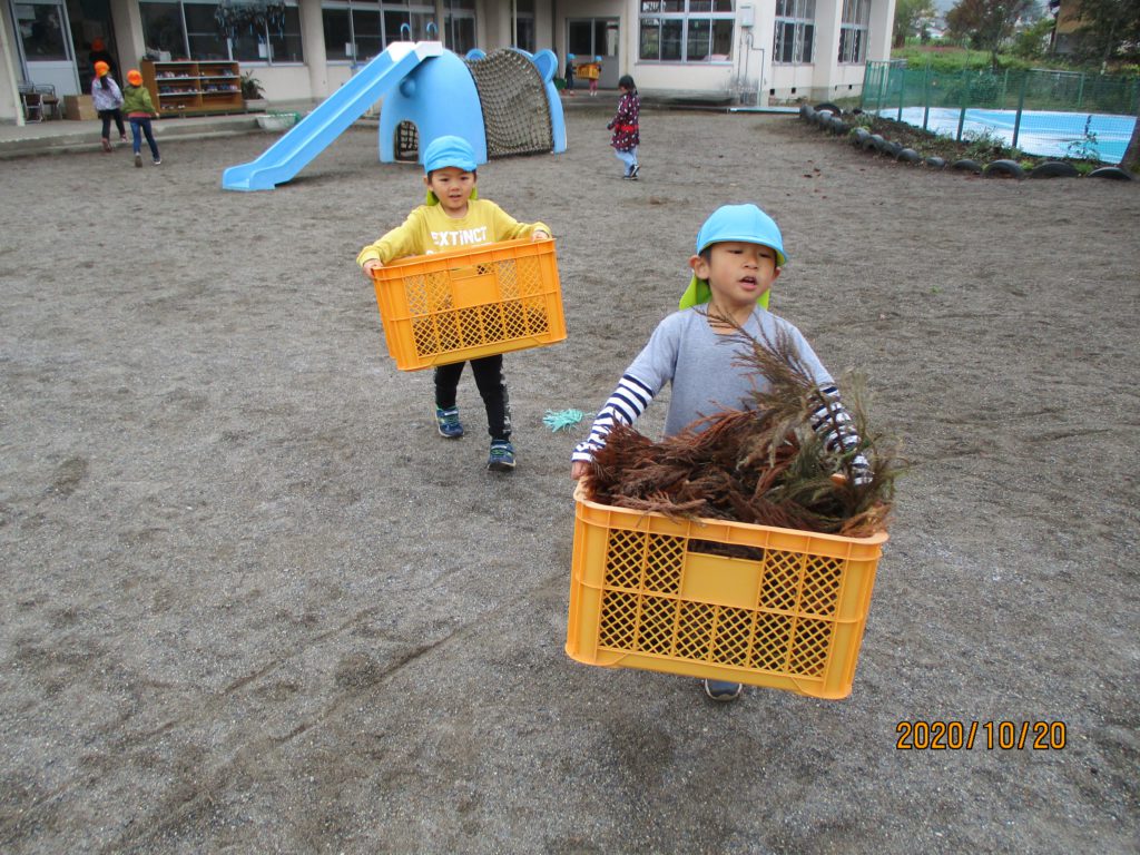 「やきいも会楽しみ!」と話していた子どもたちから、ある日‥「やきいも会には葉っぱが必要だよね?」と声が上がりました。昨年、杉の葉を集めて燃やしたのを思い出したのです。