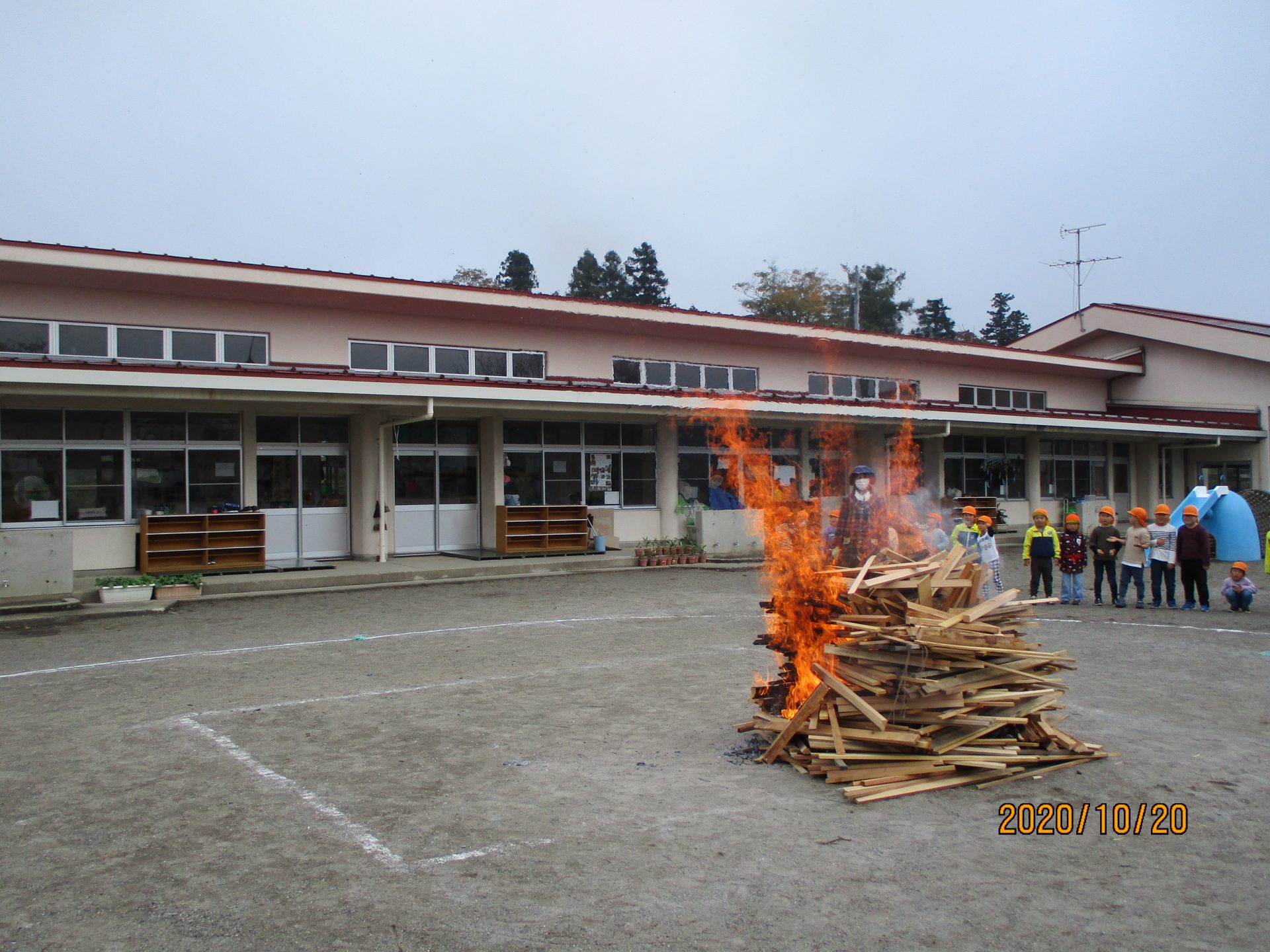 いつもは見ることのない大きな炎が園庭で燃えるのを、色々な表情で見つめていた子どもたち。