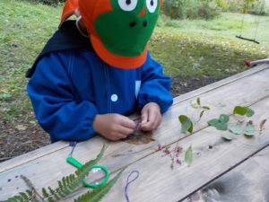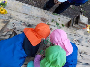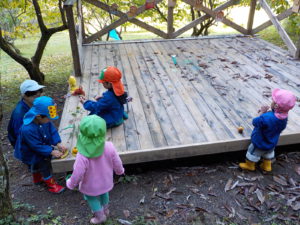 ・運動会も終わり、裏山でじっくり虫眼鏡を持って観察するのは久しぶりでした。一人が発見すると未満さんも駆けつけて、見せて見せてと虫眼鏡を取り出します。大きい人を真似する姿は可愛らしく微笑ましいです。
