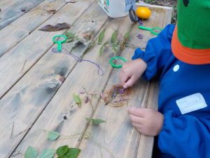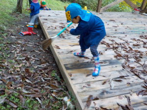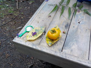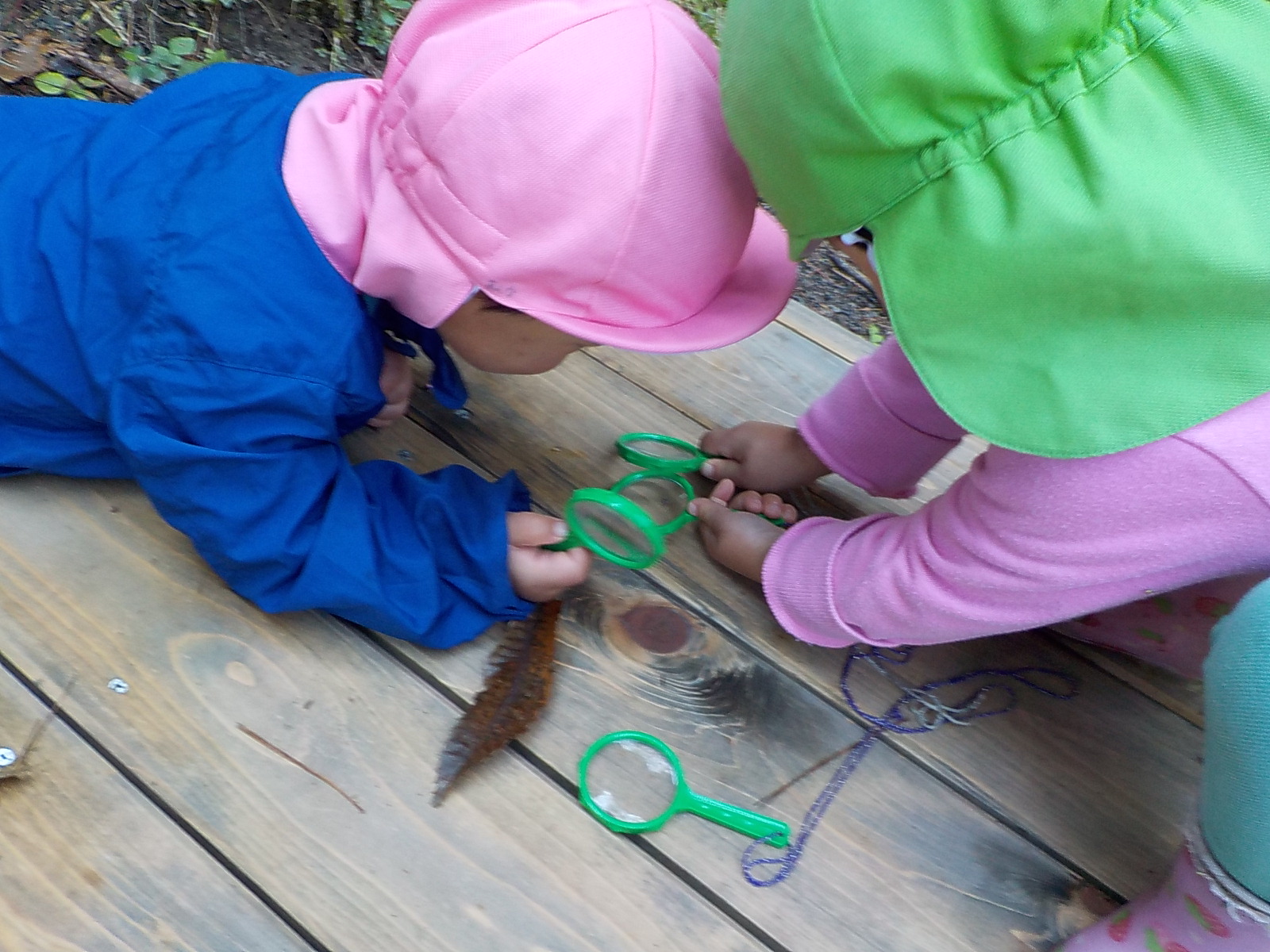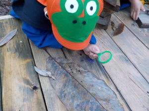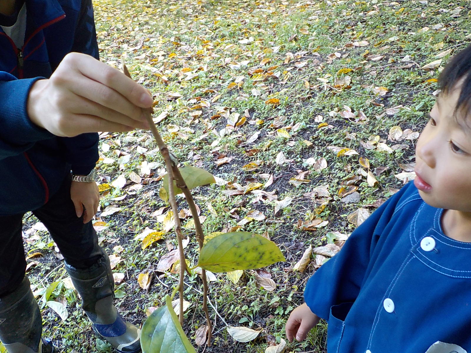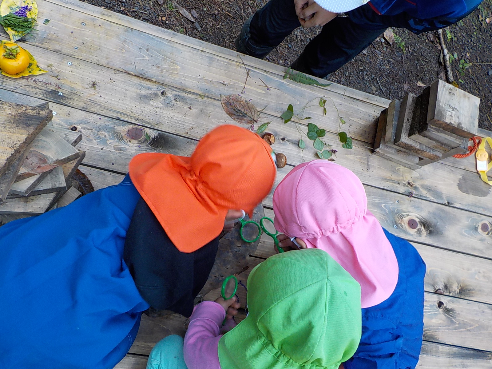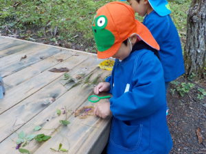・運動会も終わり、裏山でじっくり虫眼鏡を持って観察するのは久しぶりでした。一人が発見すると未満さんも駆けつけて、見せて見せてと虫眼鏡を取り出します。大きい人を真似する姿は可愛らしく微笑ましいです。