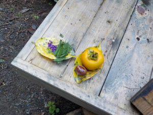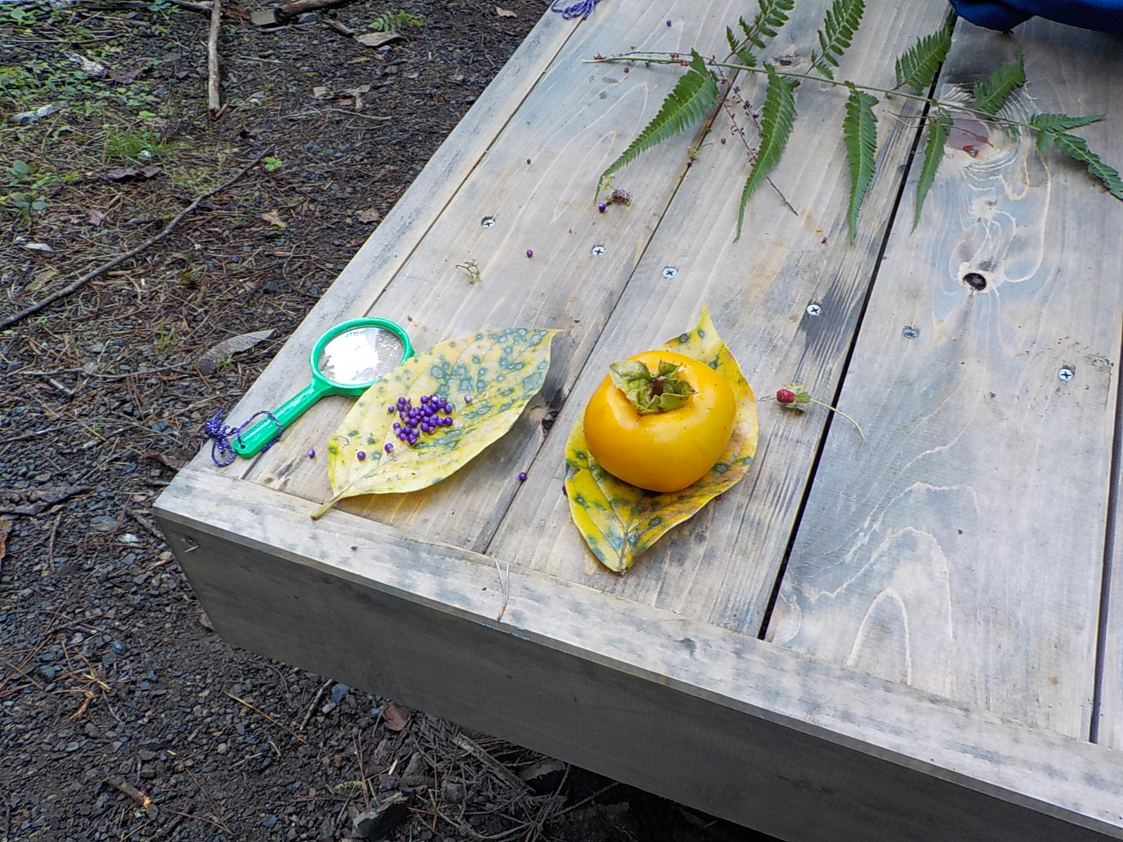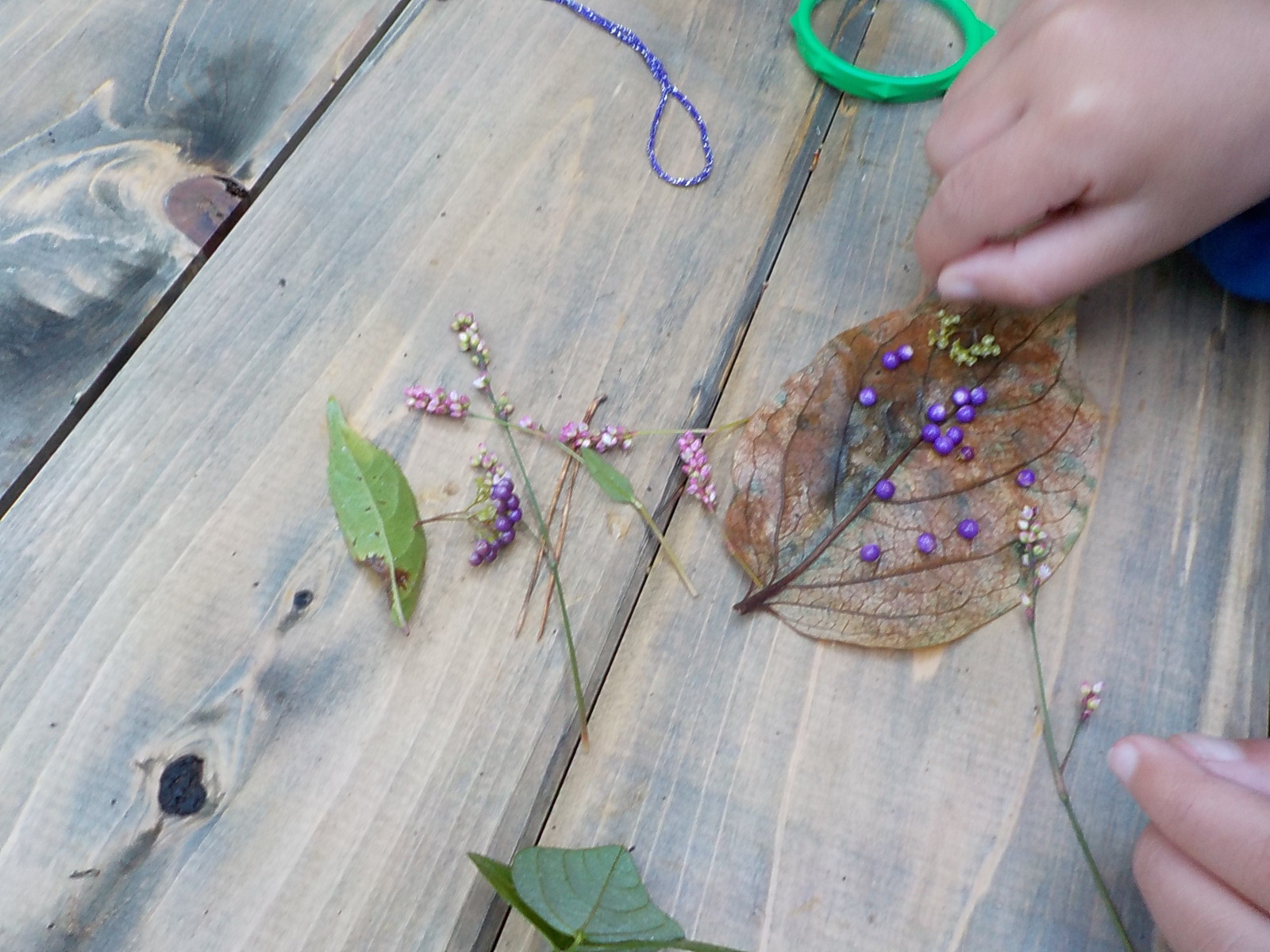 ムラサキシキブの実とイヌダテがたくさんとれました。何を作っているのかな。