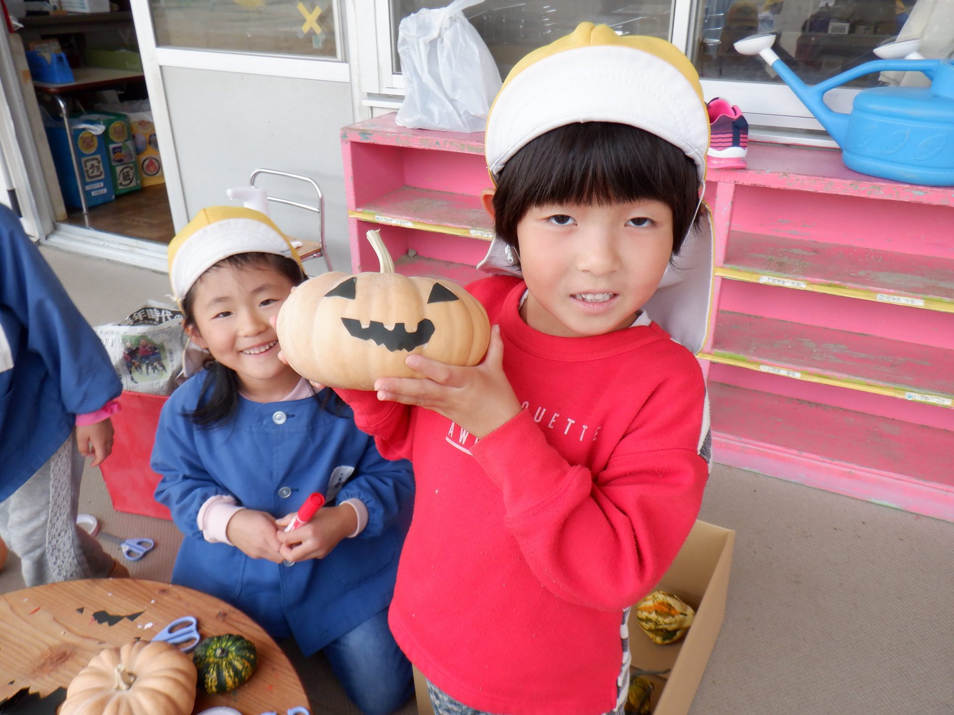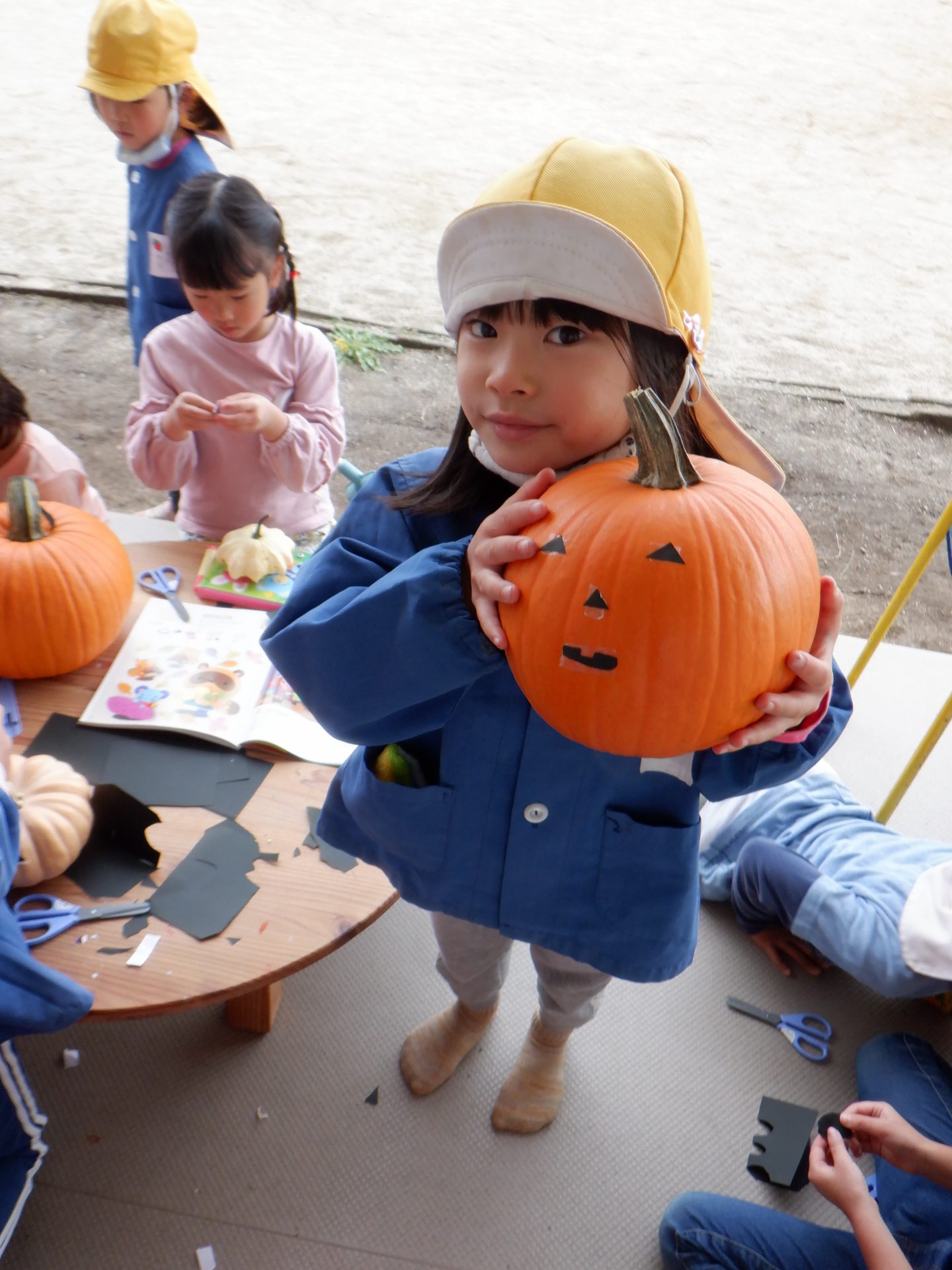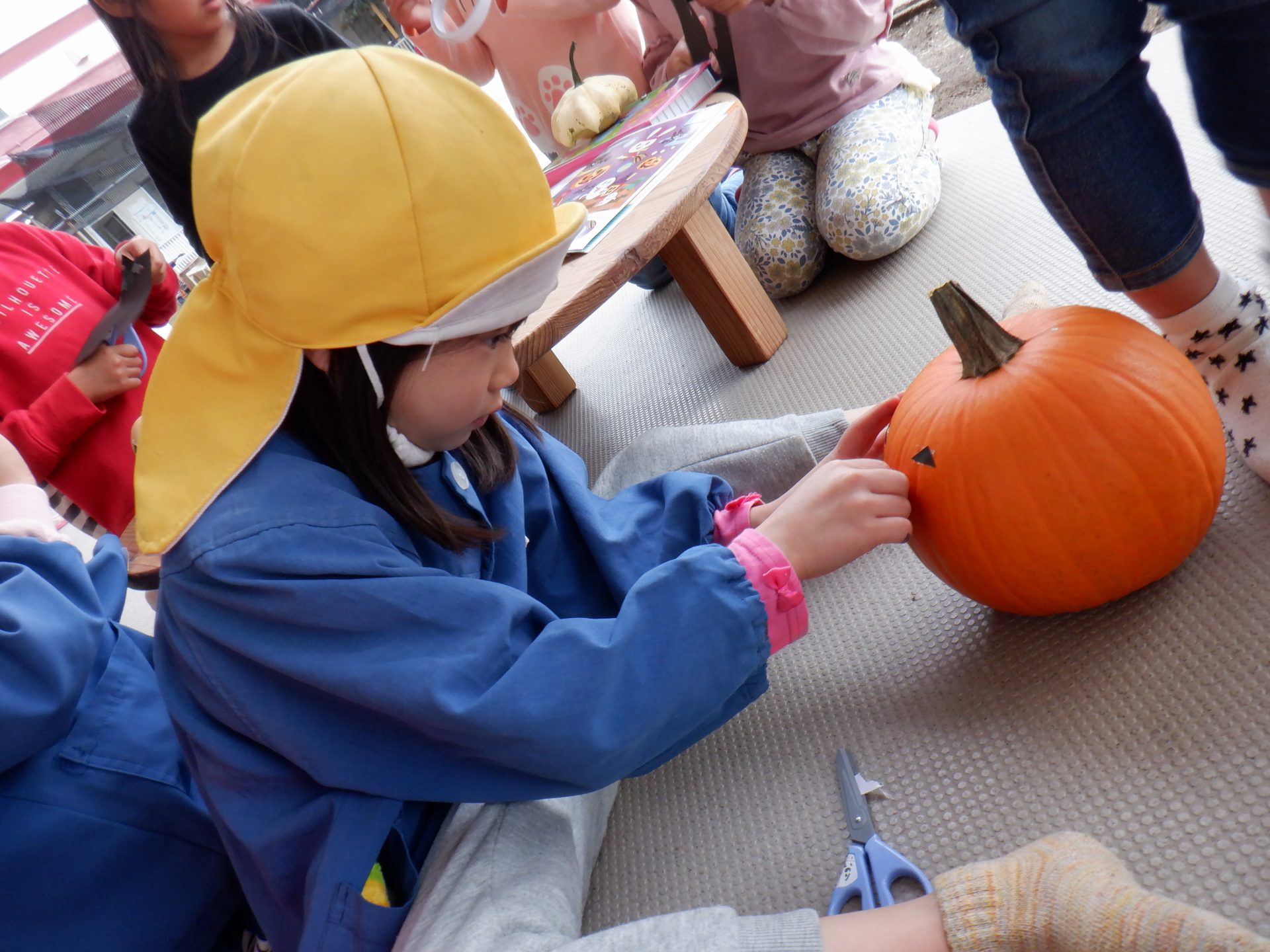 「なにしてるの?」とのぞきにきた男の子「ハロウィンのかぼちゃだよ。」と答える女の子たち!
