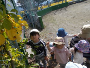 「なんかあるー!」と黄色い実を見つけ、お友だちや先生たちに教えてくれる子どもたち。