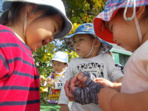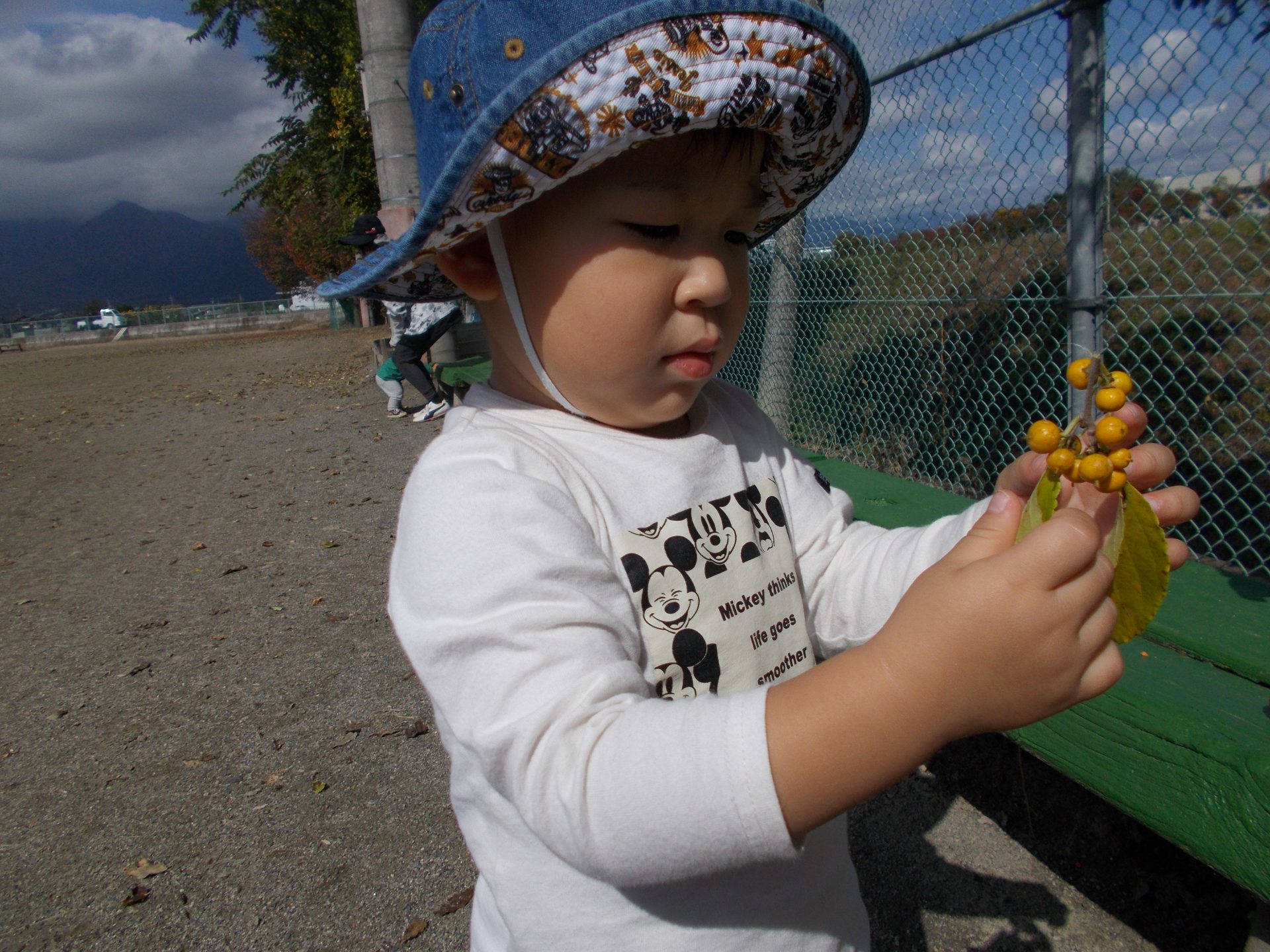 木の実を摘んだり、割って中身を出してみたり、枝いっぱいについている実を一つひとつ分けてみたり、「お母さんにお土産」と袋に入れて持って帰る子もいました。