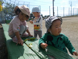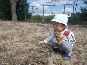 「あったよ!」というように見つけたものを見せてくれたり、クモの糸に引っかかった葉っぱを見つけて不思議そうに見たり触ろうとしたり、長く伸びた枯れ草を倒してふみきりに見立ててあそんだり、いろんな発見をした子どもたちでした。
