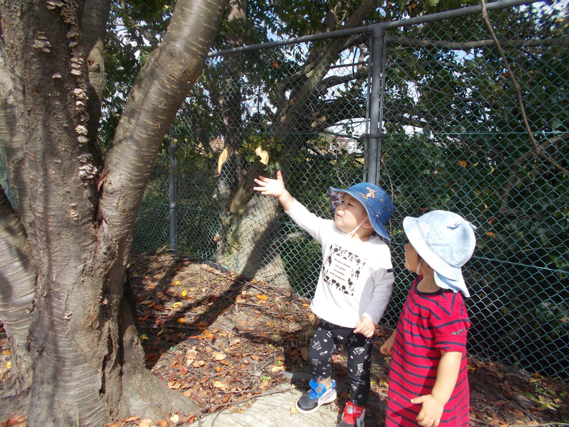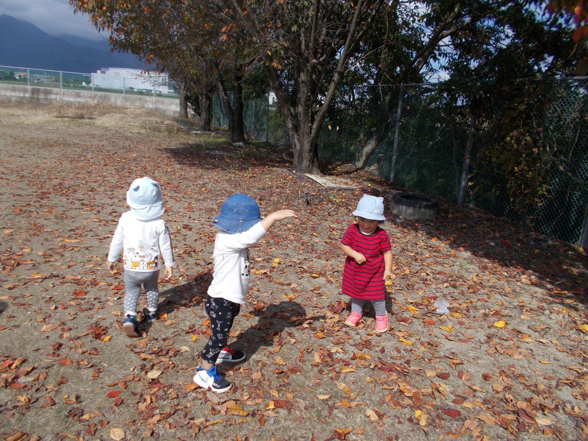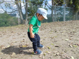 クシャクシャと落ち葉を踏む音を楽しんだり、かき集めて落ち葉のシャワーを浴びたりしていっぱいあそびました。