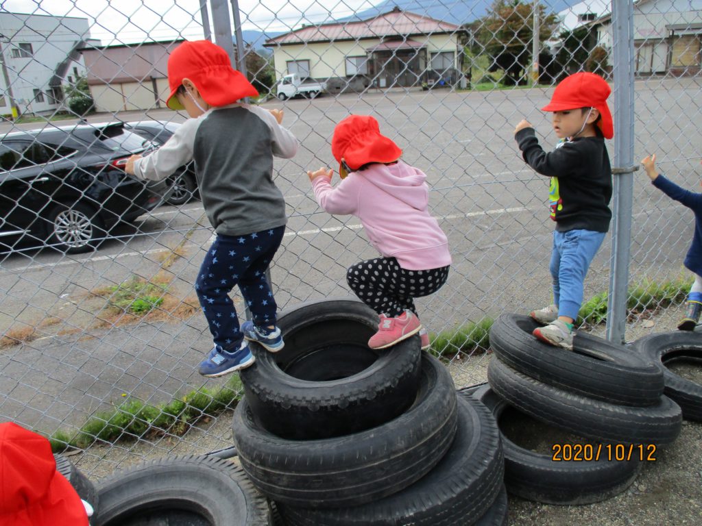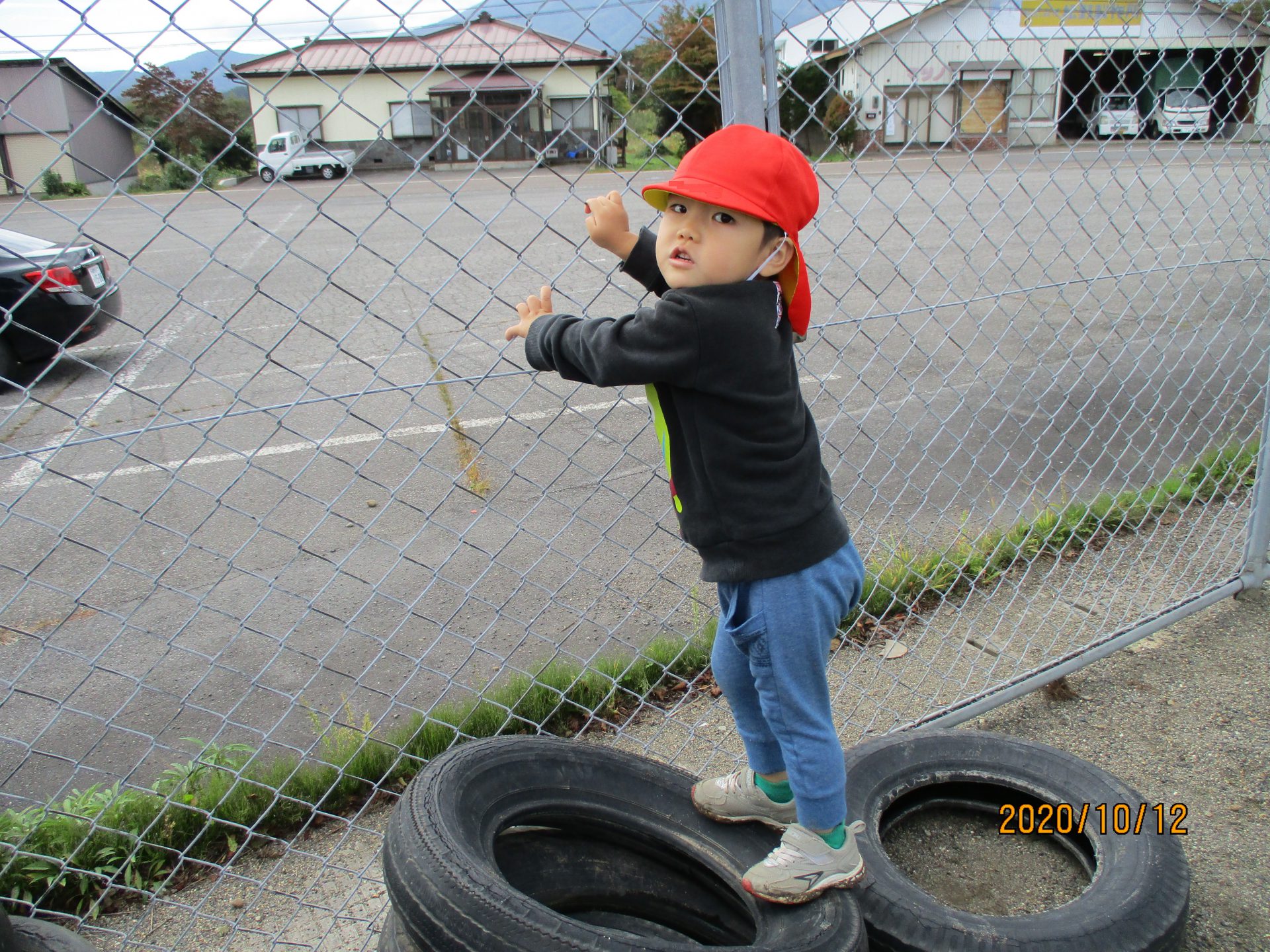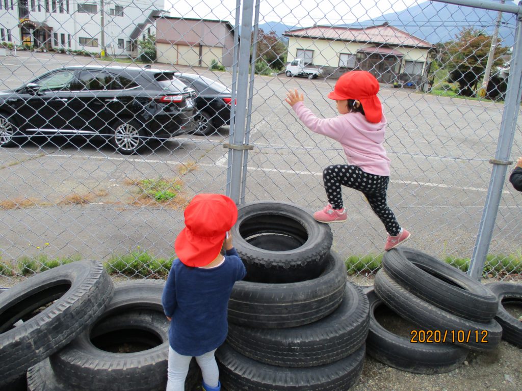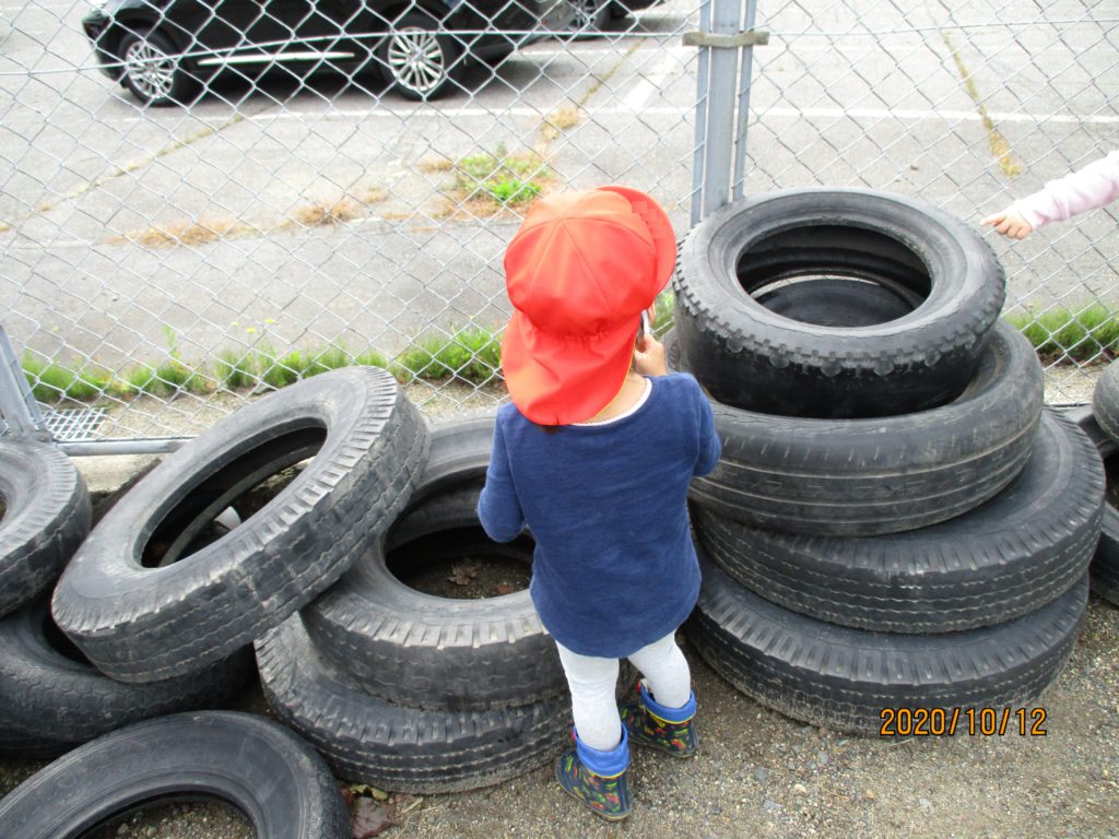 さて、園庭の別のところでは違う遊びを楽しむお友達の姿がありました。積んであるタイヤの上を進みます。