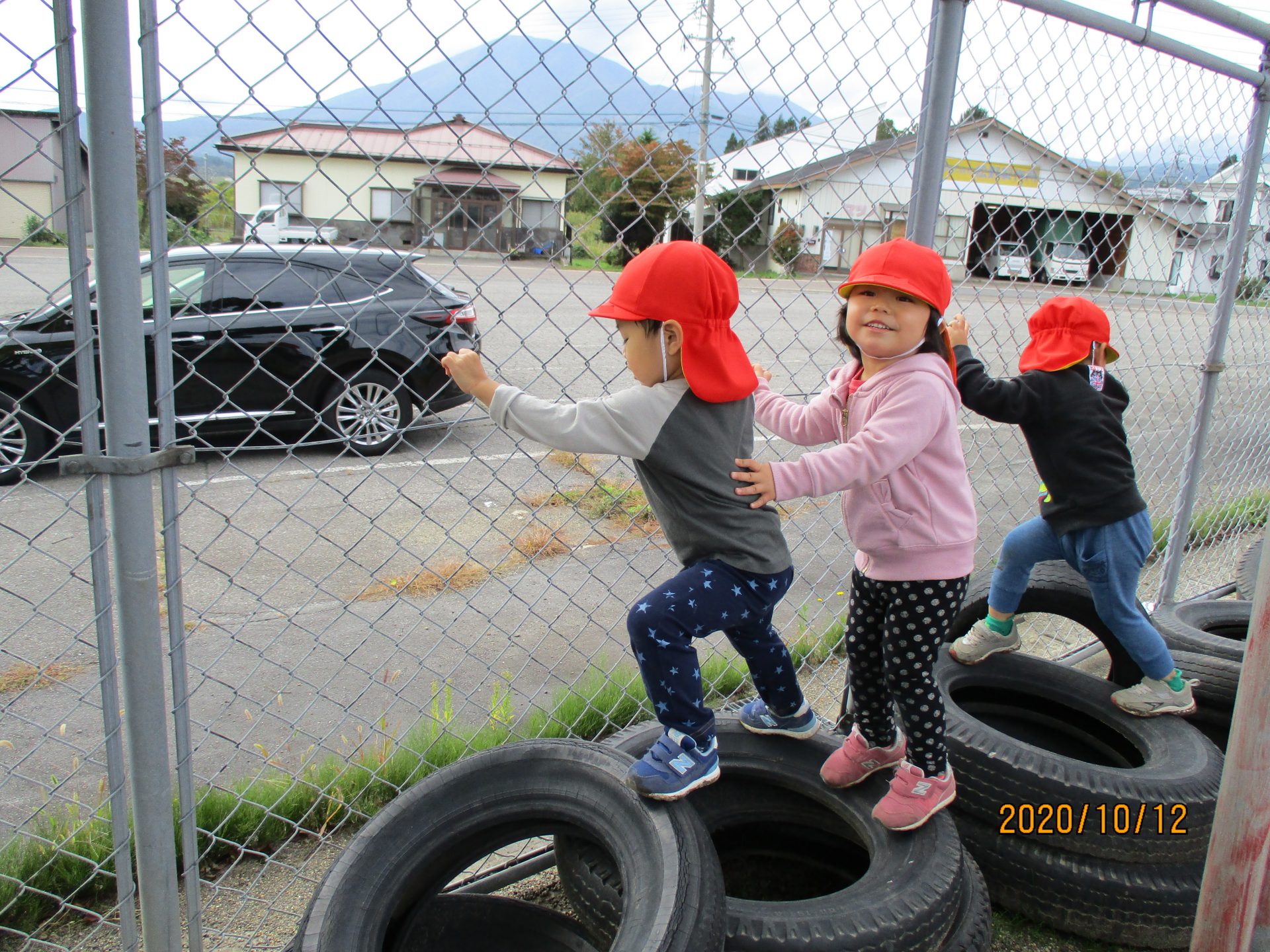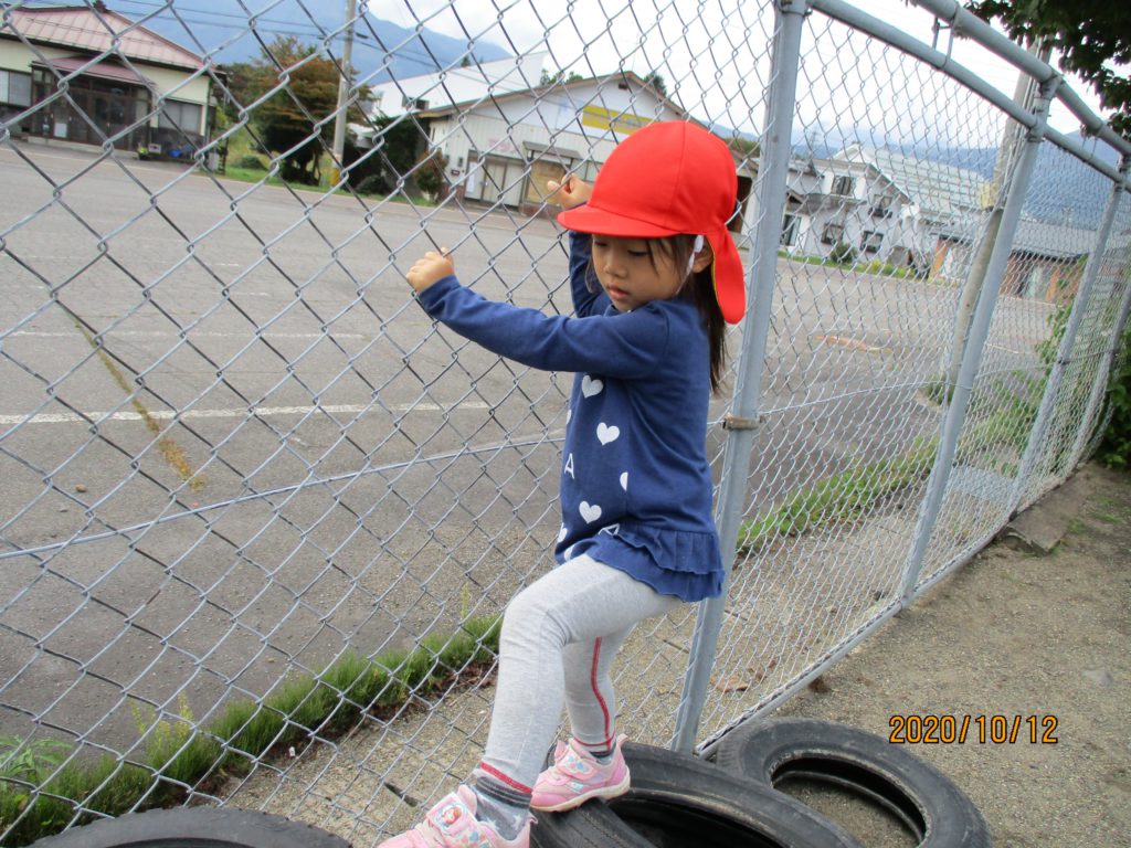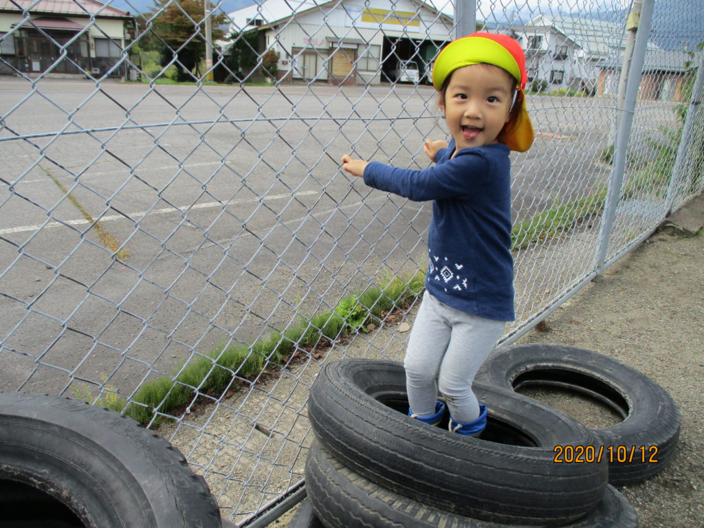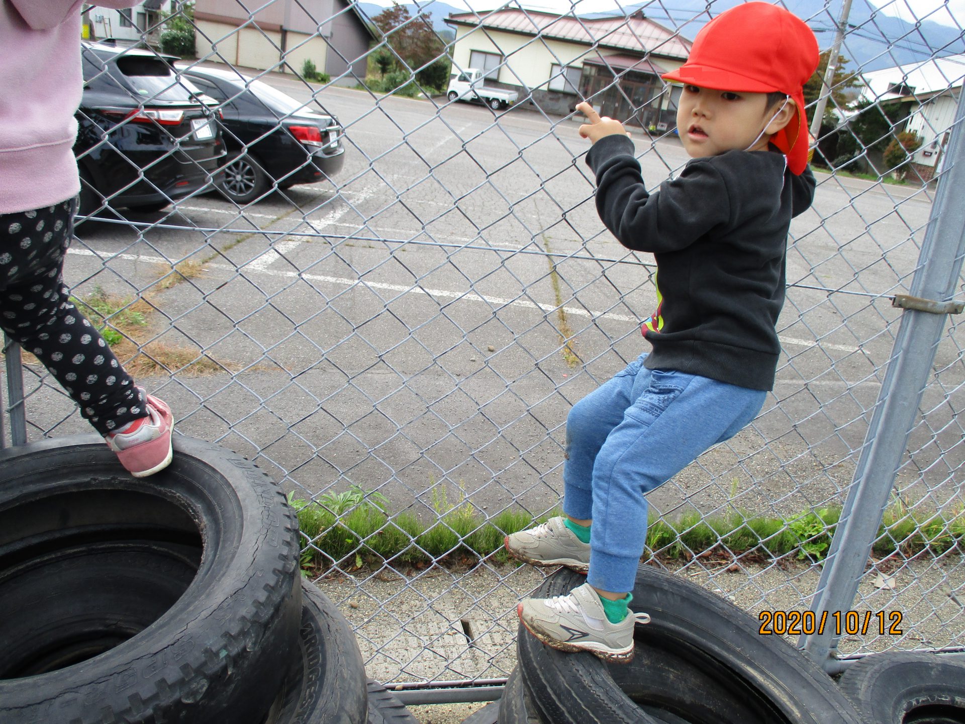 さて、園庭の別のところでは違う遊びを楽しむお友達の姿がありました。積んであるタイヤの上を進みます。