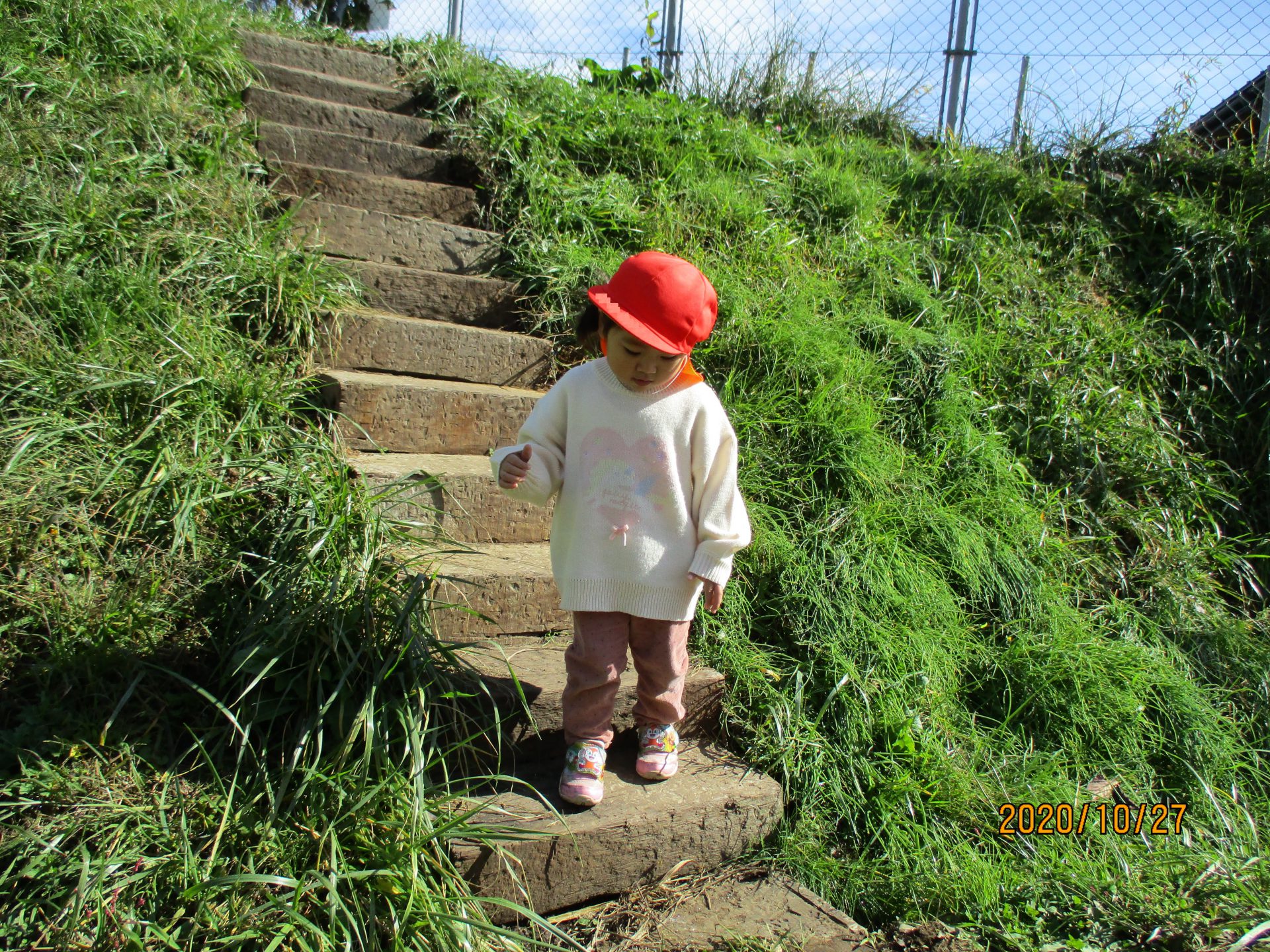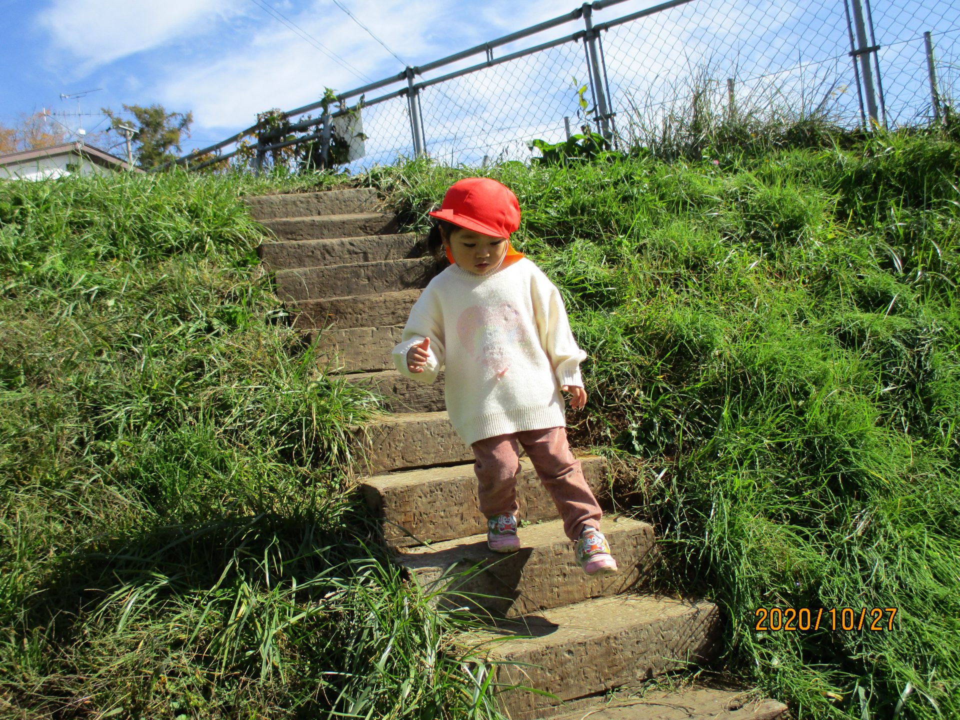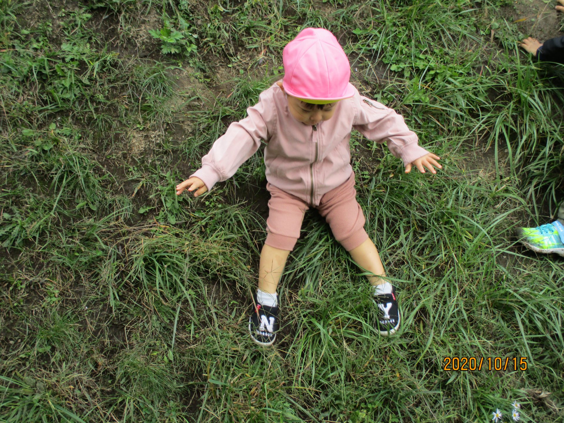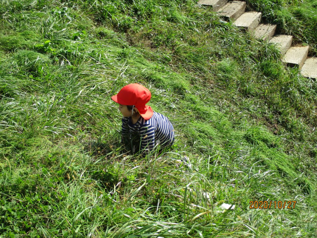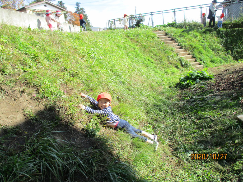 「すべっちゃう〜」といいながらお腹でズリズリ滑り落ちることが楽しくなったようです。土手のぼりから腹すべり!?新しい遊びを発見して嬉しそうです。