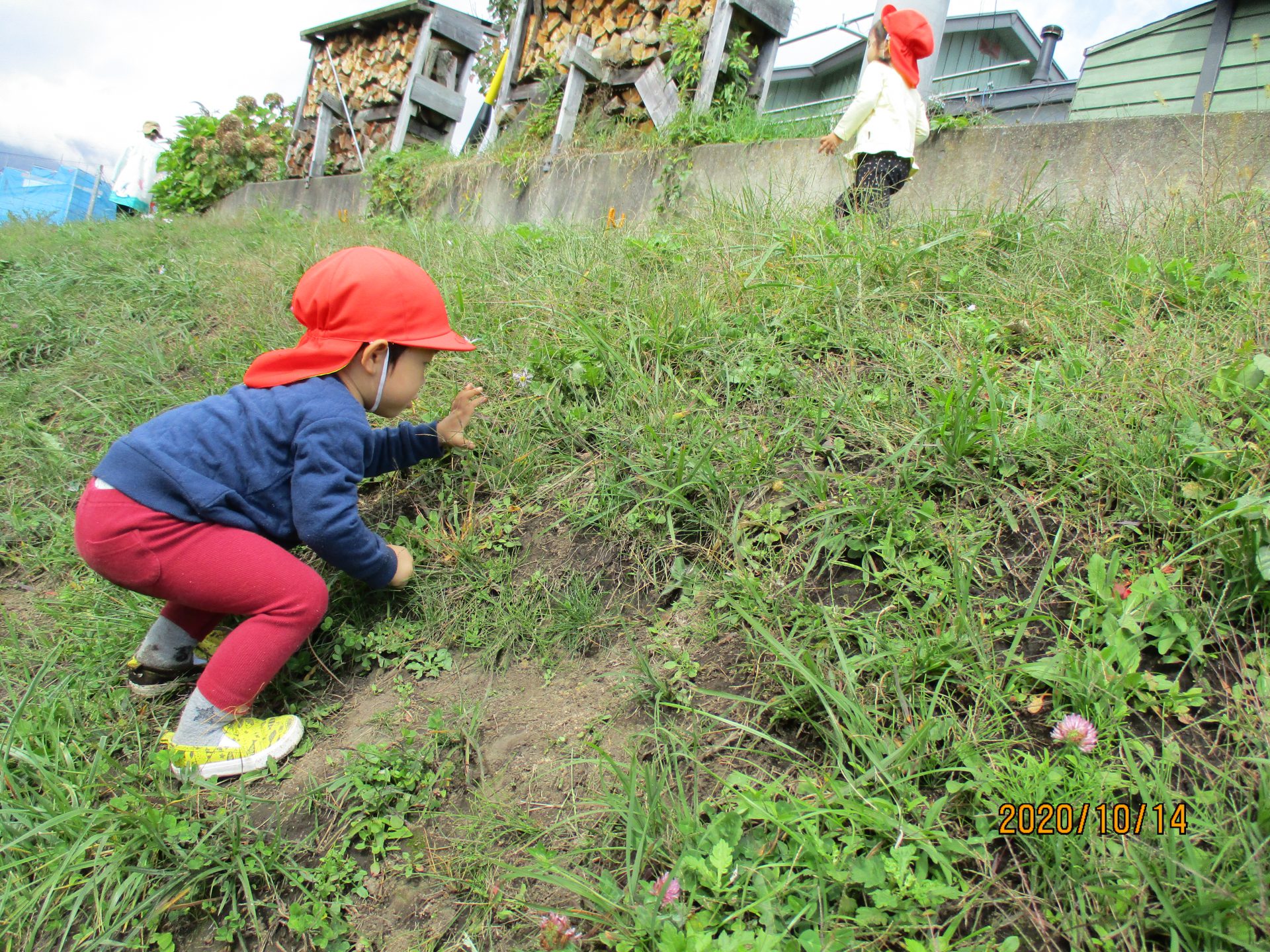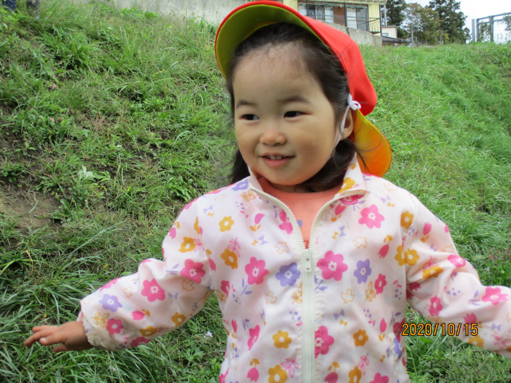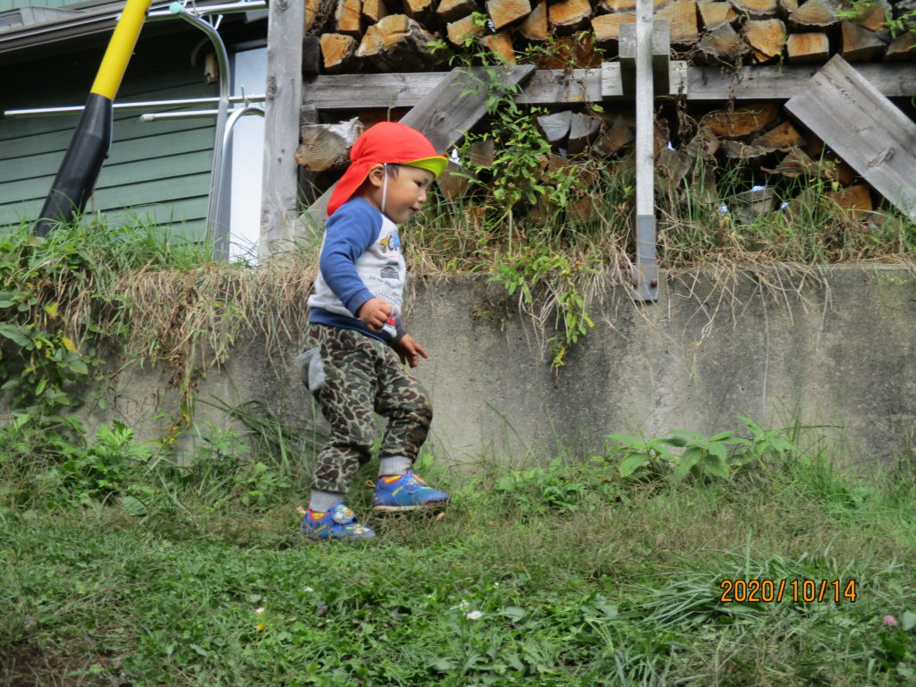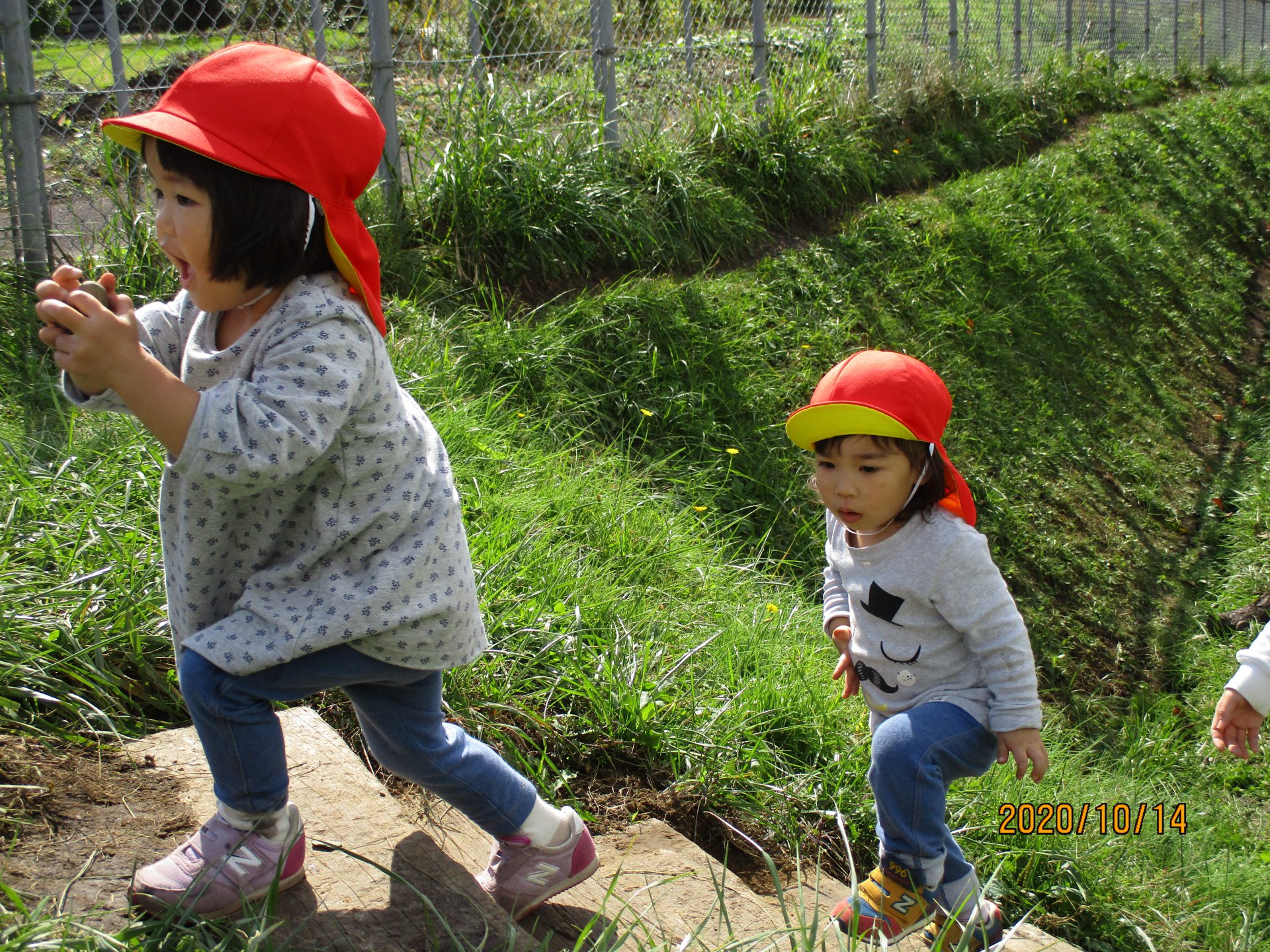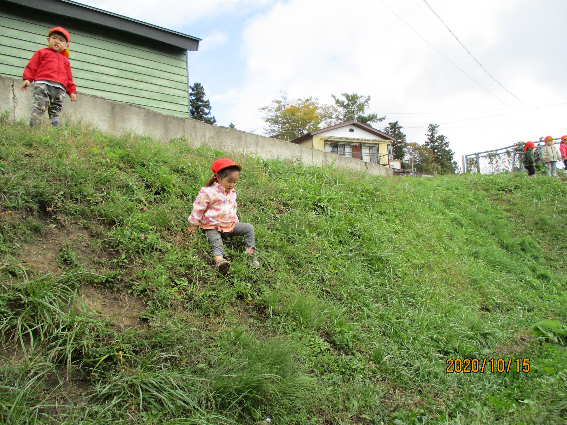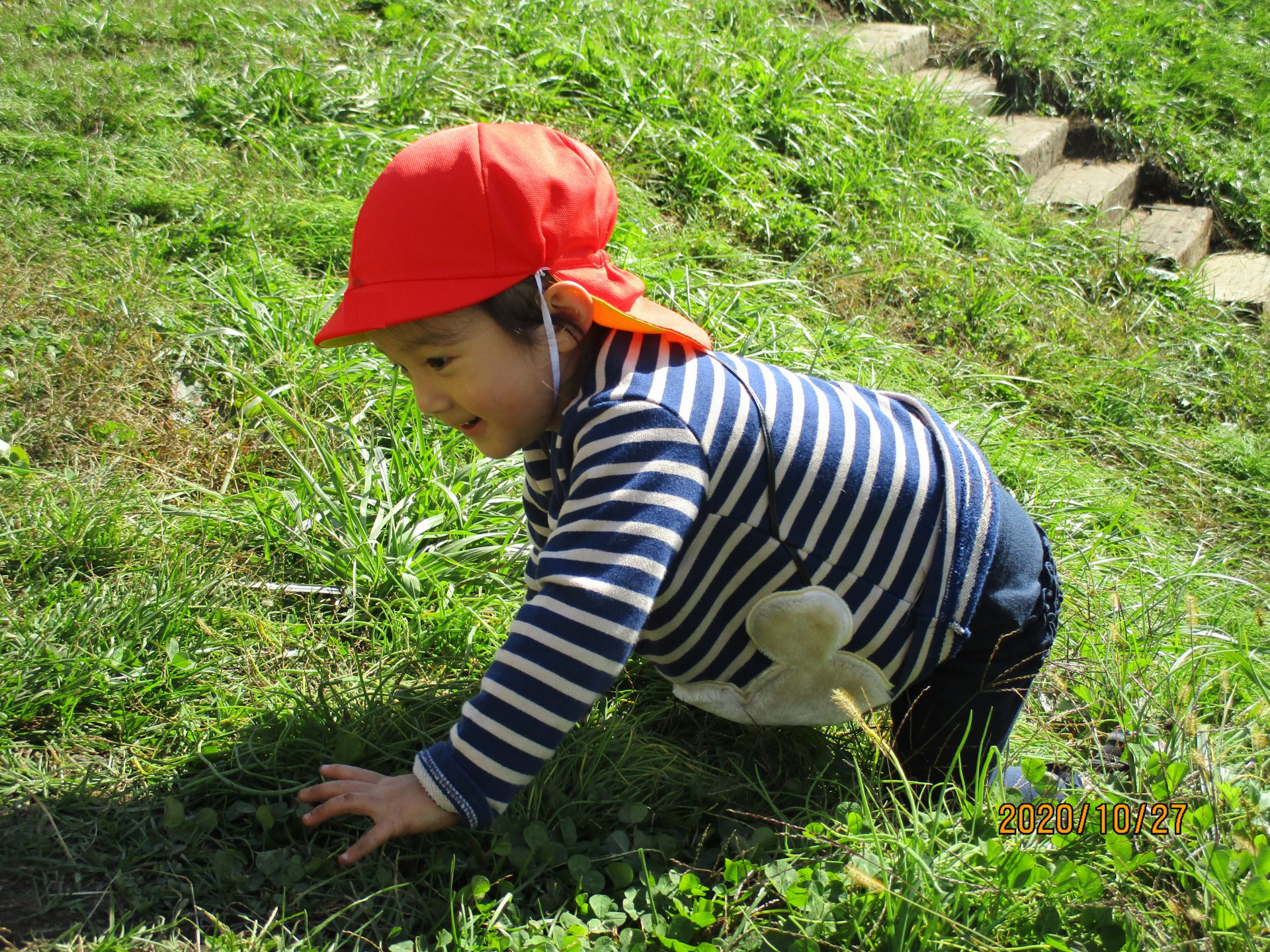 「すべっちゃう〜」といいながらお腹でズリズリ滑り落ちることが楽しくなったようです。土手のぼりから腹すべり!?新しい遊びを発見して嬉しそうです。