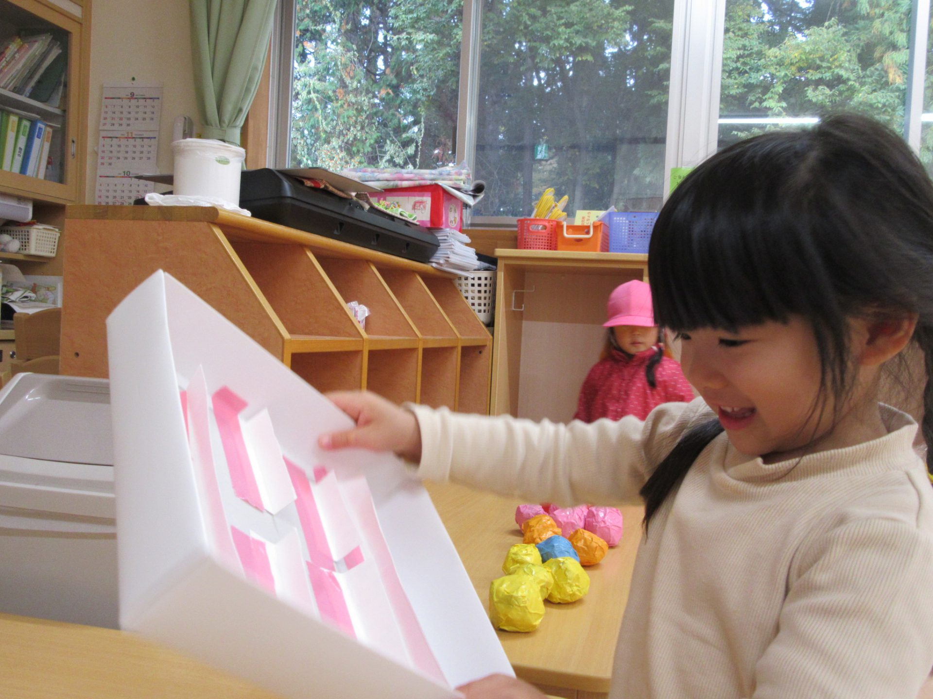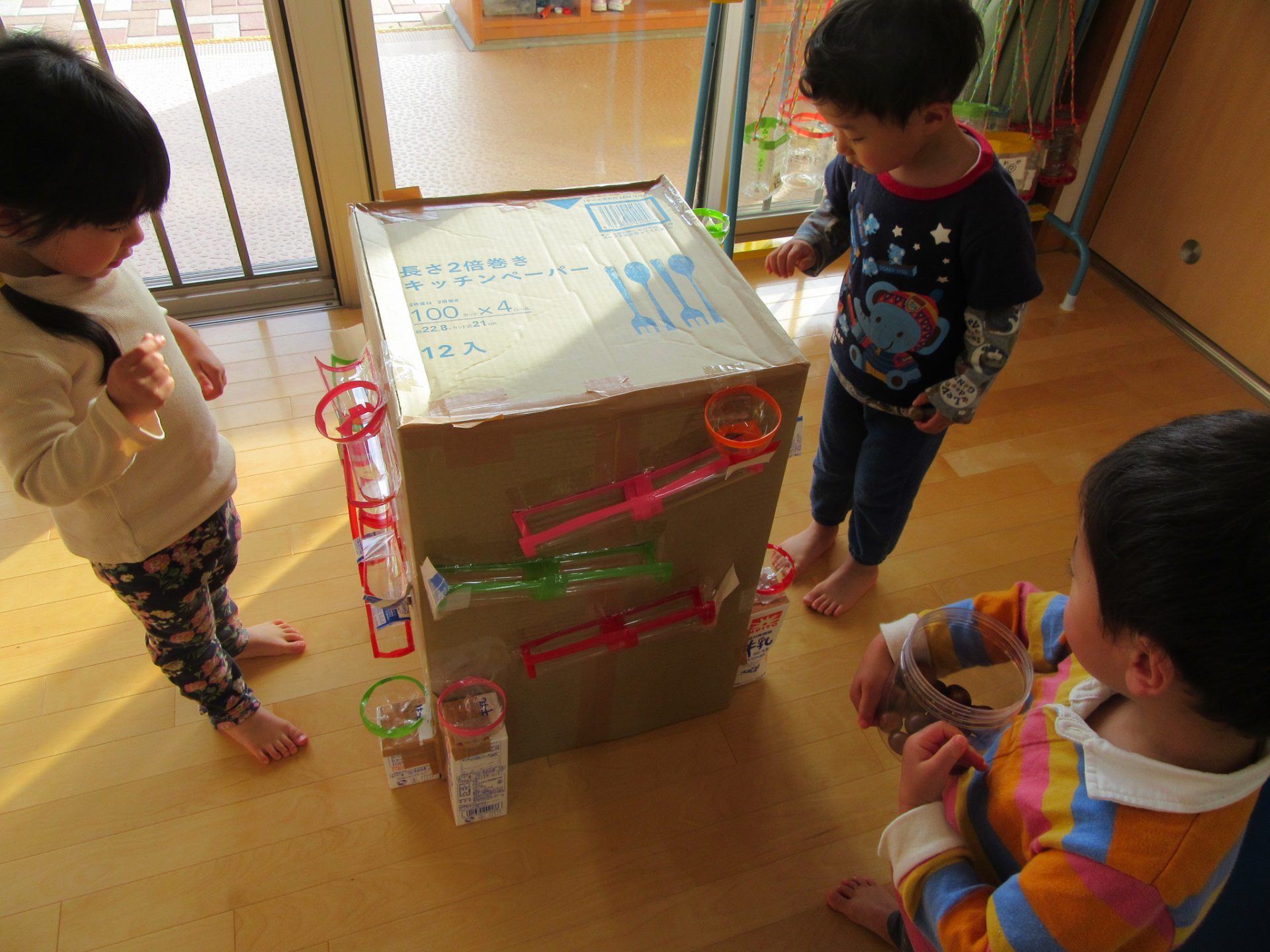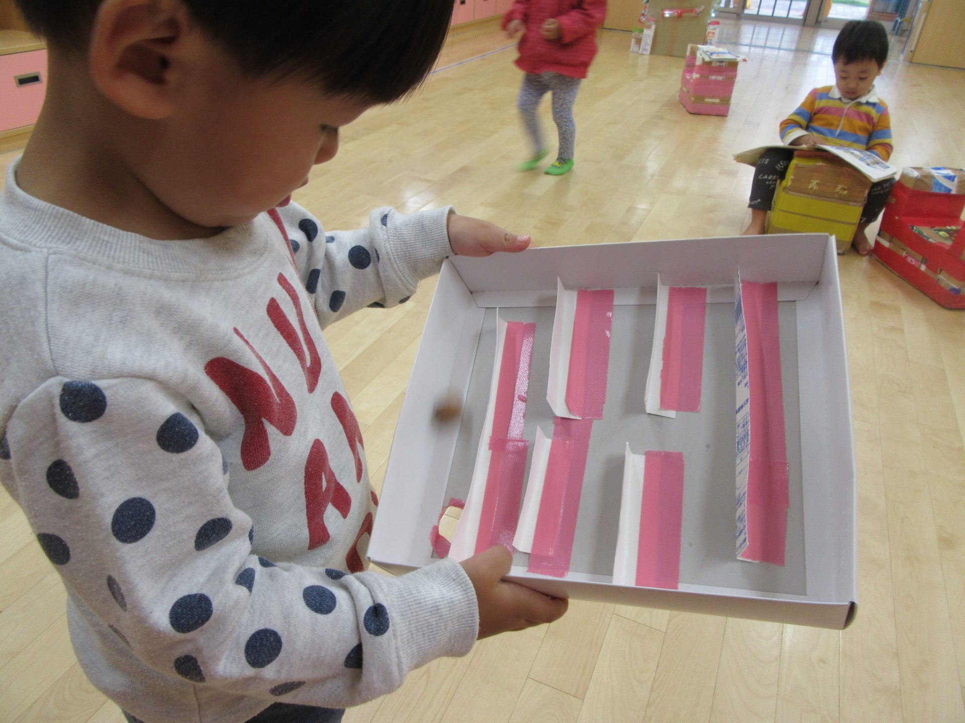 今度は紙の箱の中で…どんぐり迷路だぁ!