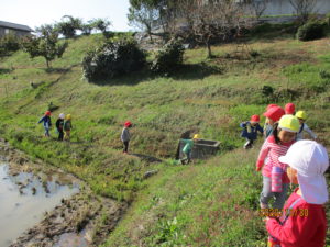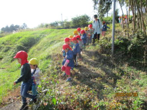・年少児と年中児が長清寺まで散歩に出かけました。いつも歩く道路ではなく、今回は田んぼのあぜ道にチャレンジ!