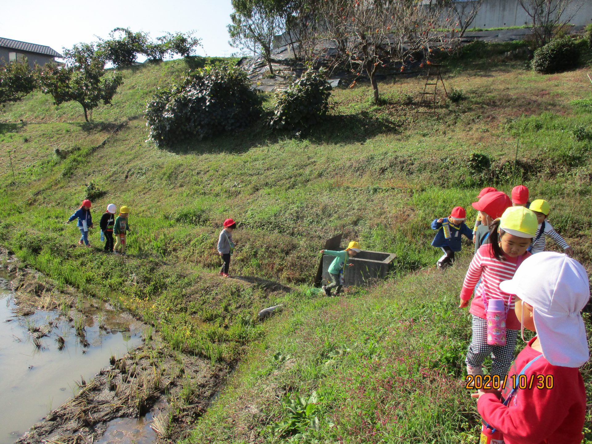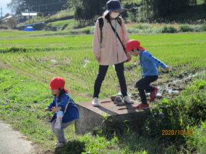 ・田んぼのあぜの細い道、手をつないでいる4歳児が3歳児に「ゆっくりでいいよ。」と声をかけます。