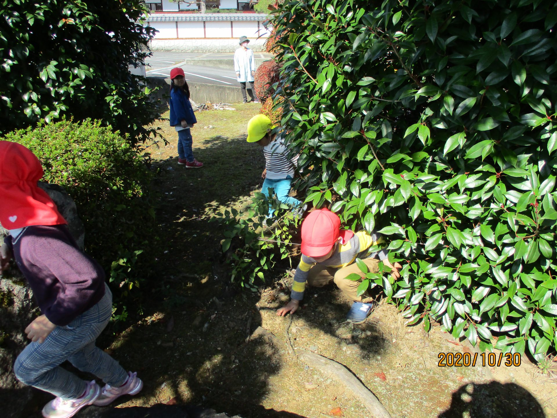 広いお寺のお庭の植木や石の間を使ってかれくんぼ!3歳児も4歳児も一緒になって遊びます。