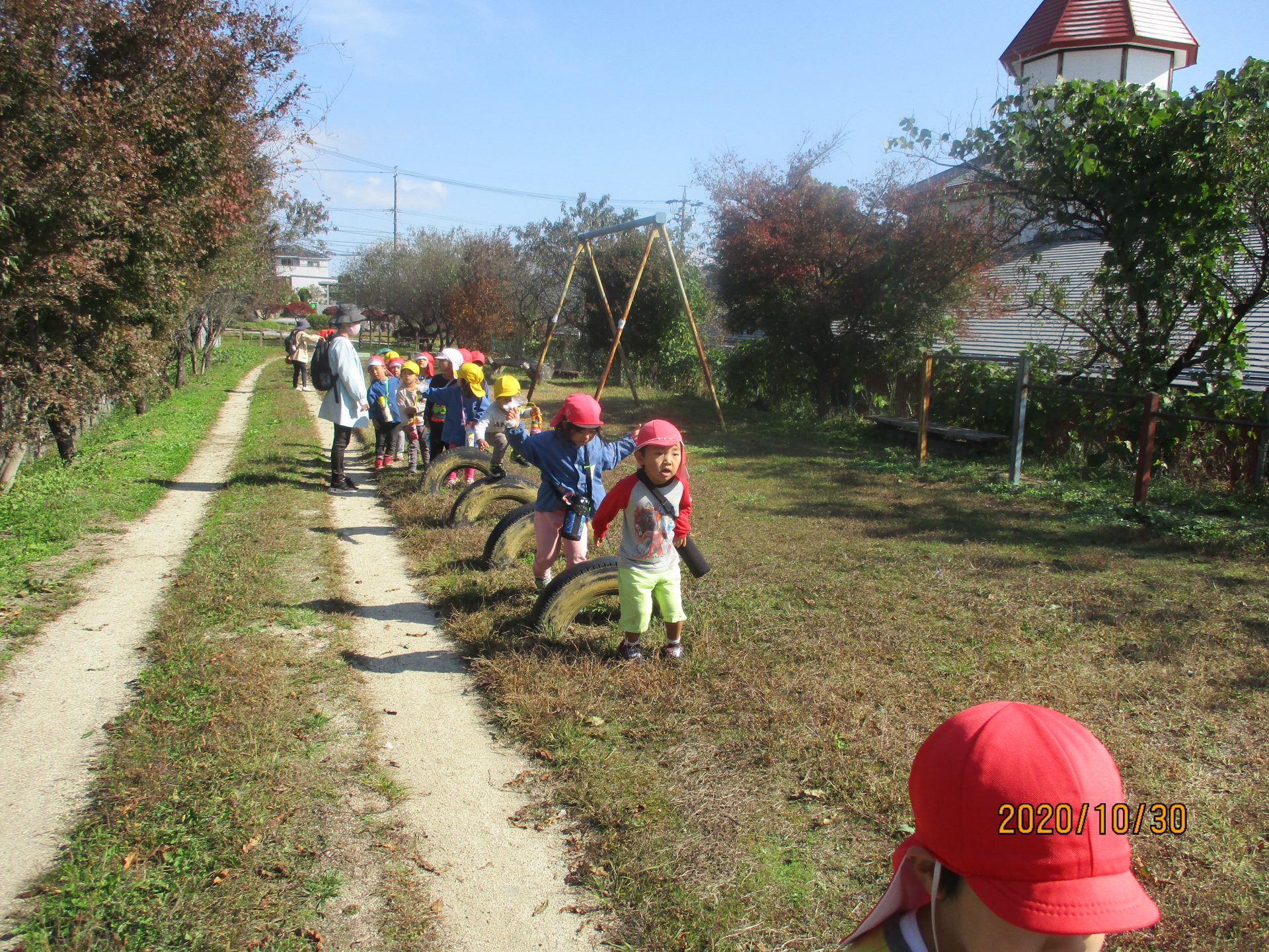 帰り道は遠回りをしておひさま公園を通った。タイヤのジャンプなど「やってみよう。」と思って挑戦できるコースを歩くことができたと思う。