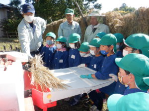 機械に興味を持つ子もいて籾が袋にたまっていくところを見ている子もいた。