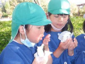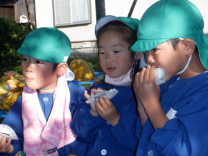 仕事が終わった頃に園長がおむすびを作り持ってきて大喜び。先の米がおむすびになっていることに喜び、食べたら「なんかいつもよりおいしい」「甘い?」と言い、少しずつ味わう子、一気に食べておかわりをゆっくり食べる子といた。